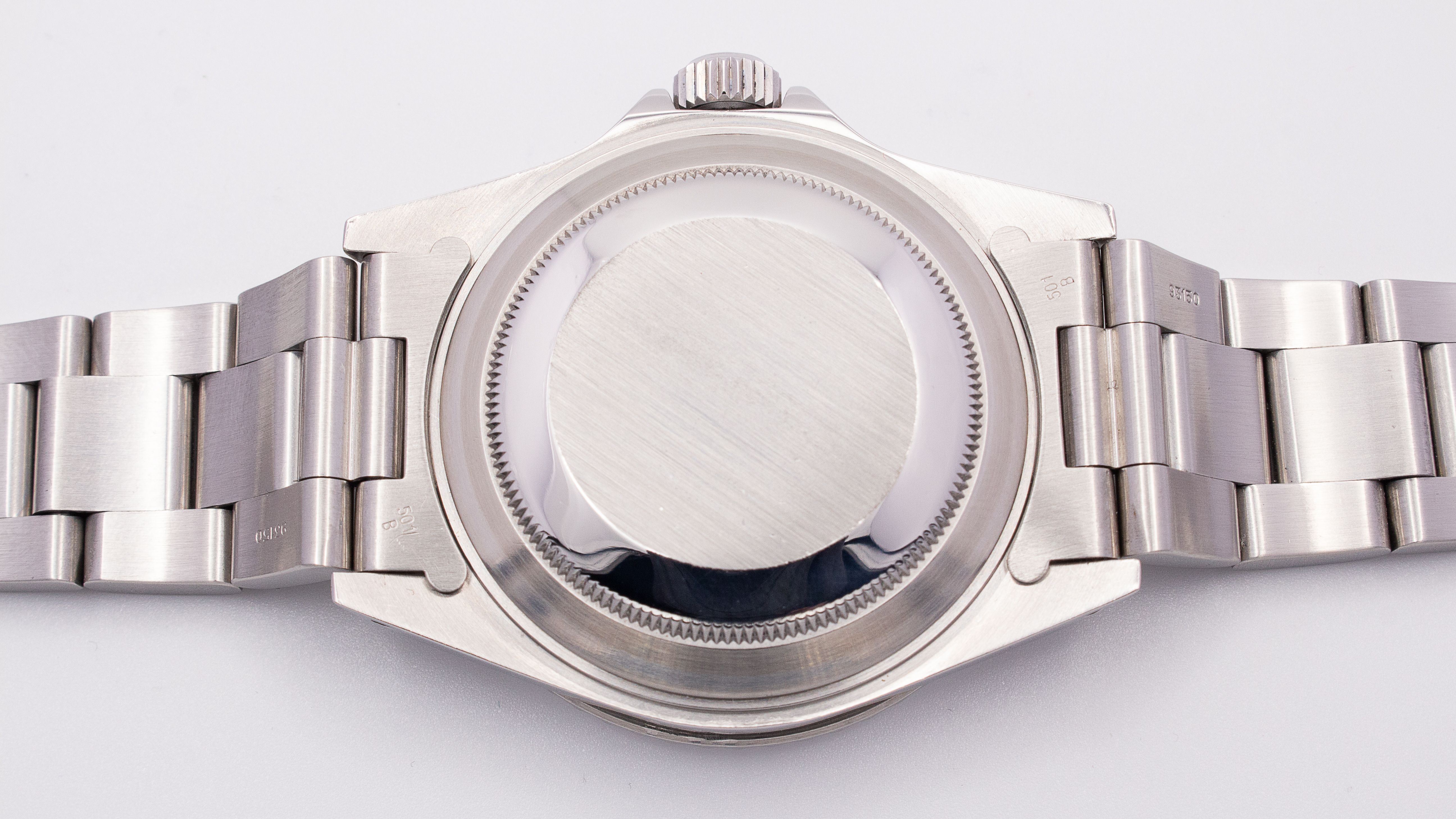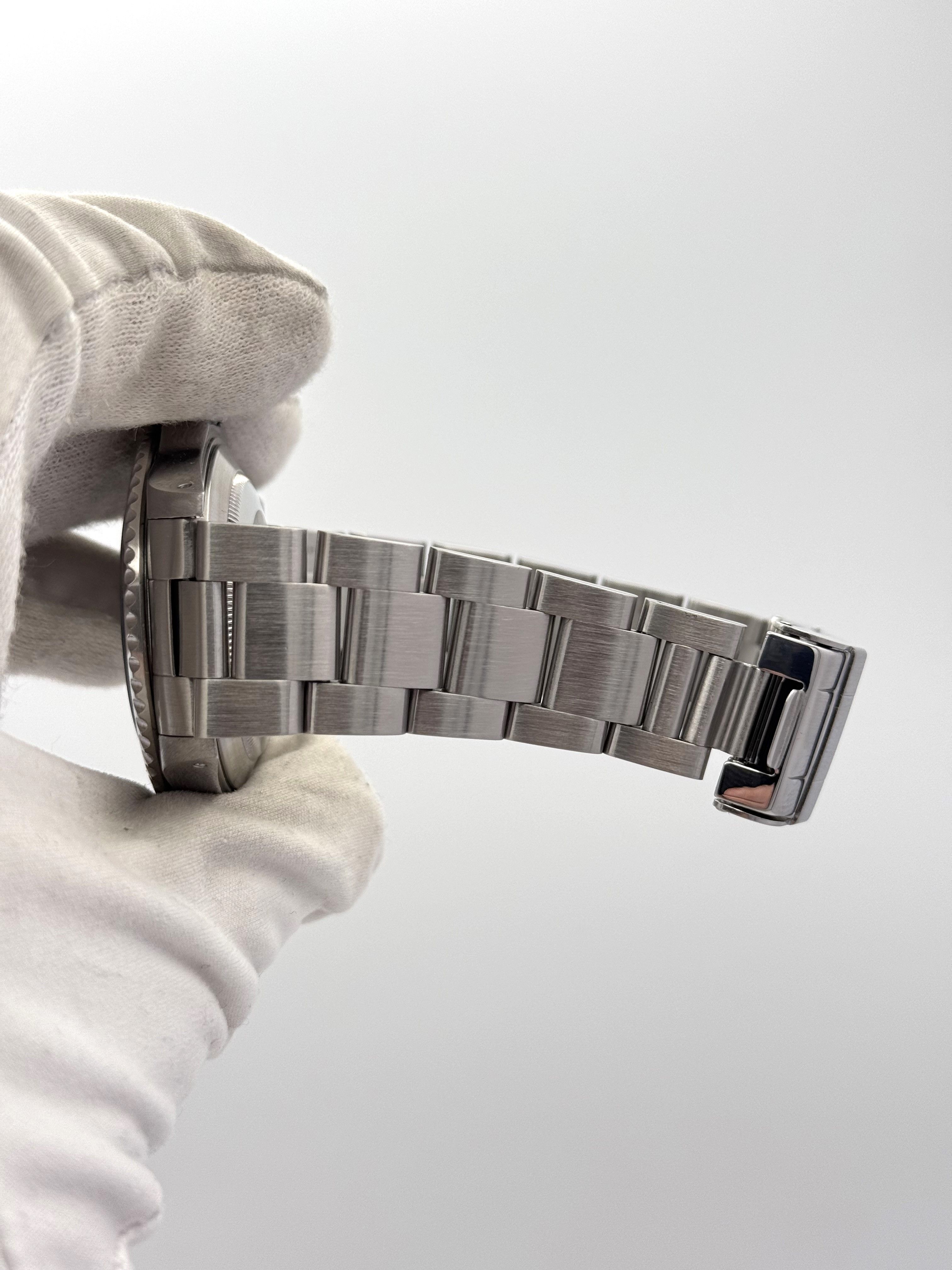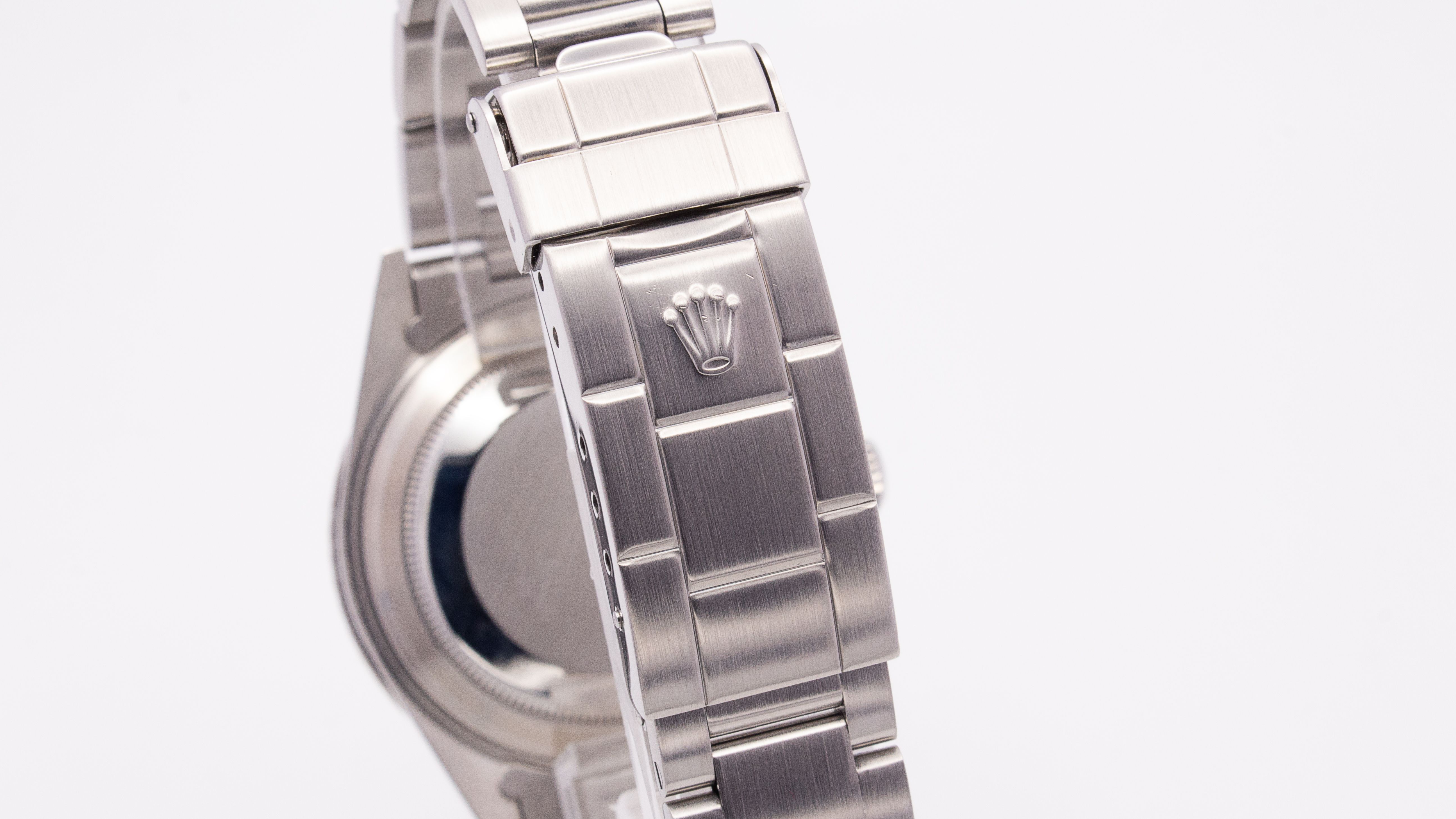De Oyster-bracelet (Ref. 93150) met bijpassende 501B eindlinks is eveneens in zeer goede staat. De typische rek door ouderdom en constructie is slechts minimaal. De huidige lengte is geschikt voor polsen tot ongeveer 19 cm. De lichte gebruikssporen op de sluiting zijn bewust niet volledig gepolijst om de nog zeer goed behouden geperste Rolex-kroon niet te beschadigen. De randen van de bracelet zijn duidelijk en scherp, wat wijst op een zorgvuldige behandeling en een grotendeels ongerepte staat. De duikverlenging klikt soepel in en blijft stevig zitten, zonder speling of uitrekken.