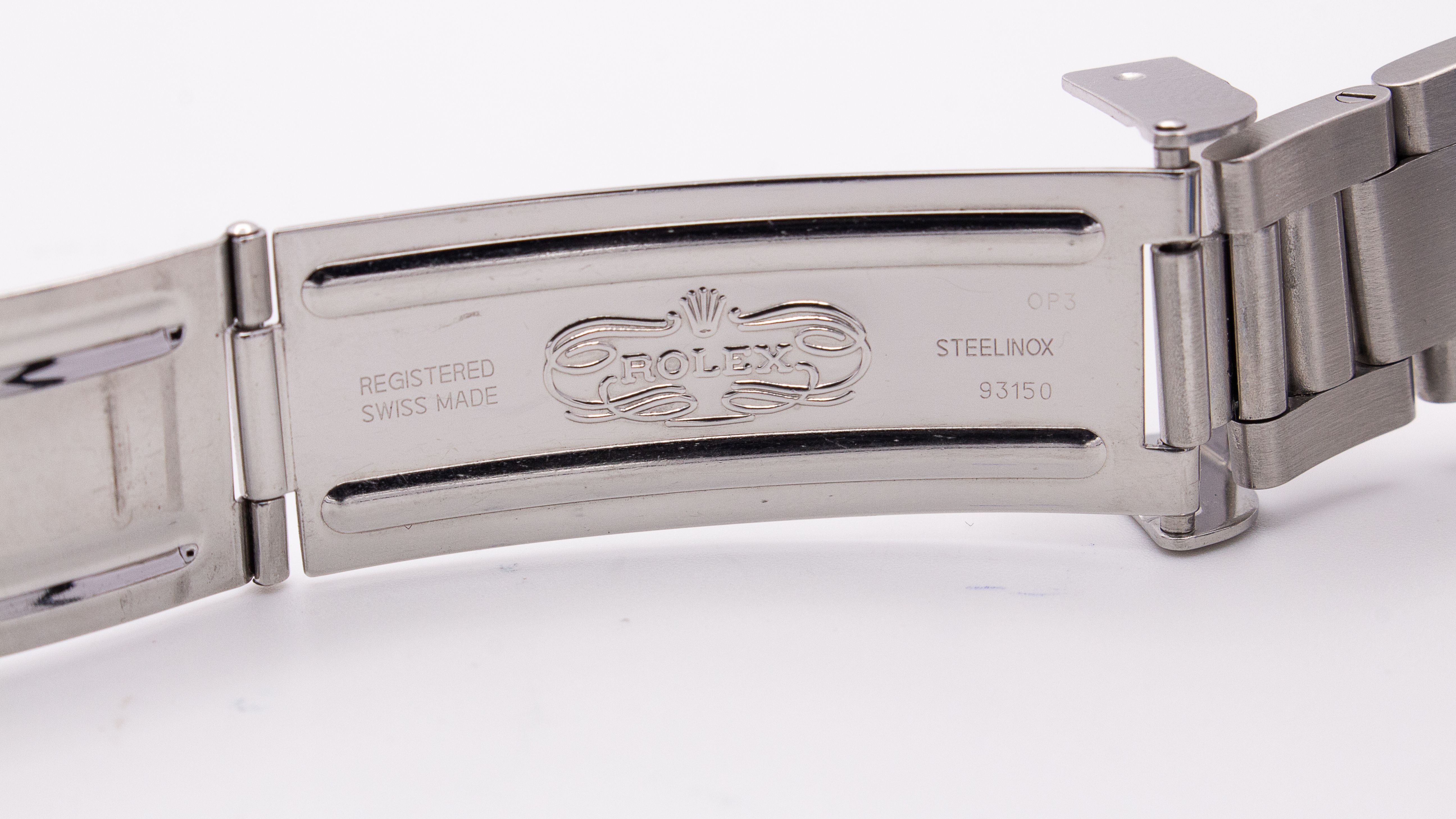 Das Oyster-Armband (Ref. 93150) mit passenden 501B-Endgliedern befindet sich ebenfalls in sehr gutem Zustand. Der alters- und bauarttypische Stretch ist nur sehr gering. Die aktuelle Länge passt für Handgelenke bis ca. 19 cm. Die leichten Tragespuren auf der Schließe wurden bewusst nicht vollständig auspoliert, um die noch sehr gut erhaltene ausgestanzte Rolex-Krone nicht zu beeinträchtigen. Die Kanten des Armbandes sind klar und scharf, was auf eine schonende Nutzung und einen weitgehend unberührten Zustand hindeutet. Die Tauchverlängerung rastet sauber ein und hält fest, ohne Spiel oder Ausleiern.