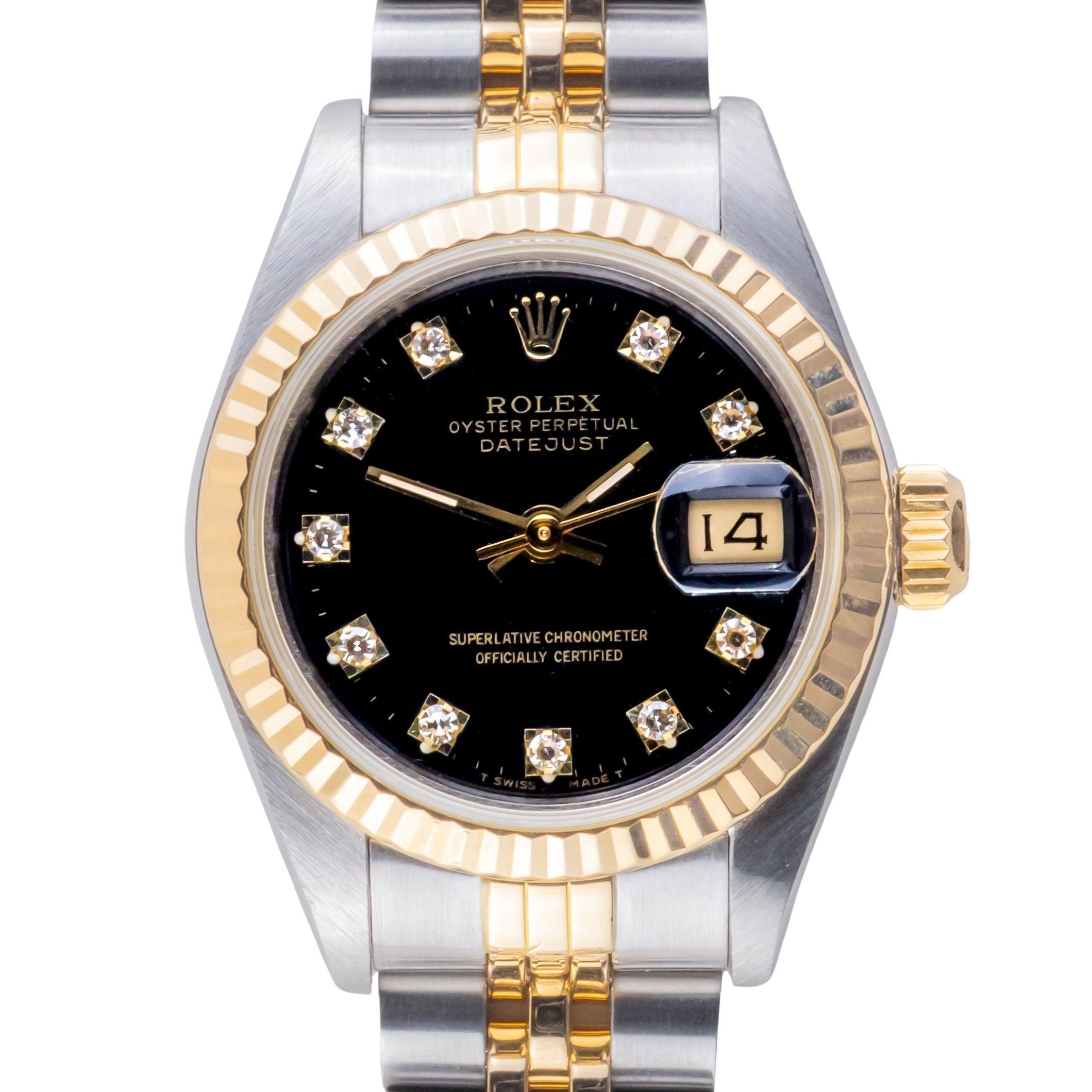 Rolex Oyster Perpetual Lady-Datejust reference 69173 from 1988 including full set. The Lady-Datejust 69173 measures a 26mm gold and stainless steel case, two-tone jubilee bracelet and fluted 14k gold bezel. This Lady-Datejust 69173 features an automatic movement caliber 2135 with quickset date function, a scratch resistance sapphire crystal and a black dial dial with diamond index.Every watch sold by Langedyk Vintage Watches is included with a LVW watch box, Authenticity report and free worldwide (insured) shipment. In addition, every pre-owned watch is offered with our 12-month warranty from the date of purchase.