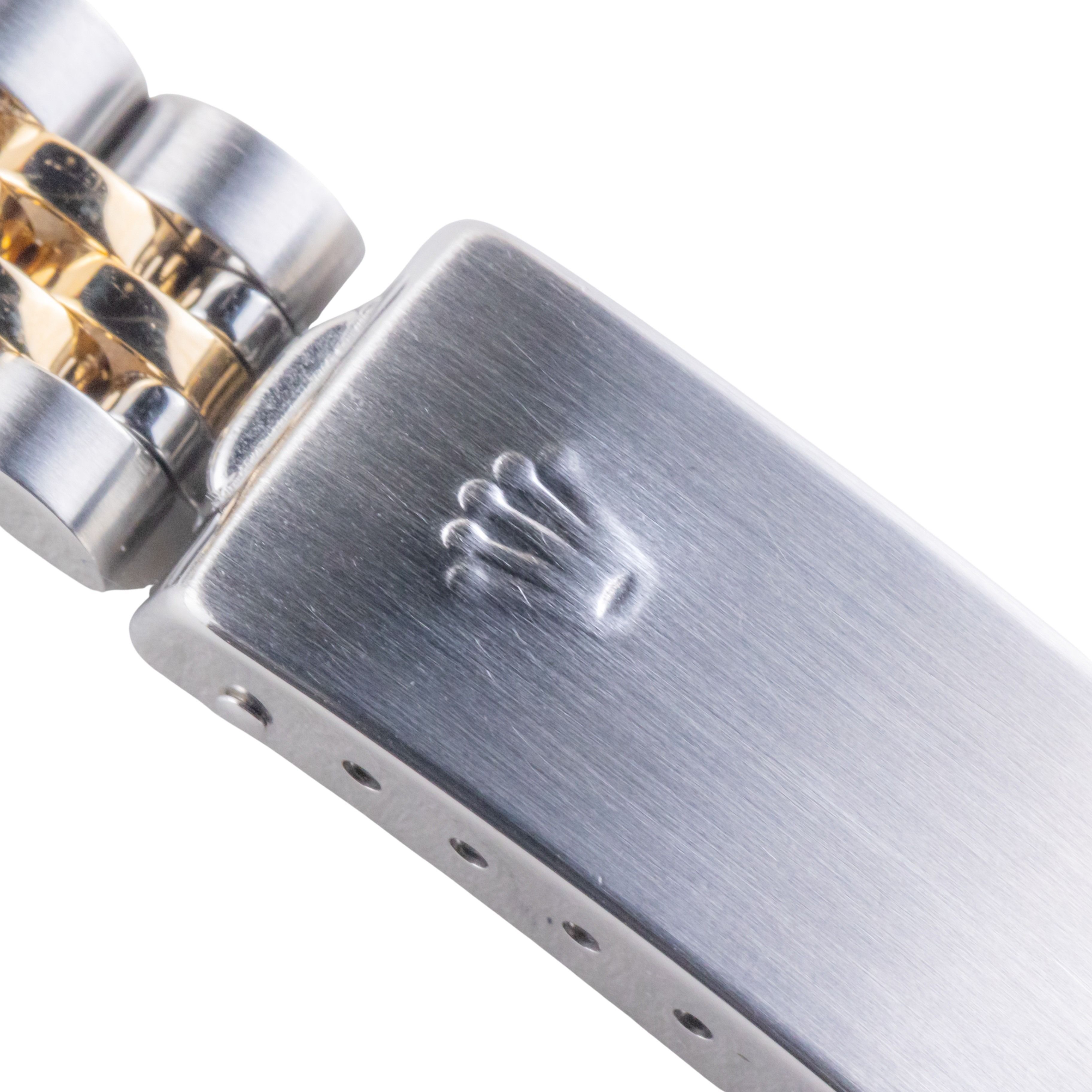 Rolex Oyster Perpetual Lady-Datejust referentie 69173 uit 1988 inclusief volledige set. De Lady-Datejust 69173 heeft een 26mm gouden en roestvrijstalen kast, een twee-tone jubilee band en een gefluteerde 14k gouden bezel. Deze Lady-Datejust 69173 beschikt over een automatische beweging caliber 2135 met een snelle datumfunctie, een krasbestendige saffierglas en een zwarte wijzerplaat met diamantindex.