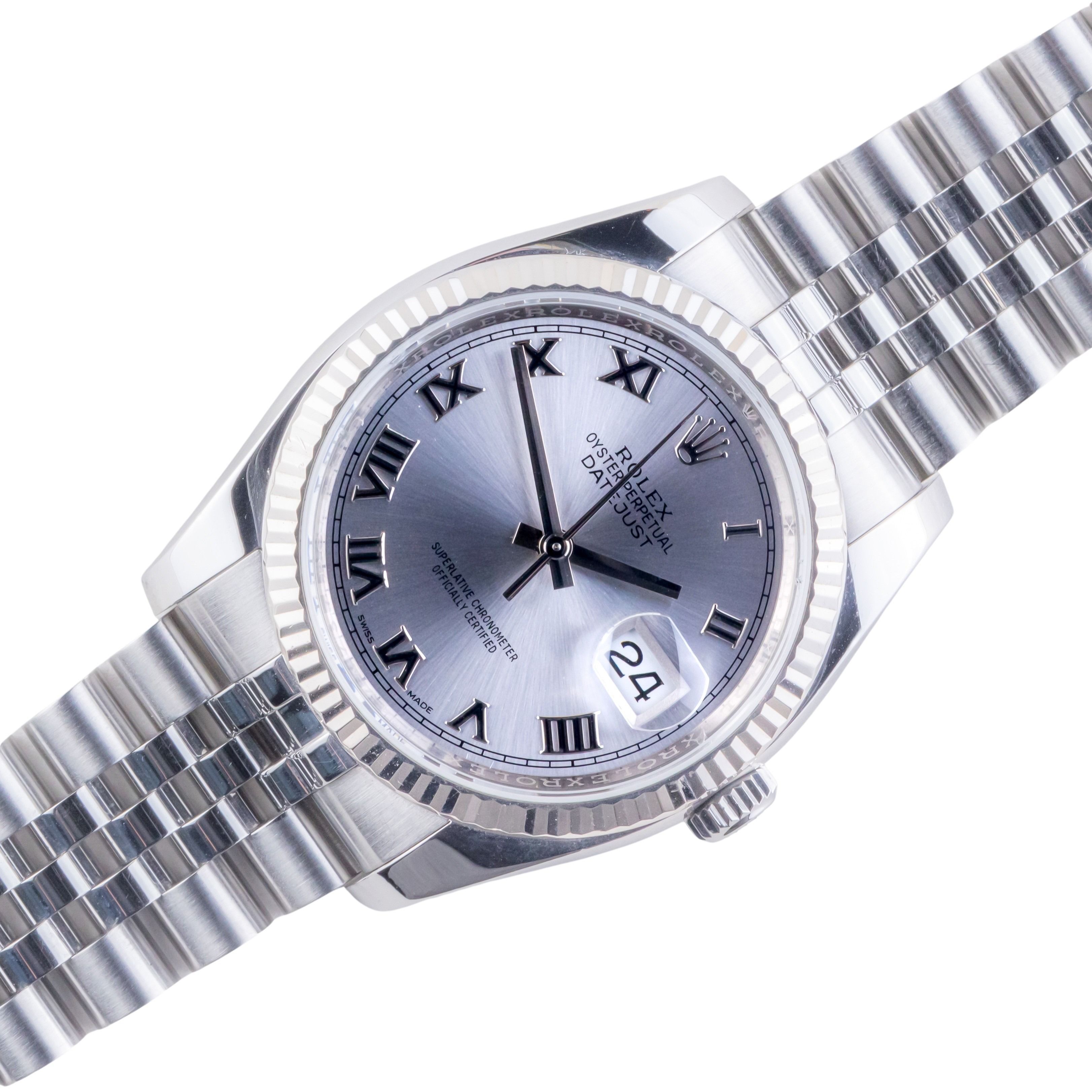 Rolex Oyster Perpetual Datejust referentie 116234 uit 2017, inclusief volledige set. De Datejust 116234 heeft een 36mm kast van roestvrij staal, een roestvrijstalen Jubilee-armband met verborgen klapsluiting en een gefluteerde bezel van 18k witgoud. Deze Datejust 116234 beschikt over een automatisch uurwerk caliber 3135 met een snelle datumfunctie, een krasbestendig saffierglas en een zilverkleurige stickwijzerplaat met Romeinse cijfers.