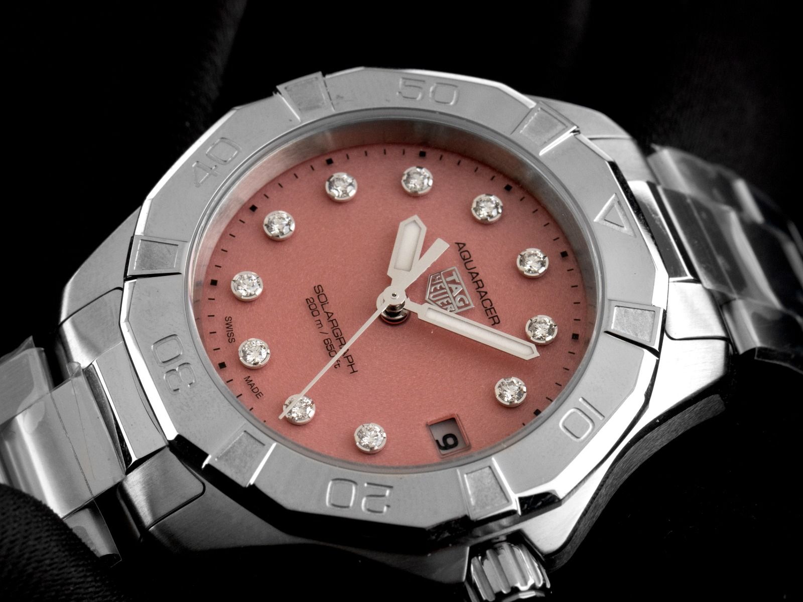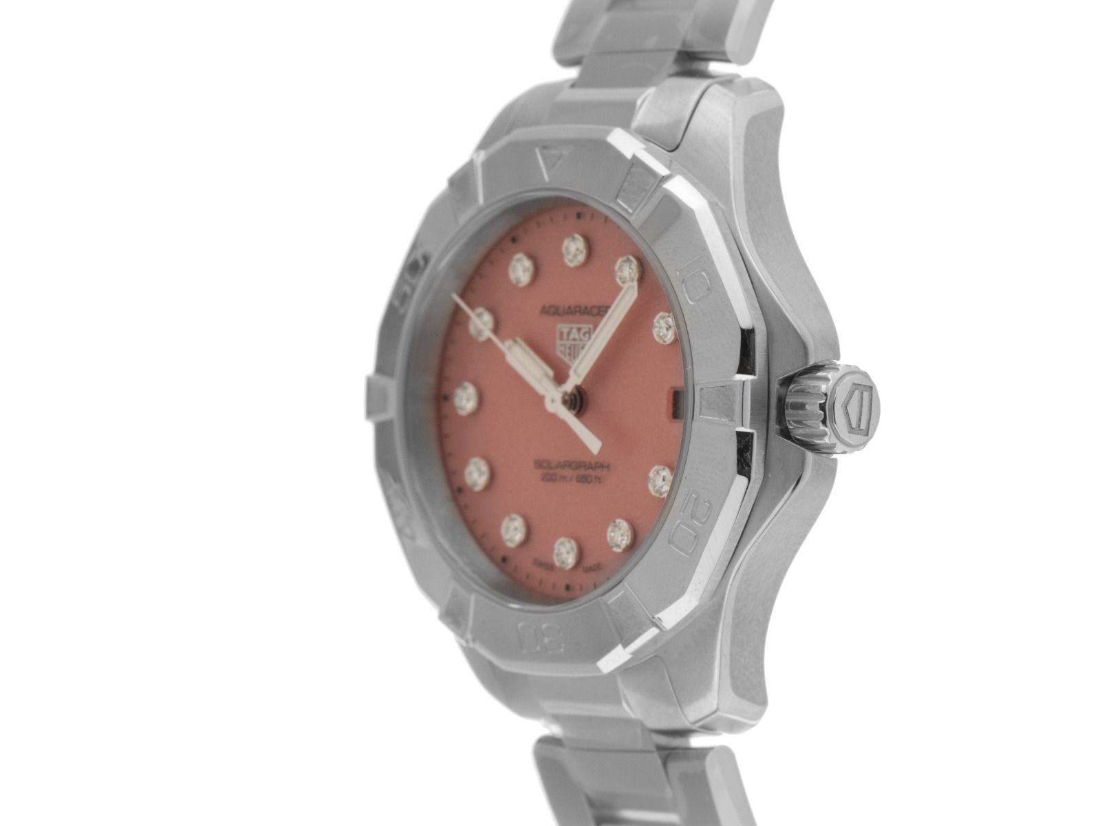 Tag Heuer Aquaracer Professional 200 Solargraph Stahl Diamanten Quarz Armband StahlGehäuse Edelstahl poliert und satiniert, Gehäusedurchmesser ohne Krone 34mm, Gehäusehöhe 9,7mm. Lünette Edelstahl poliert mit 60-Minuten Skala, einseitig drehbar. Armband Edelstahl poliert und satiniert, Sicherheitsfaltschließe Edelstahl mit Hersteller-Logo. Zifferblatt rosa mit aufgesetzten Diamantindexen und Leuchtzeigern. Uhrwerk quarzgesteuert, Kaliber TH50-01. Anzeige von Stunde, Minute und Sekunde über Zeiger aus der Mitte mit Sekundenstopp zur sekundengenauen Einstellung der Uhrzeit, Datumsanzeige mit Schnellverstellung bei 3 Uhr. Saphirglas kratzfest. Krone verschraubbar mit Flankenschutz und Hersteller-Logo. Boden Edelstahl graviert. Gewicht der Uhr inklusive Armband 94g, Länge des Armbandes inklusive Gehäuse 195mm. Wasserdicht bis 20 ATM. Referenznummer: WBP1318.BA0005, ID: ST116039481225H-3000, Artikelnummer: 10000084102. Original Tag Heuer Box und Garantie Papiere von 2025 sowie Beschreibung, Full Set. Ungetragen. Neuheit. Lieferzeit sofort.