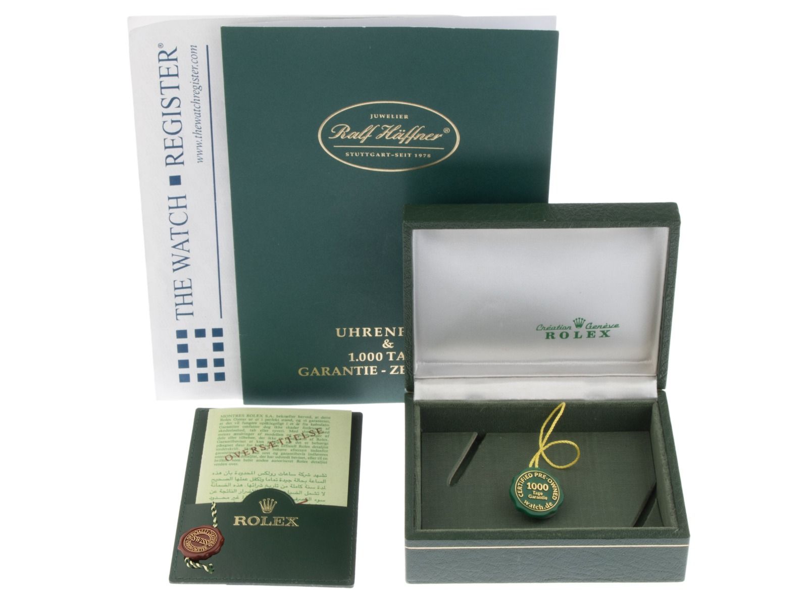 Inklusive certified pre owned Siegel / Uhrenpass mit einem Farbbild, der genauen Beschreibung sowie dem Wiederbeschaffungswert der Uhr über 5500,-€ und 1000 Tage Garantie ab Kaufdatum.