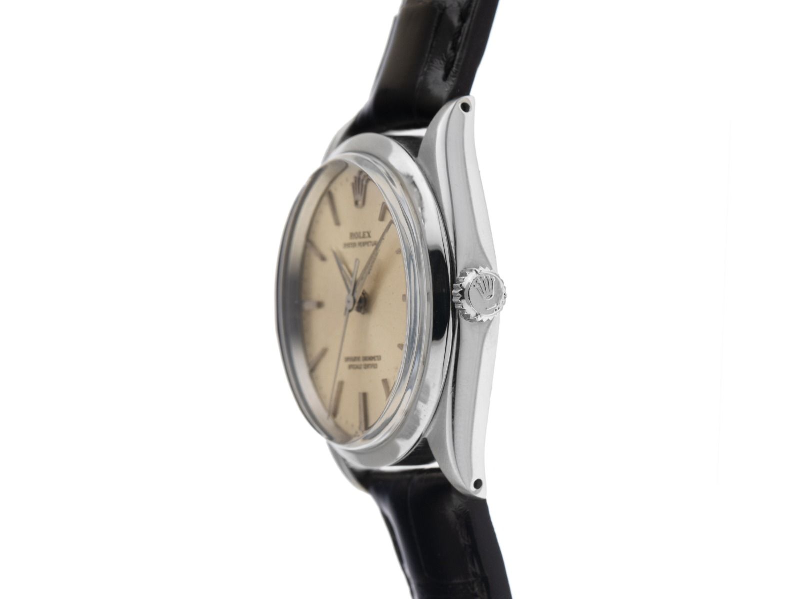 Gehäuse van gepolijst en satijnachtig staal, Gehäusedurchmesser zonder kroon 34mm, Gehäusehöhe 11,6mm. Lünette van glad en gepolijst staal. Armband van zwart krokoleder met siernaad, Anstoßbreite 20mm, stiftschließe van staal met fabrikantlogo. Zifferblatt in zilverkleur, licht gepatineerd, met opgezette indexen van staal en stalen wijzers. Uhrwerk Automatisch, Rolex Manufakturkaliber 1560 met 26 edelstenen. Weergave van uur, minuut en seconde via wijzers vanuit het midden met secondenstop voor een nauwkeurige tijdinstelling. Gewelfd plexiglas. Kroon met schroefdraad en fabrikantlogo. Achterkant van staal met schroefdraad. Gewicht van het horloge inclusief armband 46g. Referentienummer: 1002, Bouwjaar: 1966, Gehäusenummer: 1247XXX, ID: P216540641225H-5500, Artikelnummer: 10000084114. Met gangcontrole en volledige uiterlijke opfrissing van december 2025. Originele Rolex doos, vertaalboekje, leren etui, Rolex Chronometer-zegel en een uittreksel van het Watch Register van december 2025, The Watch Register certificaat / zonder vermelding (Internationale database voor verloren of gestolen horloges). Superscherpe aanbieding, investering met waardevermeerderingspotentieel, extreem zeldzaam verzamelobject. Zeer goede staat. Leveringstijd direct.