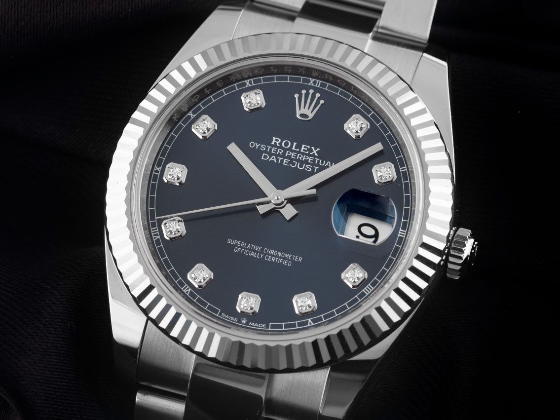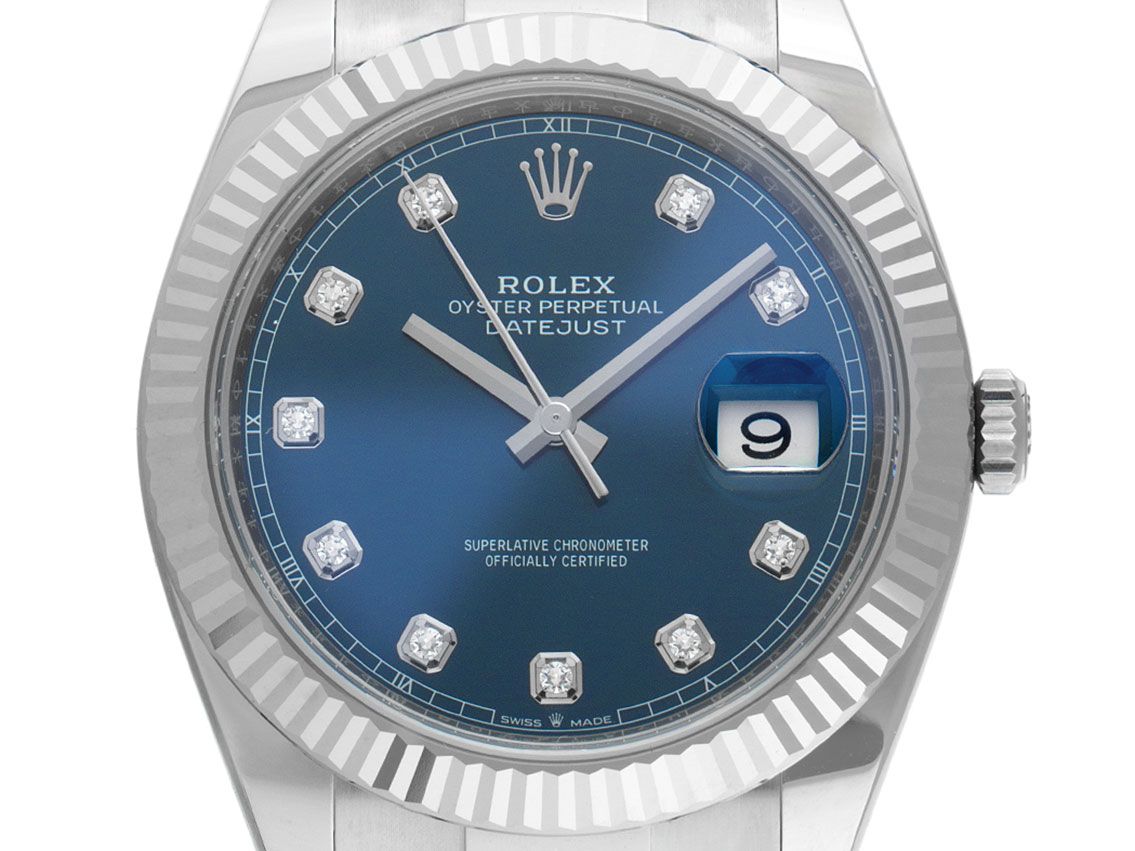 Rolex Datejust Stahl 18kt Weißgold Diamanten Automatik Armband OysterGehäuse Edelstahl poliert und satiniert, Gehäusedurchmesser ohne Krone 41mm, Gehäusehöhe 11,9mm. Lünette 18kt Weißgold geriffelt und poliert. Armband Oyster Edelstahl poliert und satiniert, Faltschließe Edelstahl mit Hersteller-Logo. Zifferblatt blau mit aufgesetzten Diamantindexen und weißgoldenen Zeigern. Uhrwerk Automatik, Chronometer mit Zeugnis, Rolex Manufakturkaliber 3235 mit 31 Edelsteinen, Gangreserve ca. 70 Stunden. Anzeige von Stunde, Minute und Sekunde über Zeiger aus der Mitte mit Sekundenstopp zur sekundengenauen Einstellung der Uhrzeit, Datumsanzeige mit Schnellverstellung unter Glaslupe bei 3 Uhr. Saphirglas kratzfest. Krone verschraubbar mit Hersteller-Logo. Boden Edelstahl verschraubt. Gewicht der Uhr inklusive Armband 138g, Länge des Armbandes inklusive Gehäuse 170mm. Referenznummer: 126334, Gehäusenummer: 89P92XXX, ID: P2233190000126H-13800/13250, Artikelnummer: 10000084213. Mit Gangkontrolle und kompletter äußerlicher Aufarbeitung von Januar 2026. Original Rolex Box mit Umkarton und Garantie Papiere von November 2019, LC 330 / Russland sowie Beschreibung, Ledermäppchen, Rolex Chronometer-Siegel und Watchregister Auszug von Januar 2026, The Watch Register Zertifikat / ohne Eintrag (Internationale Datenbank für verlorene oder gestohlene Uhren), inkl. Kaufrechnung, Full Set. Superschnäppchen, Kapitalanlage mit Wertsteigerungspotential. Wie Neu. Lieferzeit sofort.