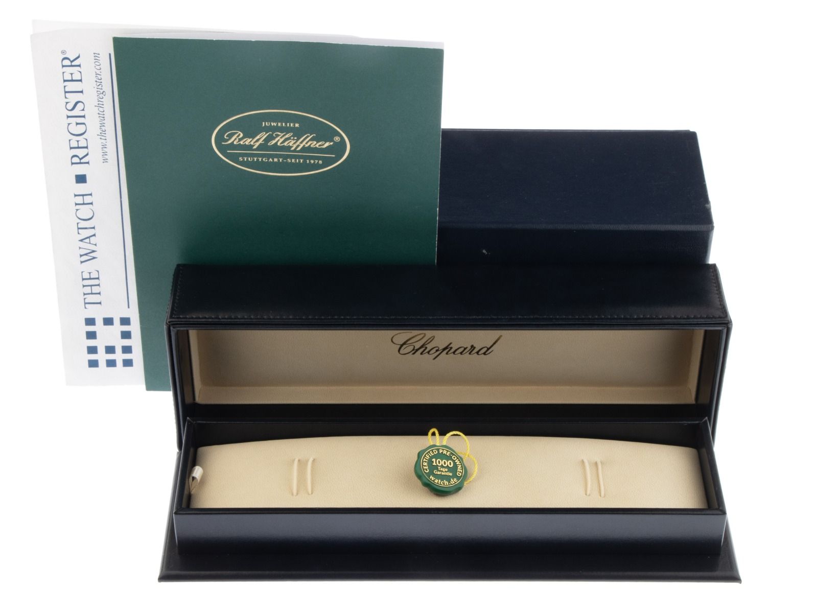 Behuizing 18kt Roségoud gepolijst, behuizingsdiameter zonder kroon 39,5mm, behuizingshoogte 7,5mm. Lunette 18kt Roségoud gepolijst. Horlogeband Krokoleder bruin met siernaad, aanzetbreedte 19mm, pin-buckle 18kt Roségoud met fabrikantlogo. Wijzerplaat zilverkleurig met roségouden Arabische cijfers en indexen, evenals roségouden wijzers. Uurwerk Automatisch, manufactuurkaliber Chopard LUC 96.12-L met 29 edelstenen. Weergave van uur en minuut via centrale wijzers, kleine seconde op 6 uur. Mineraalglas. Kroon geribbeld. Achterkant 18kt Roségoud 8-voudig geschroefd en gegraveerd. Gewicht van het horloge inclusief band 69g. Referentienummer: 1920, bouwjaar: 2021, behuizingsnummer: 1708XXX, ID: KH1771130000126H-11900, artikelnummer: 10000084295. Met gangcontrole en volledige uiterlijke opfrissing van januari 2026. Originele Chopard doos met omdoos en Watchregister uittreksel van januari 2026, The Watch Register certificaat / zonder vermelding (Internationale database voor verloren of gestolen horloges). Kapitaalbelegging met waardestijgingspotentieel, extreem zeldzaam verzamelobject. Als nieuw. Leveringstijd direct.