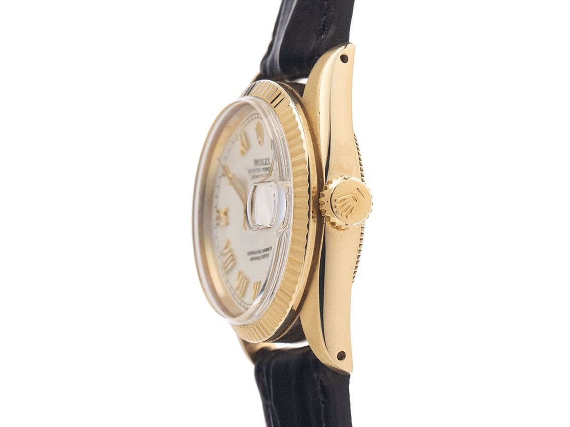 Behuizing 14kt Geelgoud gepolijst en gematteerd, behuizingsdiameter zonder kroon 31mm, behuizinghoogte 11,6mm. Lunette 14kt Geelgoud geribbeld en gepolijst. Rolex armband Krokoleder zwart met siernaad, aanzetbreedte 17mm, Rolex pin-buckle verguld met fabrikant-logo. Wijzerplaat wit met opgezette geelgouden Romeinse cijfers en geelgouden wijzers. Uurwerk Automatisch, Chronometer, Rolex Manufakturkaliber 2030 met 28 edelstenen. Weergave van uur, minuut en seconde via centrale wijzers met seconde-stop voor nauwkeurige tijdinstelling, datumaanduiding onder vergrootglas bij 3 uur, open 6/9 (open 6 en 9 in de datumaanduiding). Plexiglas. Kroon schroefbaar met fabrikant-logo. Achterkant 14kt Geelgoud geschroefd. Gewicht van het horloge inclusief armband 42g. Referentienummer: 6827, behuizingsnummer: 5052XXX, bouwjaar: 1977, ID: KM1772116000126H-9900, artikelnummer: 10000084310. Met gangcontrole en volledige uiterlijke opfrissing van januari 2026. Originele Rolex doos met omdoos en beschrijving, evenals leren etui, vertaalboekje, Rolex Chronometer-zegel en Watchregister uittreksel van januari 2026, The Watch Register certificaat / zonder vermelding (Internationale database voor verloren of gestolen horloges). Superscherpe aanbieding, investering met waardestijgingspotentieel, zeer zeldzaam verzamelobject, bijna niet gedragen. Zeer goede staat. Leveringstijd direct.