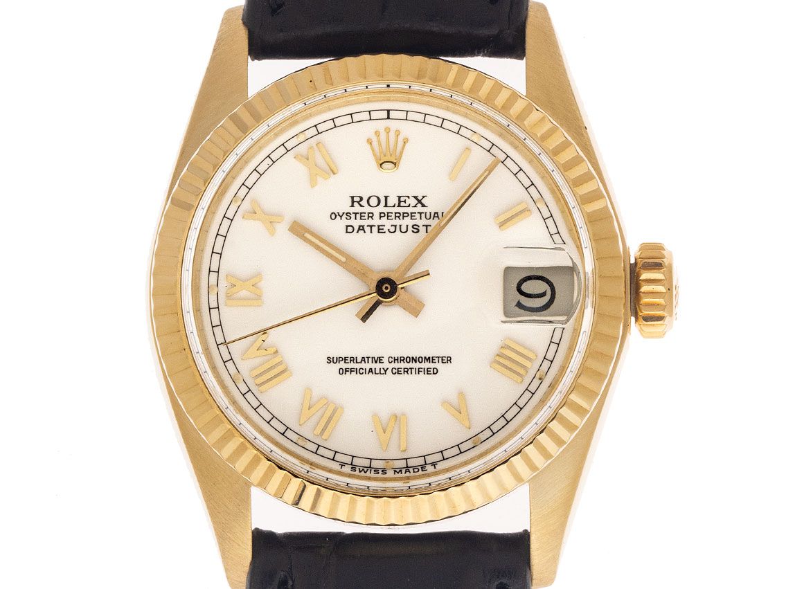 Rolex Datejust Medium 14kt Gelbgold Automatik Armband KrokolederGehäuse 14kt Gelbgold poliert und satiniert, Gehäusedurchmesser ohne Krone 31mm, Gehäusehöhe 11,6mm. Lünette 14kt Gelbgold geriffelt und poliert. Rolex Armband Krokoleder schwarz mit Ziernaht, Anstoßbreite 17mm, Rolex Stiftschließe Gelbgold vergoldet mit Hersteller-Logo. Zifferblatt weiß mit aufgesetzten gelbgoldenen römischen Ziffern und gelbgoldenen Zeigern. Uhrwerk Automatik, Chronometer, Rolex Manufakturkaliber 2030 mit 28 Edelsteinen. Anzeige von Stunde, Minute und Sekunde über Zeiger aus der Mitte mit Sekundenstopp zur sekundengenauen Einstellung der Uhrzeit, Datumsanzeige unter Glaslupe bei 3 Uhr, open 6/9 (offene 6 und 9 in der Datumsanzeige). Plexiglas. Krone verschraubbar mit Hersteller-Logo. Boden 14kt Gelbgold verschraubt. Gewicht der Uhr inklusive Armband 42g. Referenznummer: 6827, Gehäusenummer: 5052XXX, Baujahr: 1977, ID: KM1772116000126H-9900, Artikelnummer: 10000084310. Mit Gangkontrolle und kompletter äußerlicher Aufarbeitung von Januar 2026. Original Rolex Box mit Umkarton und Beschreibung sowie Ledermäppchen, Übersetzungsheft, Rolex Chronometer-Siegel und Watchregister Auszug von Januar 2026, The Watch Register Zertifikat / ohne Eintrag (Internationale Datenbank für verlorene oder gestohlene Uhren). Superschnäppchen, Kapitalanlage mit Wertsteigerungspotential, sehr seltenes Sammlerstück, fast nicht getragen. Sehr guter Zustand. Lieferzeit sofort.