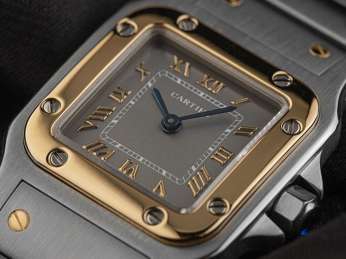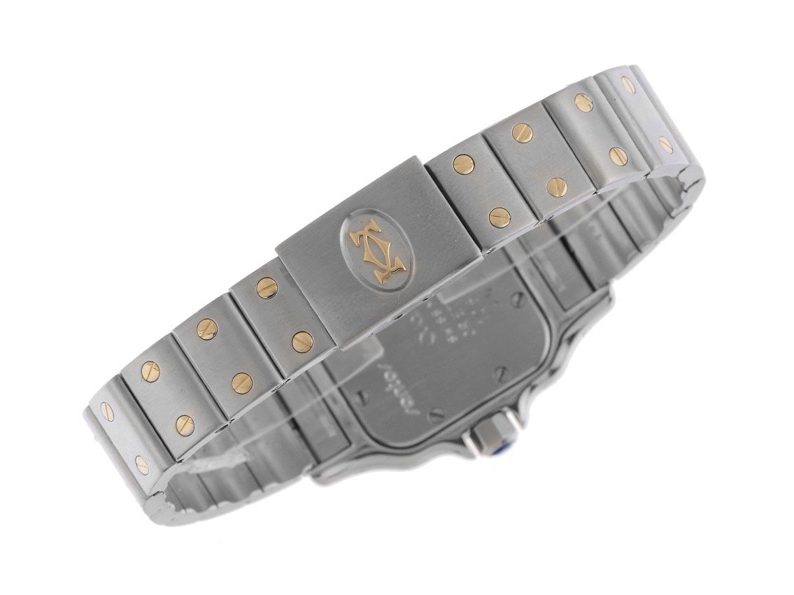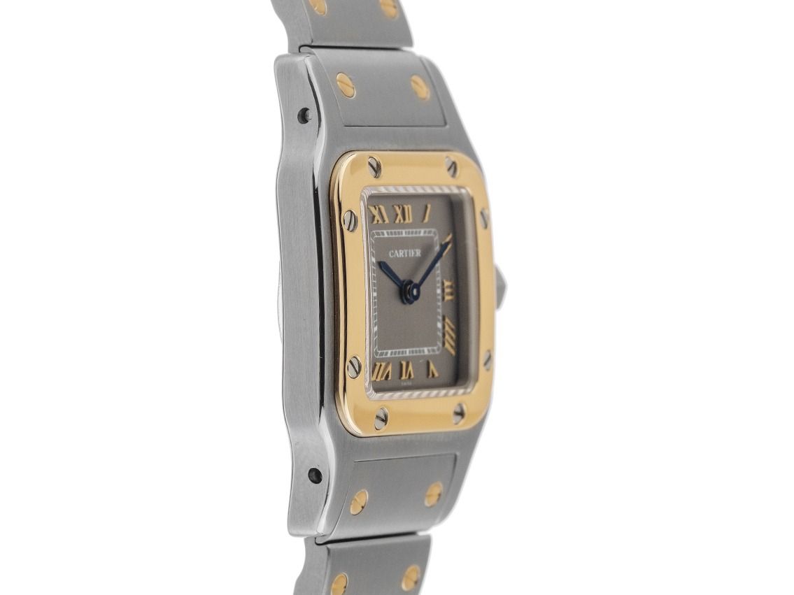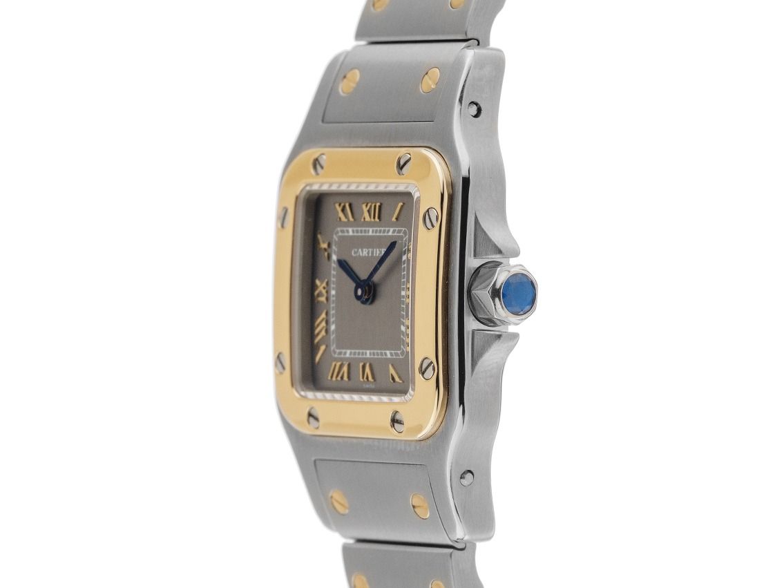 Cartier Santos Galbee Lady PM kleines Model Stahl Gelbgold Quarz Armband Stahl GelbgoldGehäuse Edelstahl satiniert, rechteckig, Gehäusemaße ohne Krone (L x B x H) 35 x 24 x 6,0mm. Lünette 18kt Gelbgold 8-fach verschraubt und poliert. Armband Edelstahl / Gelbgold satiniert, Faltschließe Edelstahl mit Hersteller-Logo. Zifferblatt grau mit aufgesetzten gelbgoldenen römischen Ziffern und gebläuten Zeigern. Uhrwerk quarzgesteuert, Cartier Manufakturkaliber 157 mit 4 Edelsteinen. Anzeige von Stunde und Minute über Zeiger aus der Mitte. Saphirglas kratzfest. Krone mit Spinell Cabochon und Flankenschutz. Boden Edelstahl 8-fach verschraubt und graviert. Gewicht der Uhr inklusive Armband 55g, Länge des Armbandes inklusive Gehäuse 160mm. Referenznummer: 1057930, Gehäusenummer: 12XXX, Baujahr: 1991, ID: P230266000126H-6900, Artikelnummer: 10000084316. Mit Gangkontrolle, neuer Batterie und kompletter äußerlicher Aufarbeitung von Januar 2026. Original Cartier Box mit Umkarton und Garantie Papiere von September 1991 sowie Beschreibung und Watchregister Auszug von Januar 2026, The Watch Register Zertifikat / ohne Eintrag (Internationale Datenbank für verlorene oder gestohlene Uhren), Full Set. Superschnäppchen, sehr seltenes Sammlerstück, fast nicht getragen. Sehr guter Zustand. Lieferzeit sofort.