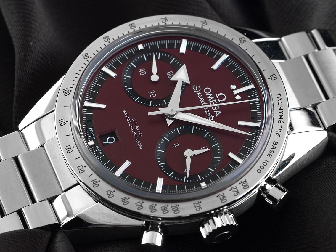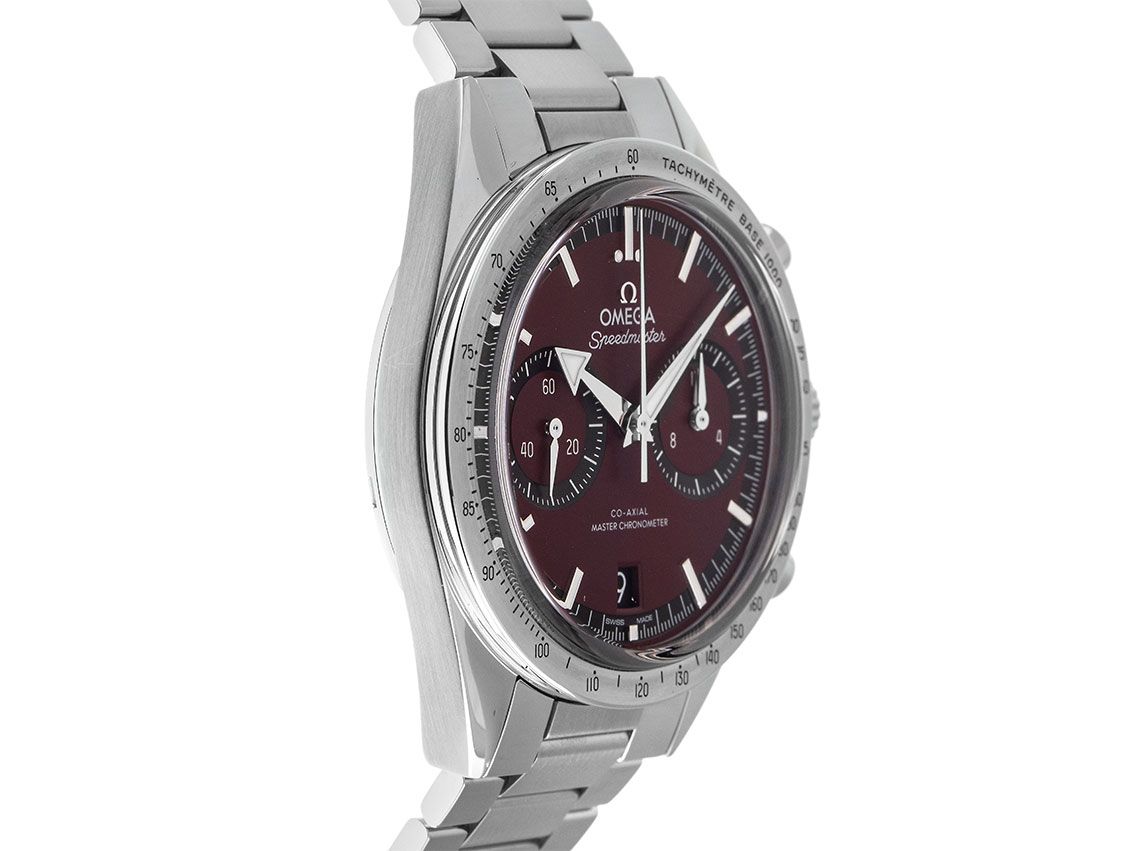 Omega Speedmaster '57 Co-Axial Master Chronometer Stahl Handaufzug Chronograph Armband StahlGehäuse Edelstahl poliert und satiniert, Gehäusedurchmesser ohne Krone 40,5mm, Gehäusehöhe 12,9mm. Lünette Edelstahl poliert und satiniert mit Tachymeterskala. Armband Edelstahl poliert und satiniert. Sicherheitsfaltschließe Edelstahl mit Hersteller-Logo. Zifferblatt burgunderrot mit aufgesetzten Leuchtindexen und Leuchtzeigern. Uhrwerk Handaufzug, Chronograph, Chronometer mit Zeugnis, Omega Manufakturkaliber 9906 mit 45 Edelsteinen, Gangreserve ca. 60 Stunden. Anzeige von Stunde und Minute über Zeiger aus der Mitte, kleine Sekunde mit Sekundenstopp zur sekundengenauen Einstellung der Uhrzeit bei 9 Uhr, Datumsanzeige mit Schnellverstellung bei 6 Uhr. Saphirglas kratzfest und beidseitig entspiegelt. Krone mit Hersteller-Logo. Boden Edelstahl verschraubt und graviert mit Saphirglas Sichtfenster. Gewicht der Uhr inklusive Armband 134g, Länge des Armbandes inkl. Gehäuse 200mm. Wasserdicht bis 5 ATM. Referenznummer: 332.10.41.51.11.001, ID: ST1160146320126H-10300, Artikelnummer: 10000084370. Original Omega Box mit Umkarton und Garantie Papiere von Januar 2026 sowie Beschreibung, Full Set. Ungetragen. Lieferzeit sofort.