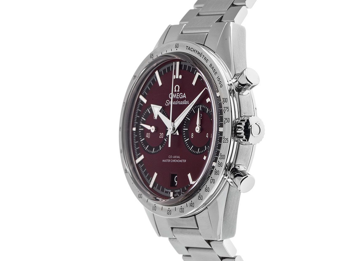 Behuizing van gepolijst en satijn afgewerkt staal, behuizingsdiameter zonder kroon 40,5mm, behuizingshoogte 12,9mm. Lunette van gepolijst en satijn afgewerkt staal met tachymeterschaal. Armband van gepolijst en satijn afgewerkt staal. Veiligheidsvouwsluiting van staal met fabrikantlogo. Wijzerplaat bordeauxrood met opgezette luminescerende indexen en luminescerende wijzers. Uurwerk handopwind, chronograaf, chronometer met certificaat, Omega manufactuurkaliber 9906 met 45 edelstenen, gangreserve van ongeveer 60 uur. Weergave van uur en minuut via centrale wijzers, kleine seconde met seconde-stop voor nauwkeurige tijdinstelling bij 9 uur, datumaanduiding met snelle instelling bij 6 uur. Saffierglas krasbestendig en aan beide zijden antireflecterend. Kroon met fabrikantlogo. Achterkant van staal, geschroefd en gegraveerd met saffierglas kijkvenster. Gewicht van het horloge inclusief armband 134g, lengte van de armband inclusief behuizing 200mm. Waterdicht tot 5 ATM. Referentienummer: 332.10.41.51.11.001, ID: ST1160146320126H-10300, artikelnummer: 10000084370. Originele Omega doos met omdoos en garantiepapieren van januari 2026, evenals beschrijving, Full Set. Ongebruikt. Leveringstijd direct.
