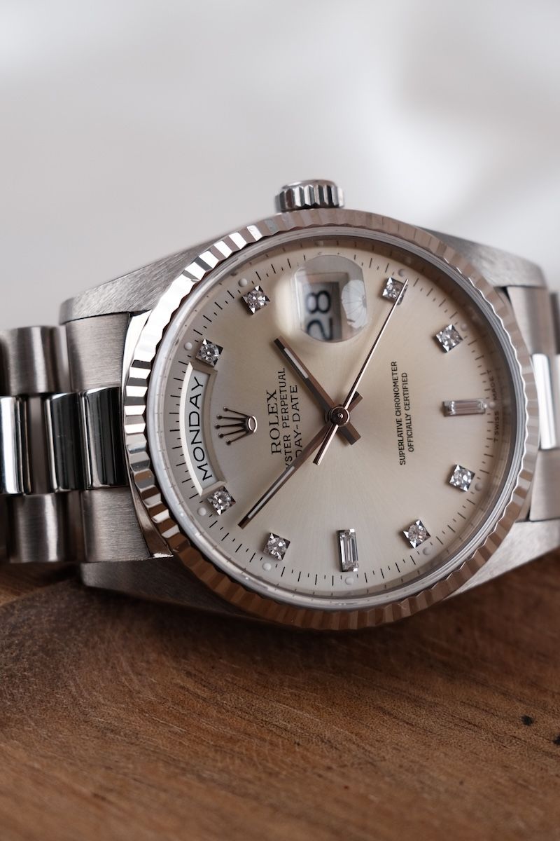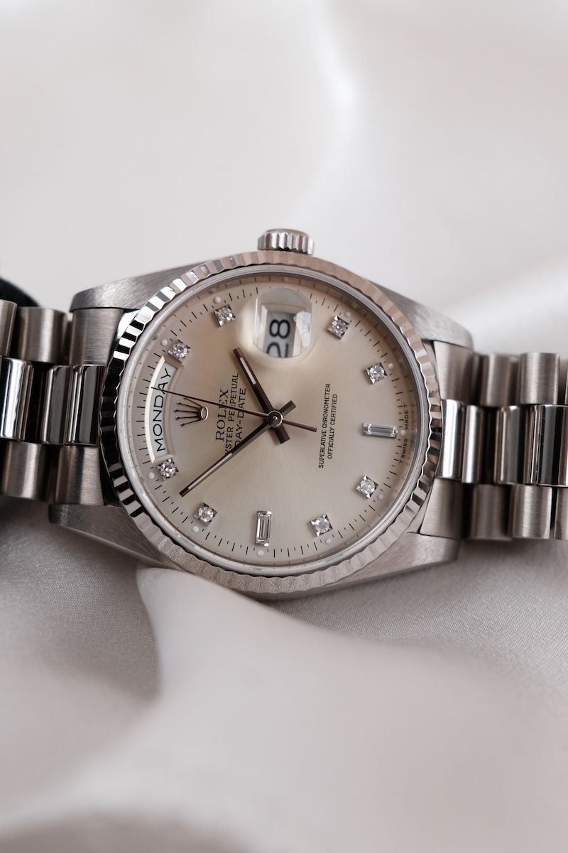 **Watch Description**Ready for your new dream watch? Perhaps this beautiful Rolex Day-Date 36 made of White gold will soon be on your wrist. Whether vintage or modern - with over 200 watches in stock, we always have your new luxury watch available for you immediately - whether you are a first-time buyer or your watch collection needs a new addition.