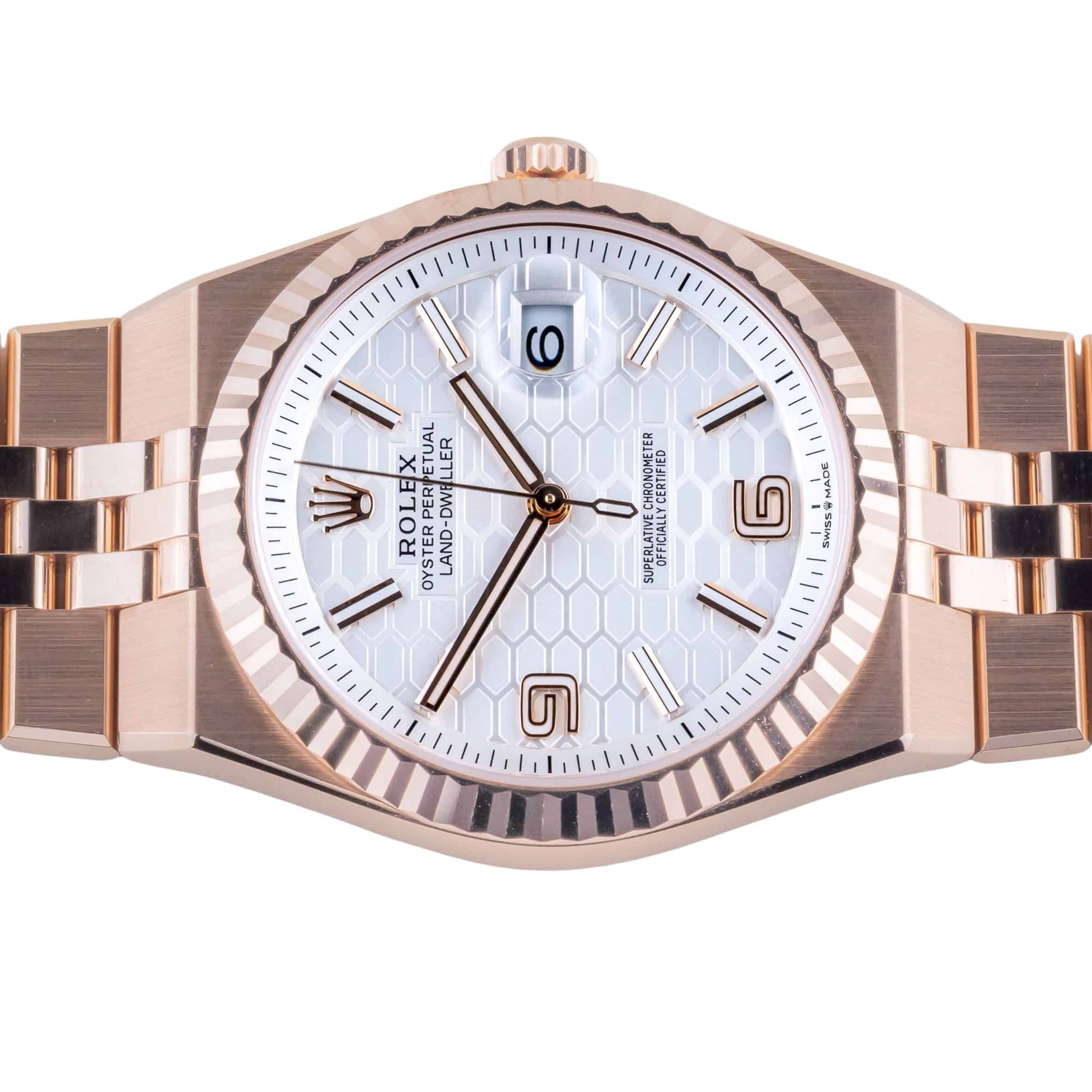 The Rolex Land-Dweller 127235 combines cutting-edge technology with timeless style. Featuring a 36mm 18K Rose gold case, this watch is powered by the self-winding Rolex Caliber 7135 movement, offering a 66-hour power reserve. The striking silver honeycomb dial with chromalight display ensures readability, while the Cyclops lens magnifies the date for clarity. It’s paired with a 18K rose gold jubilee bracelet for comfort and durability. An ideal luxury timepiece for any occasion, the Rolex Land-Dweller 127235 combines style and functionality, embodying Rolex’s renowned craftsmanship.Every watch sold by Langedyk Vintage Watches is included with a LVW watch box, Authenticity report and free worldwide (insured) shipment. In addition, every pre-owned watch is offered with our 12-month warranty from the date of purchase.