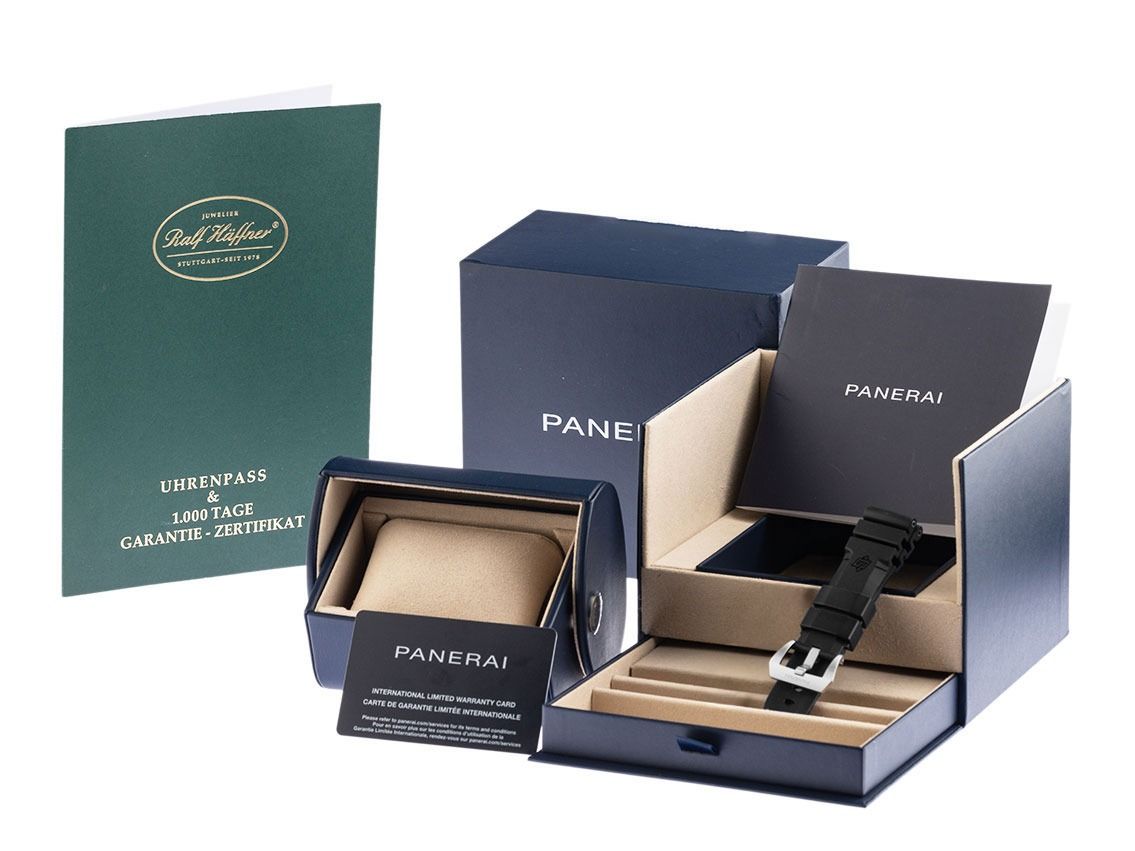 Behuizing van geborsteld roestvrij staal, behuizingsdiameter zonder kroon 40mm, behuizingshoogte 12,6mm. Lünette van glad en gepolijst roestvrij staal. Horlogeband van zwart leer met siernaad, aanzetbreedte 22mm, pin-buckle van roestvrij staal met fabrikantlogo. Wijzerplaat zwart mat met luminescente indexen en Arabische cijfers 6 en 12, evenals luminescente wijzers van roestvrij staal en een blauwe secondewijzer. Uurwerk Automatisch, Panerai Manufakturkaliber P.900 met 23 edelstenen, gangreserve van ongeveer 72 uur. Weergave van uur en minuut via centrale wijzers, kleine seconde met seconde-stop voor nauwkeurige tijdinstelling bij 9 uur, datumaanduiding met snelle aanpassing bij 3 uur. Saffierglas krasbestendig en gebombardeerd. Kroon met gepatenteerde Panerai beschermbrug en vergrendelingshendel. Achterkant van roestvrij staal, geschroefd en gegraveerd. Gewicht van het horloge inclusief band 97g. Referentienummer: PAM01372, ID: ST1160114700125H-7900, Artikelnummer: 10000084422. Originele Panerai doos met omdoos, garantiepapieren van december 2025, evenals beschrijving, verwisselbare rubberen horlogeband in zwart en lunettebescherming, Full Set. Ongebruikt. Leveringstijd onmiddellijk.