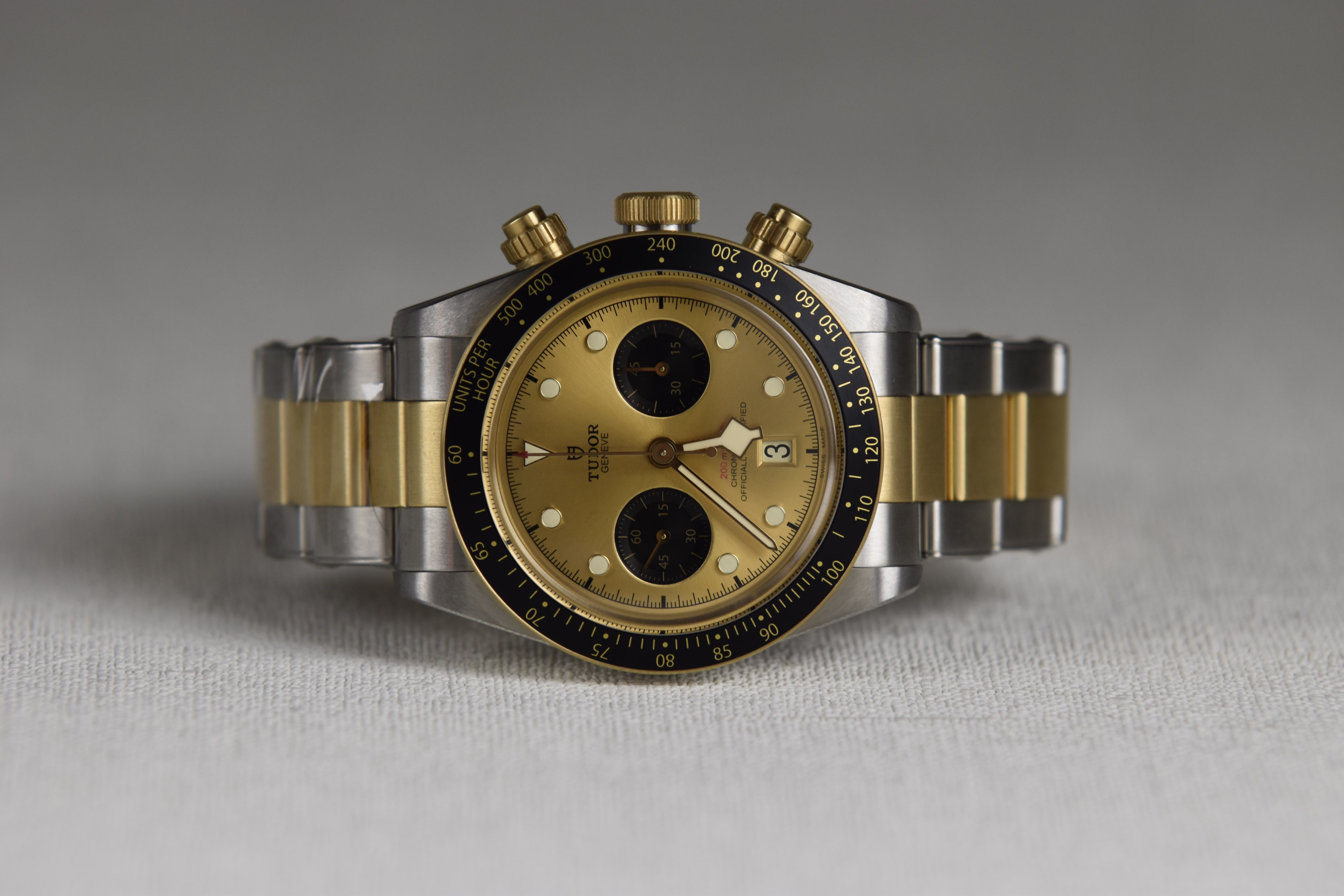 A bold and sporty two-tone chronograph — the Black Bay Chrono S&G blends racing heritage with dive-watch DNA — full set — factory fresh.