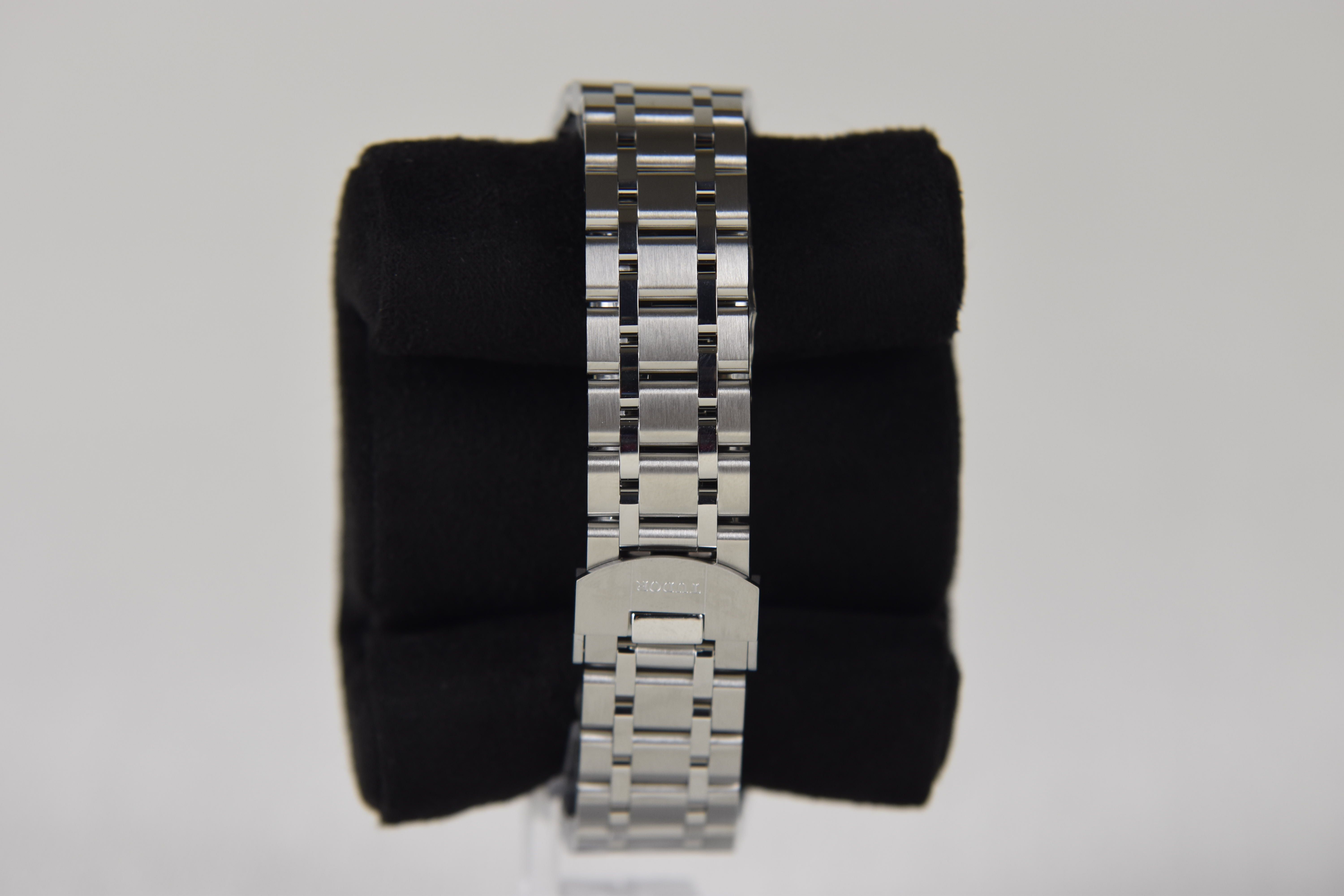 Dial Silver sunray with applied Roman numerals, day display at 12 o’clock and date at 3 o’clock