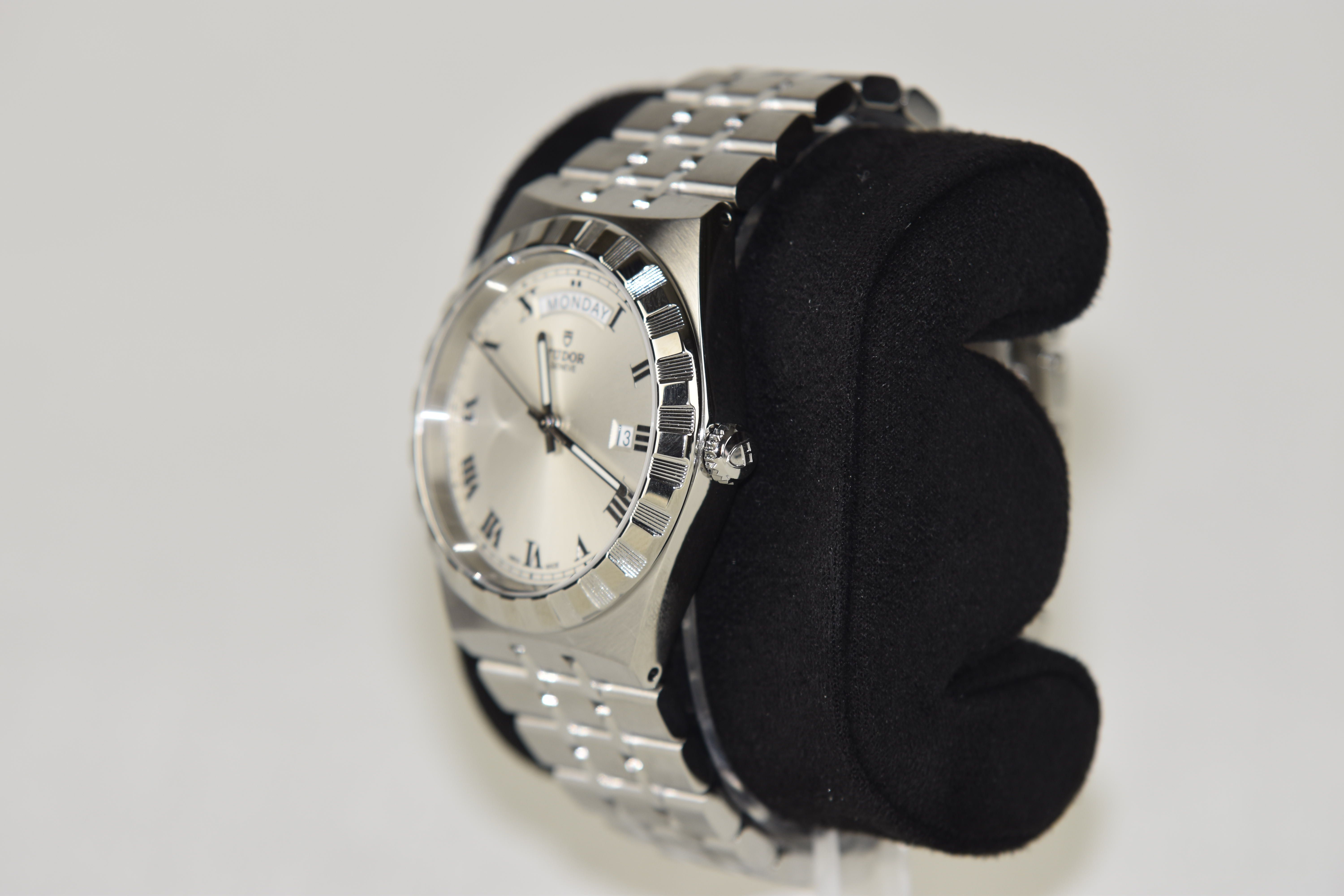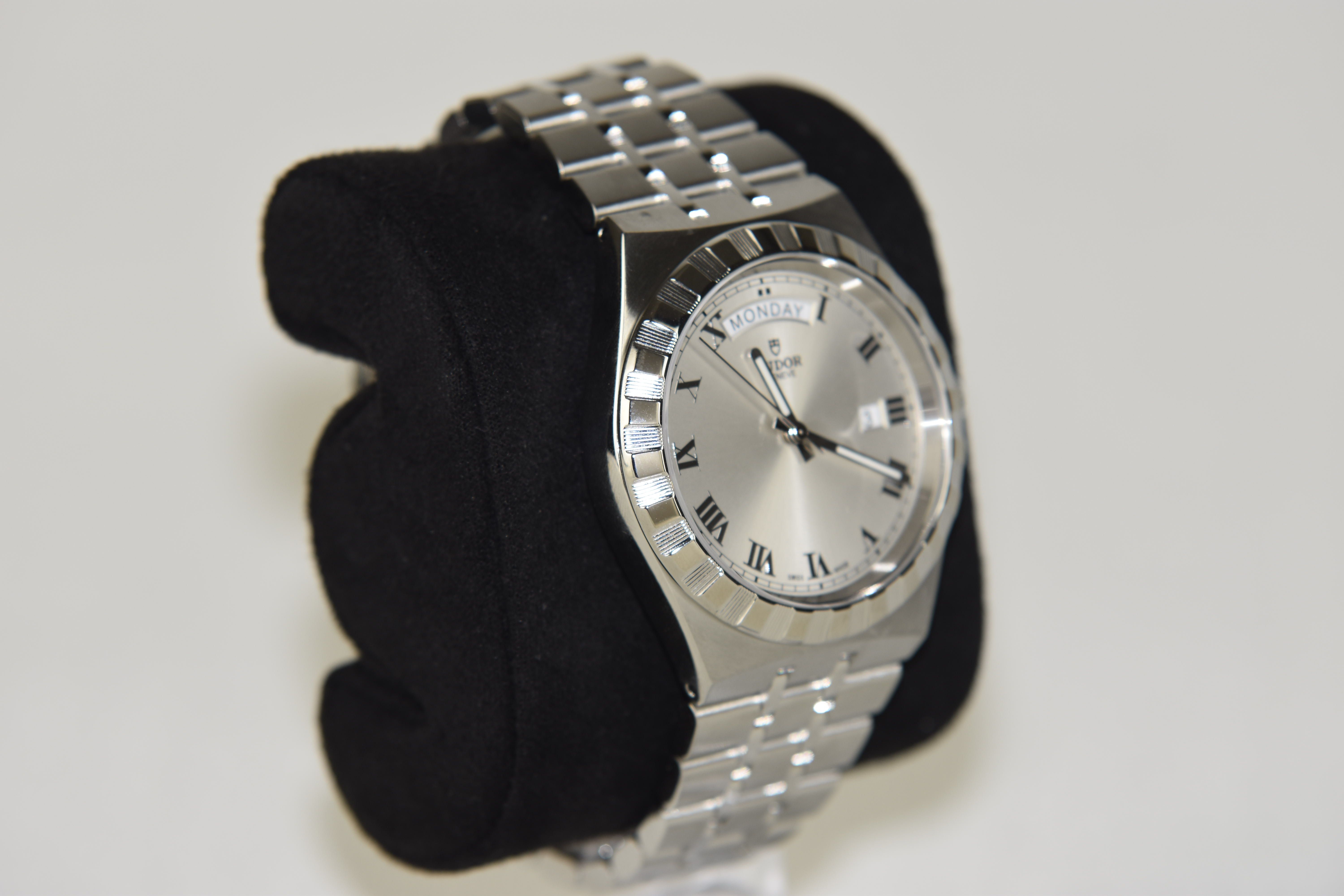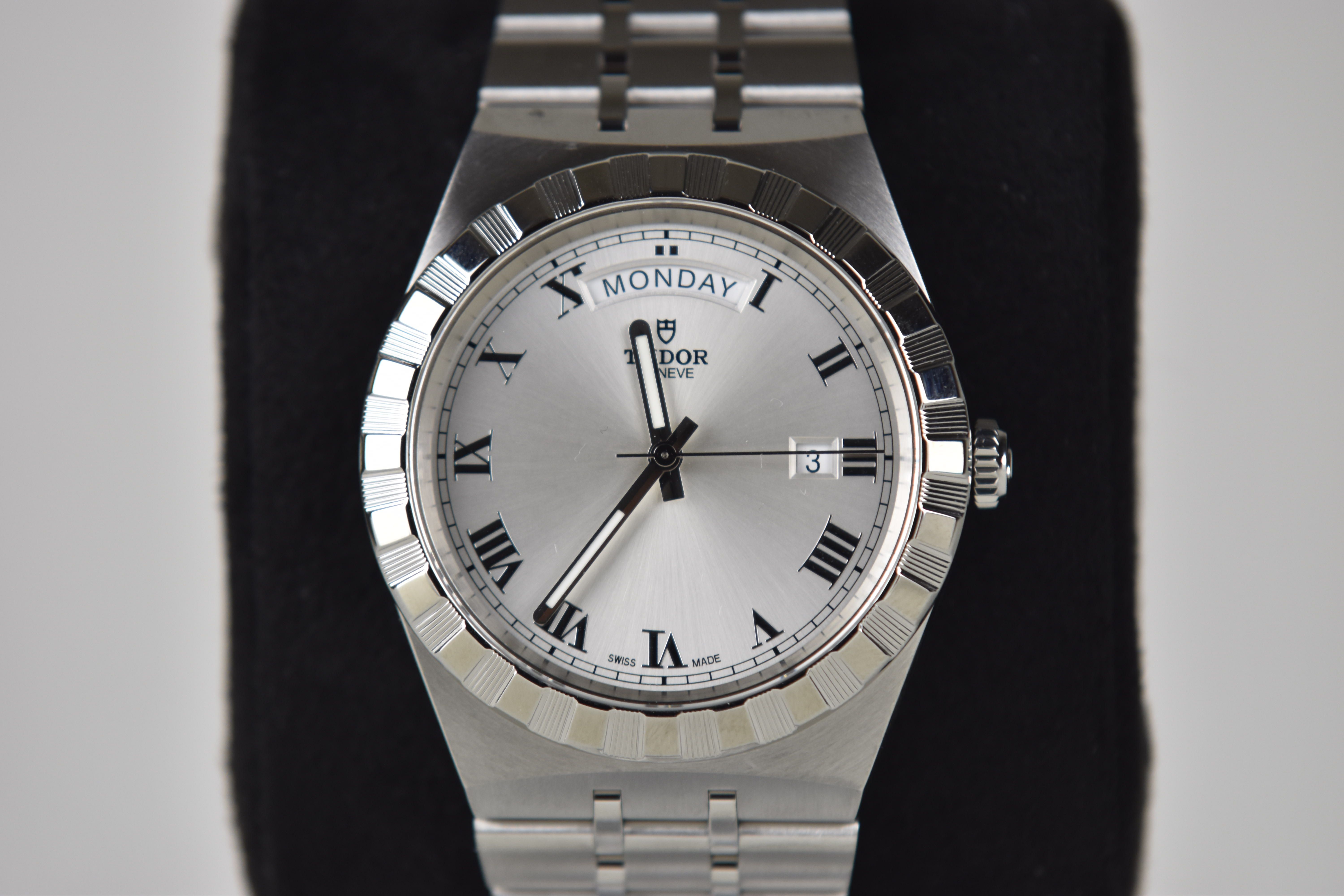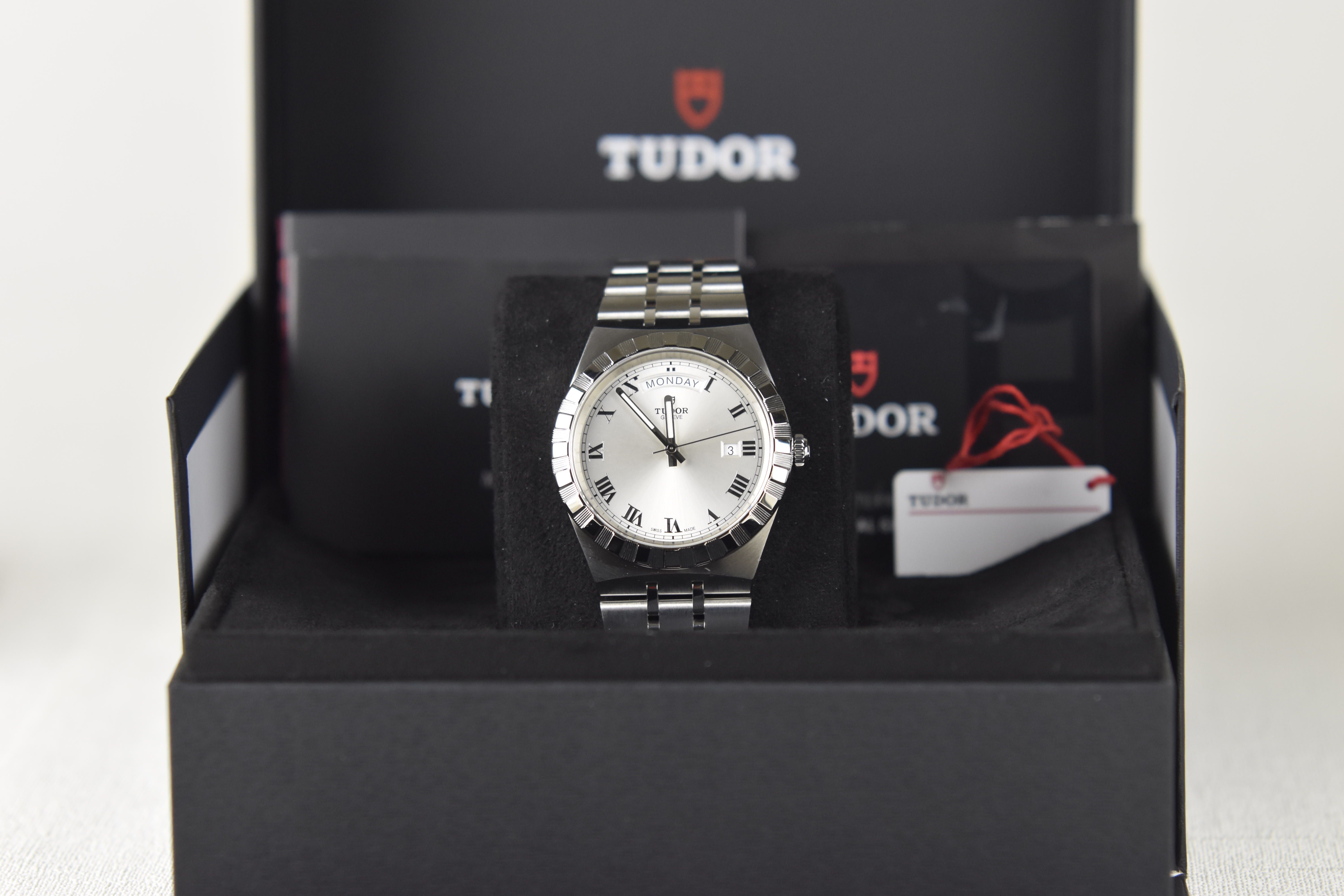 A refined and versatile everyday watch — the Tudor Royal with classic silver dial and Roman numerals — full set — factory fresh.