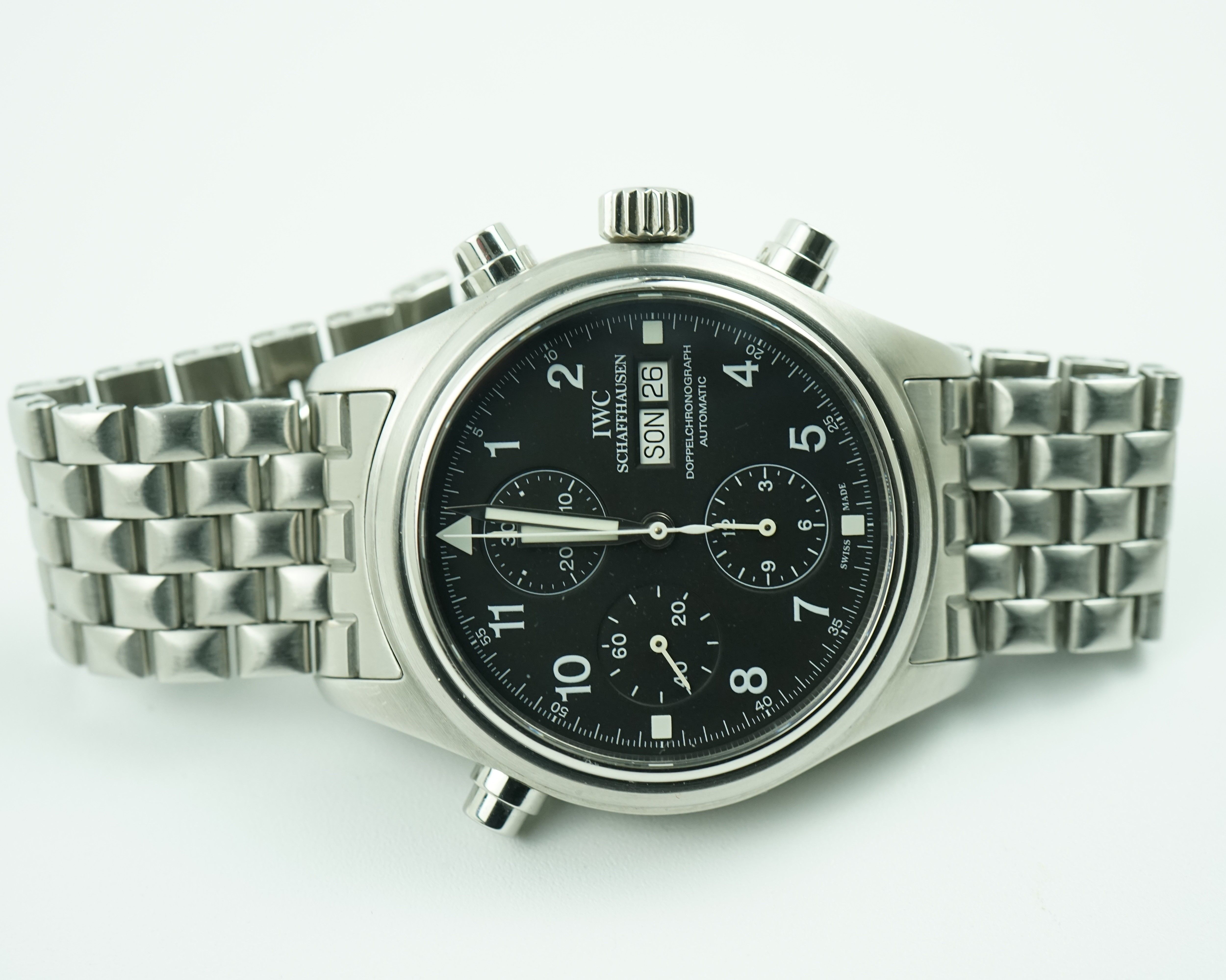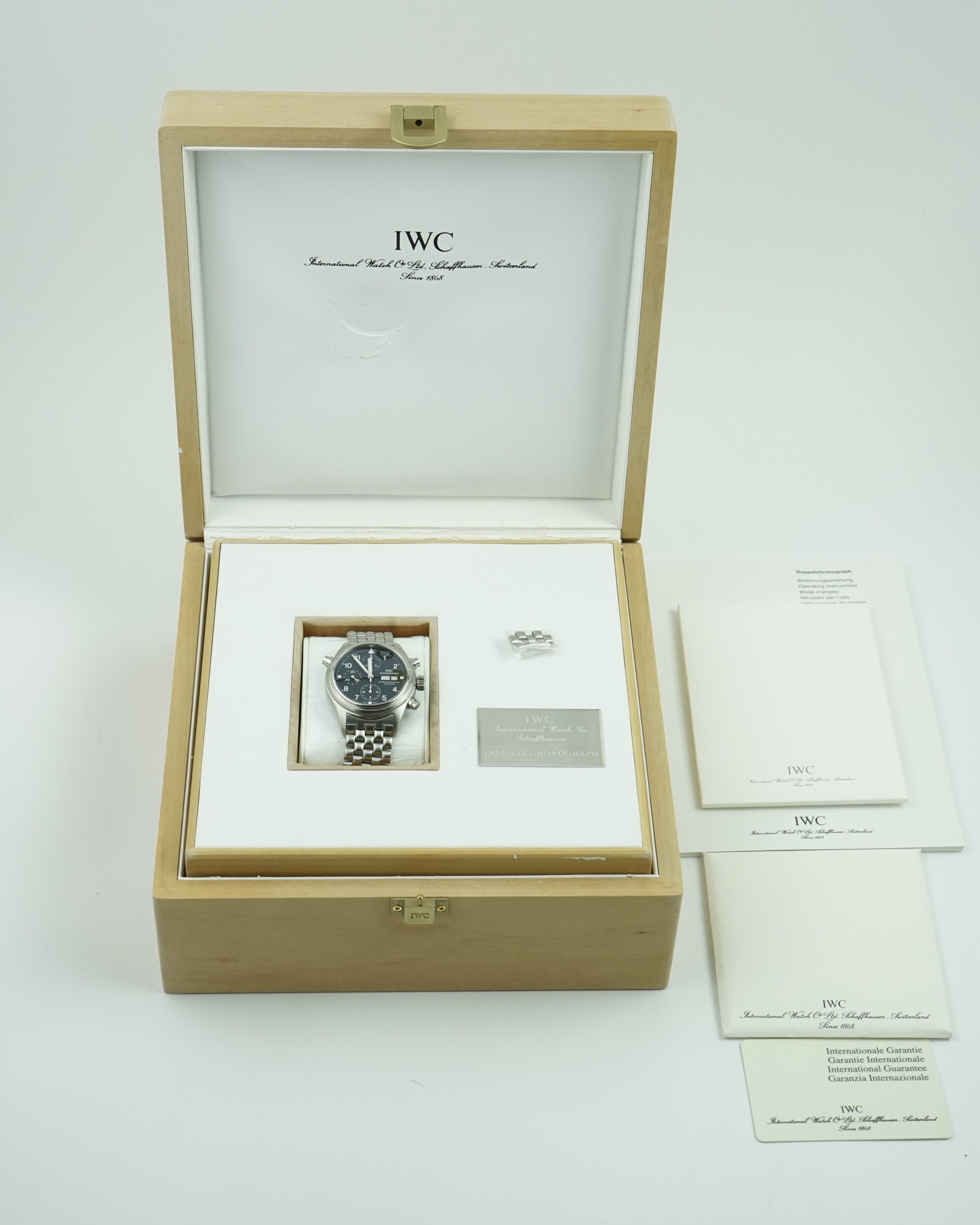 Wir von G-Watches freuen uns, euch einen IWC Doppelchronograph Referenz IW3713 mit Stahlband anbieten zu können. Dieses markante Modell steht für klassische IWC-Fliegeruhren-DNA und überzeugt mit sportlich-funktionalem Design sowie der charakteristischen Doppelchronograph-Funktion. Das Edelstahlgehäuse, das klar strukturierte Zifferblatt und das präzise Automatik-Chronographenwerk machen diese Uhr zu einem zeitlosen Begleiter mit technischer Raffinesse und hoher Alltagstauglichkeit.⚜️PRODUKTDETAILS⚜️