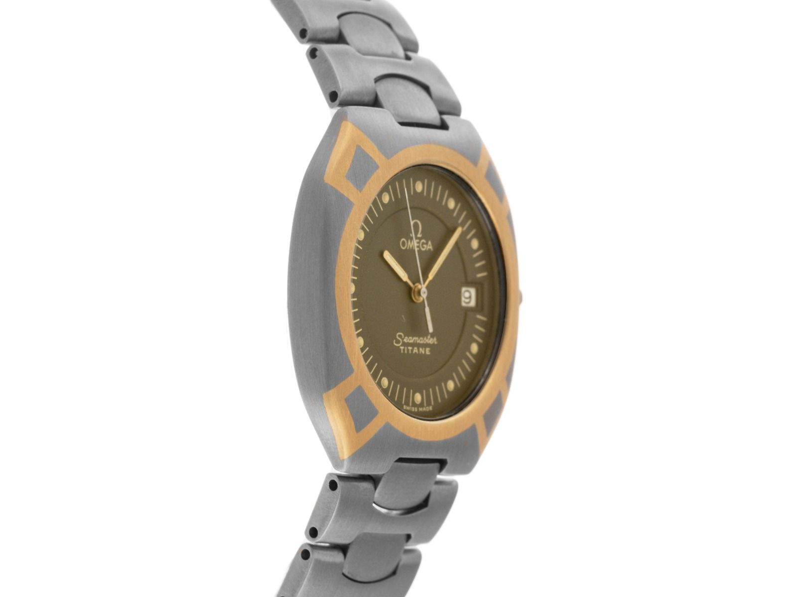 Omega Seamaster Polaris Titan 18kt Geelgoud Quartz Armband Titan Gehäuse Titan satijn, behuizingsafmetingen zonder kroon (L x B x H) 35,3 x 31 x 6,8mm. Lunette van Titan met 18kt Geelgouden inleg, satijn. Armband van Titan satijn, veiligheidsvouwsluiting van Titan met fabrikantlogo. Wijzerplaat grijs, stipindexen en geelgouden wijzers. Uurwerk quartz, kaliber Omega 1438 met 6 edelstenen. Weergave van uur, minuut en seconde via centrale wijzers met seconde-stop voor nauwkeurige tijdinstelling, datumaanduiding op 3 uur. Saffierglas krasbestendig. Kroon met fabrikantlogo. Achterkant van Titan gegraveerd. Gewicht van het horloge inclusief armband 63g, lengte van de armband inclusief behuizing 175mm. Referentienummer: 3961100.1, bouwjaar: 1989, behuizingsnummer: 51116XXX, ID: P233315420126H-3150, artikelnummer: 10000084364. Met gangcontrole, nieuwe batterij en volledige uiterlijke opfrissing van januari 2026. Originele Omega doos met omdoos en eerste aankoopfactuur evenals een uittreksel van het Watchregister van januari 2026, The Watch Register certificaat / zonder vermelding (Internationale database voor verloren of gestolen horloges). Superscherpe aanbieding, investering met waardevermeerderingspotentieel, zeer zeldzaam verzamelobject. Zeer goede staat. Leveringstijd onmiddellijk. Leveringstijd onmiddellijk. Inclusief certified pre owned zegel / horloge pas met een kleurenfoto, de exacte beschrijving en de vervangingswaarde van het horloge boven de 3150,-€ en 1000 dagen garantie vanaf de aankoopdatum.