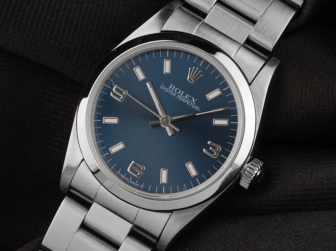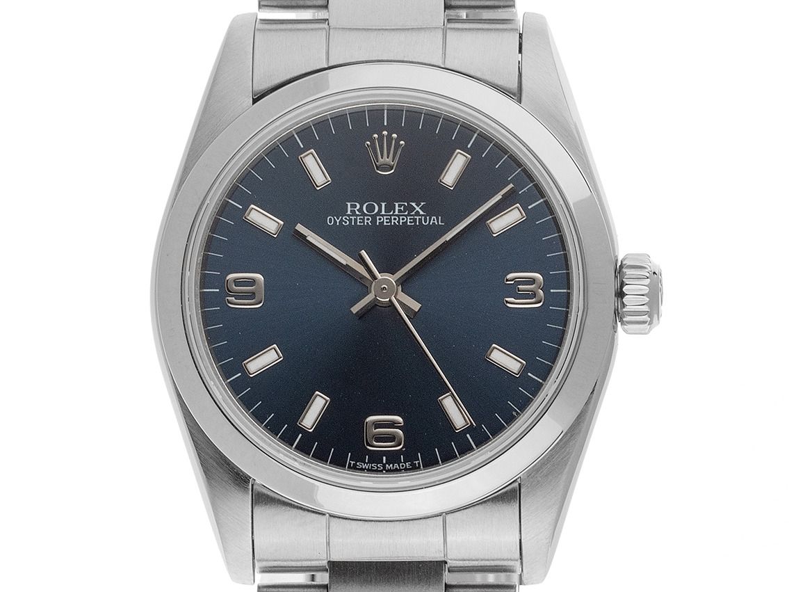 Rolex Oyster Perpetual Medium Stahl Automatik Armband OysterGehäuse Edelstahl poliert und satiniert, Gehäusedurchmesser ohne Krone 31mm, Gehäusehöhe 10,1mm. Lünette Edelstahl glatt und poliert. Armband Oyster Edelstahl satiniert, Faltschließe Edelstahl mit Hersteller-Logo. Zifferblatt blau mit "T SWISS Made T" Aufschrift bei 6 Uhr sowie aufgesetzten weißgoldenen Indexen, arabischen Ziffern und weißgoldenen Zeigern. Uhrwerk Automatik, Chronometer mit Zeugnis, Rolex Manufakturkaliber 2130 mit 29 Edelsteinen. Anzeige von Stunde, Minute und Sekunde über Zeiger aus der Mitte mit Sekundenstopp zur sekundengenauen Einstellung der Uhrzeit. Saphirglas kratzfest. Krone verschraubbar mit Hersteller-Logo. Boden Edelstahl verschraubt. Gewicht der Uhr inklusive Armband 72g, Länge des Armbandes inklusive Gehäuse 165mm. Referenznummer: 67480, Gehäusenummer: U615XXX, ID: KA177588120126H-7500, Artikelnummer: 10000084399. Mit Gangkontrolle und kompletter äußerlicher Aufarbeitung von Januar 2026. Original Rolex Box mit Umkarton und Garantie Papiere von August 1998, LC 400 / Hong Kong, Beschreibung, Ledermäppchen, Rolex Chronometer-Siegel, Übersetzungsheft und Watchregister Auszug von Januar 2026, The Watch Register Zertifikat / ohne Eintrag (Internationale Datenbank für verlorene oder gestohlene Uhren), Full Set. Superschnäppchen, sehr seltenes Sammlerstück, fast nicht getragen. Sehr guter Zustand. Lieferzeit sofort.