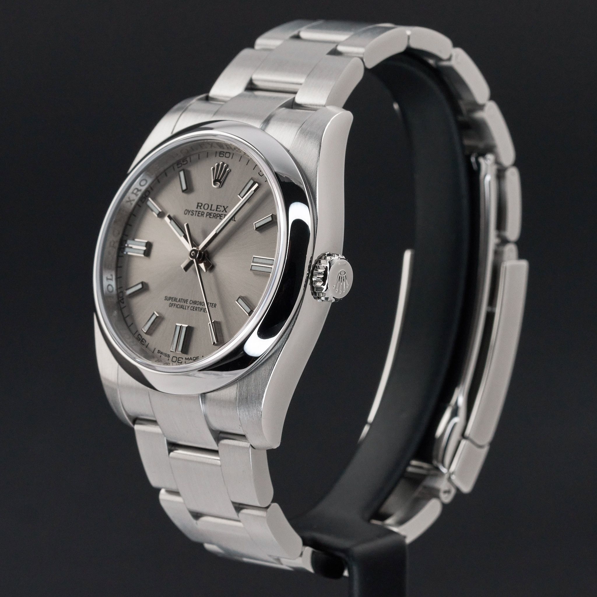 Deze Rolex Oyster Perpetual 116000 heeft een grijze wijzerplaat en is gemaakt van roestvrij staal, met een productiejaar van 2015.