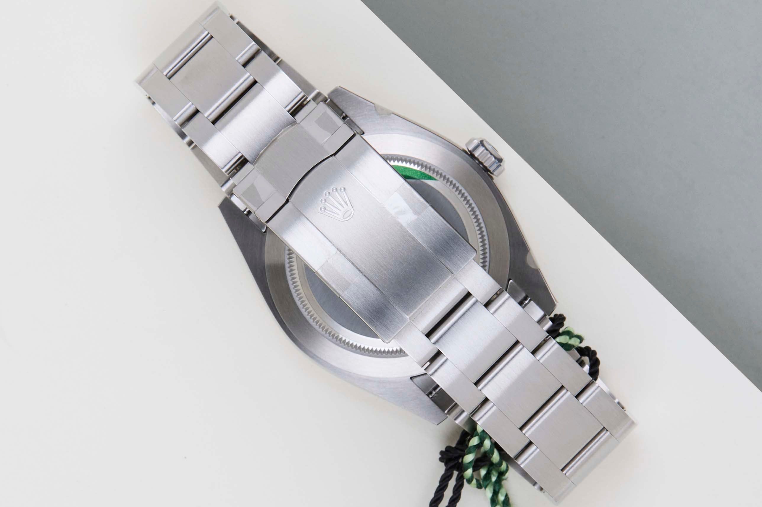 Het horloge is volledig gemaakt van roestvrij staal. Rolex gebruikt 904L in zijn stalen horloges, wat een extreem resistente en hoog polijstbare superlegering is.