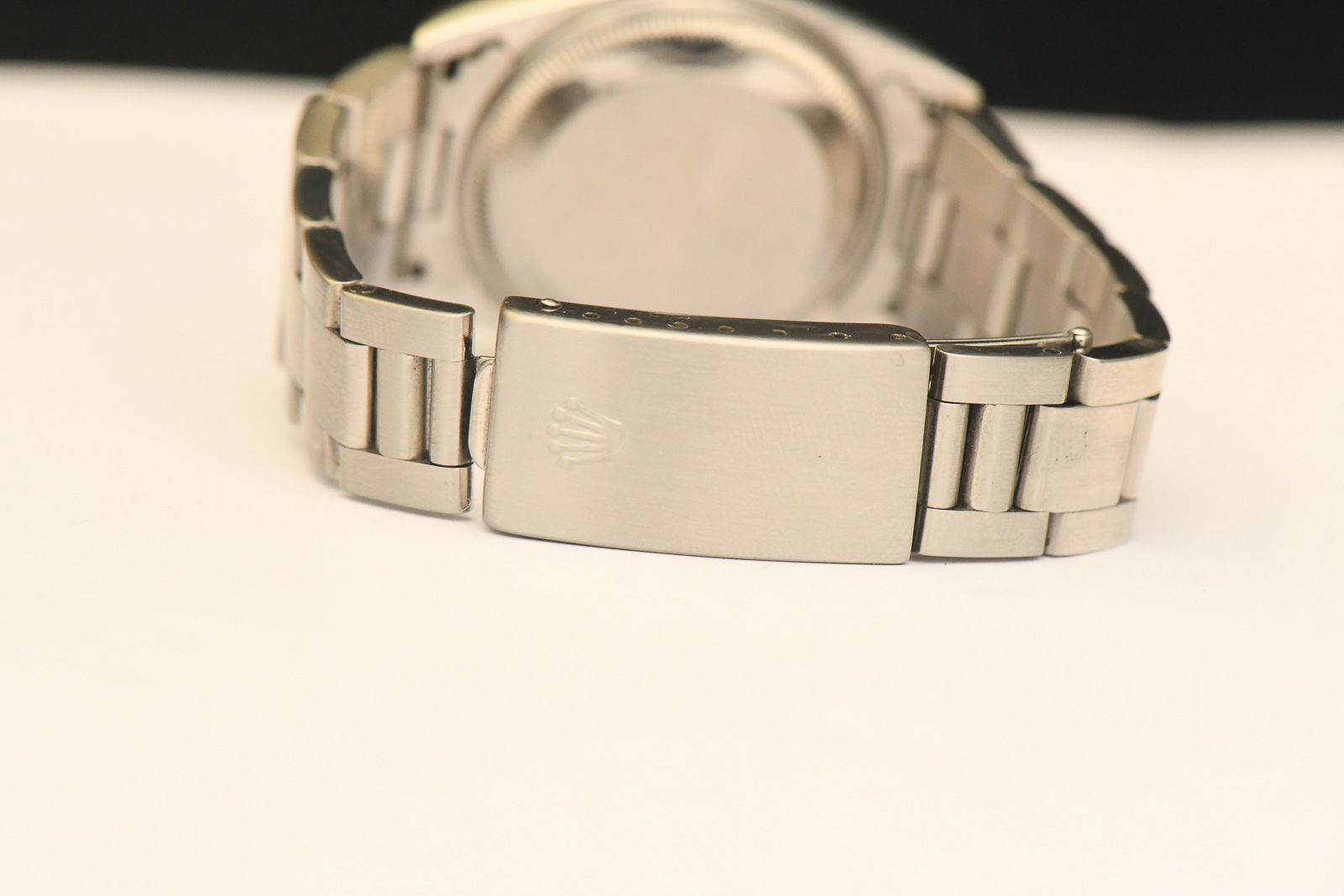 ROLEX Air King 1995 Rolex Referentie 14000 met roze wijzerplaat. Rolex Air King uit het midden van de jaren '90 met de gewilde roze wijzerplaat. Met zijn roze/salmonkleurige wijzerplaat en gladde bezel is deze Air King zeer discreet en elegant en kan hij gemakkelijk worden gecombineerd met verschillende sieraden en outfits. Deze elegante Rolex heeft al de ‘NO HOLE’ kast, dat wil zeggen zonder doorboorde lugs. Met een diameter van 34 mm is de kast optimaal geproportioneerd voor kleinere polsen van elk geslacht. De band van referentie 78350 heeft de sluitcode W11 (november 1995) en past daardoor perfect in het jaar 1995. Technisch gezien is het uurwerk in goede staat en is er in de nabije toekomst geen onderhoud nodig.