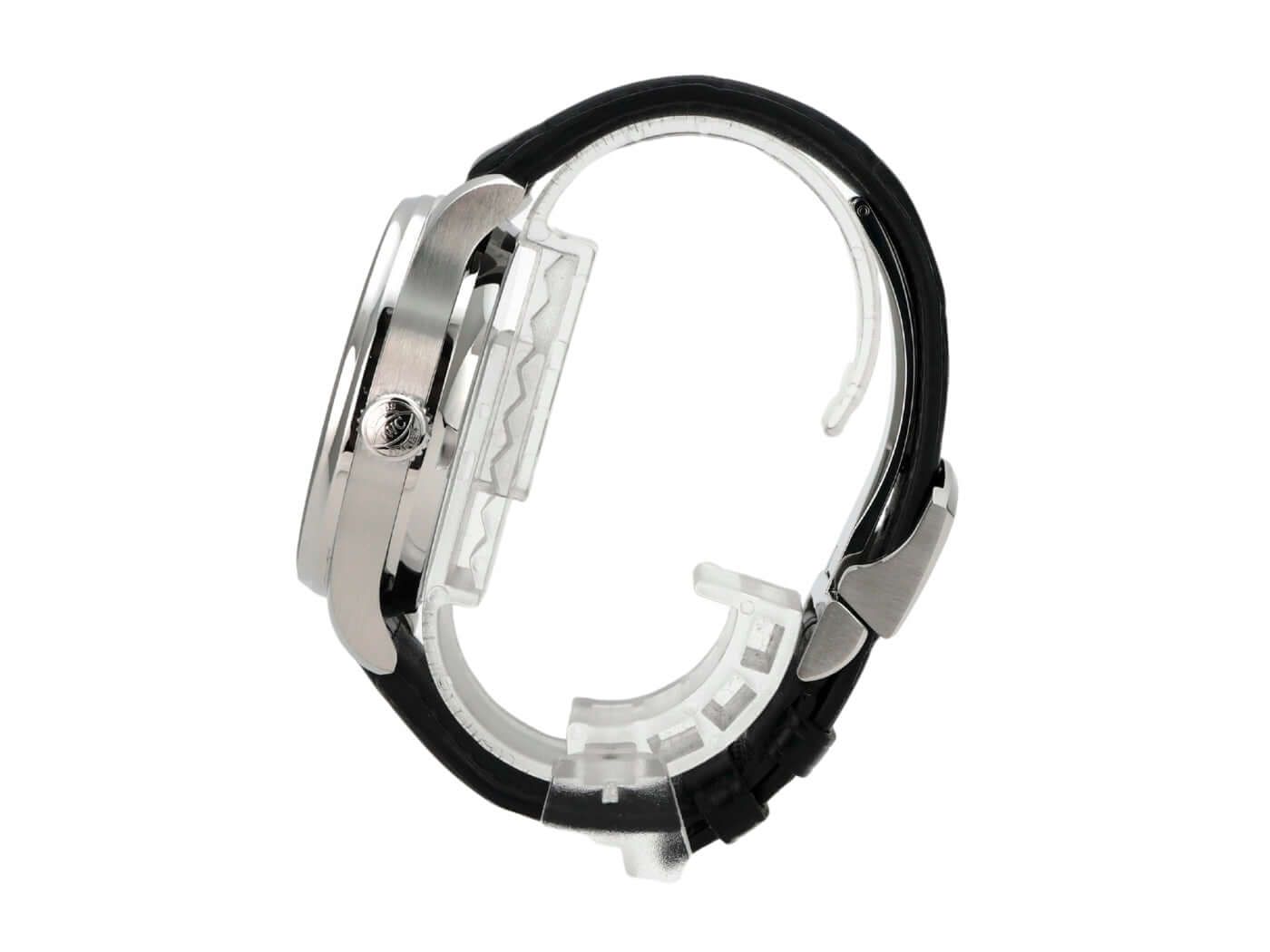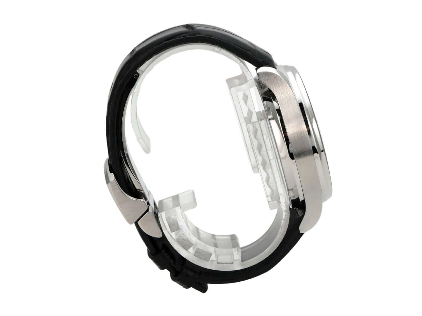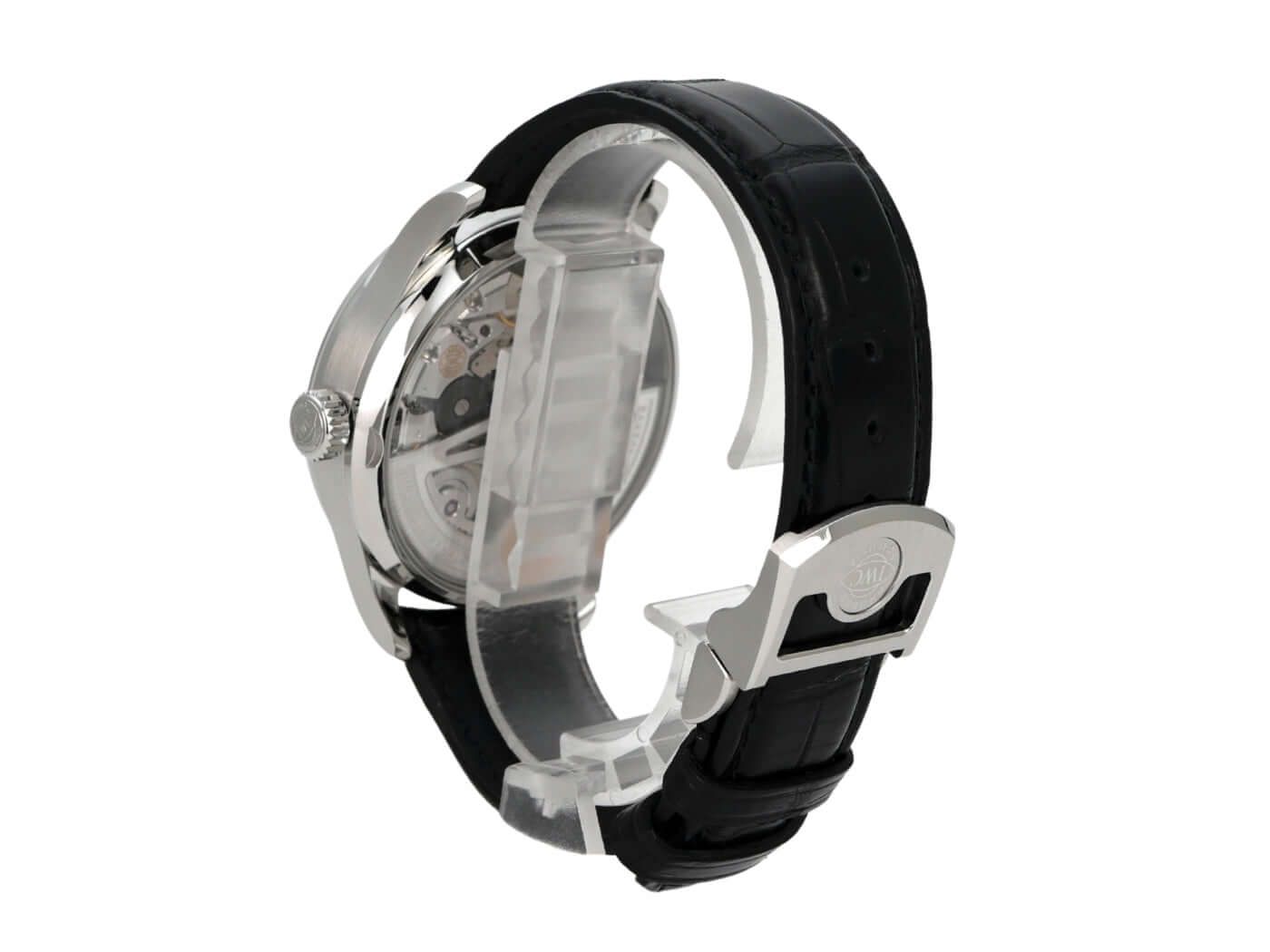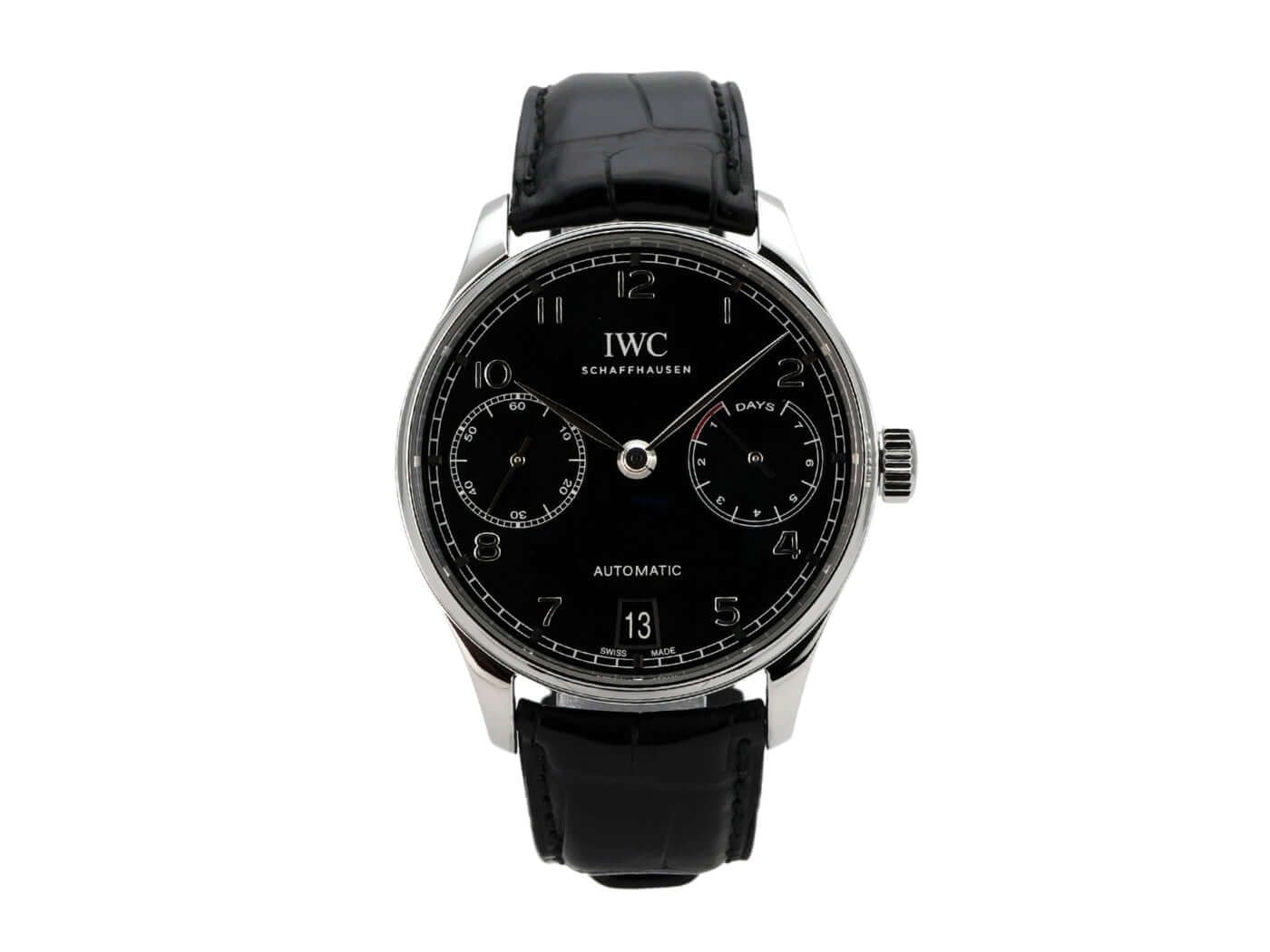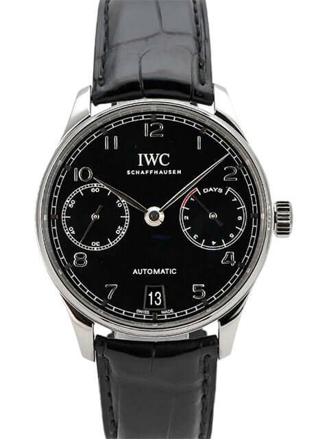 IWC Portugieser Automatic 7 Days Ref. IW500703 from 2017Case made of polished and satin-finished stainless steel, case diameter 42.3 mm, case height 14.5 mm, black dial, black leather strap with folding clasp, IWC manufacture caliber 52010, automatic Pellaton winding, Breguet spring, power reserve of 168 hours when fully wound, rotor with 18-carat gold medallion, power reserve indicator, date, anti-reflective sapphire glass, sapphire glass see-through back, water-resistant up to 3 bar