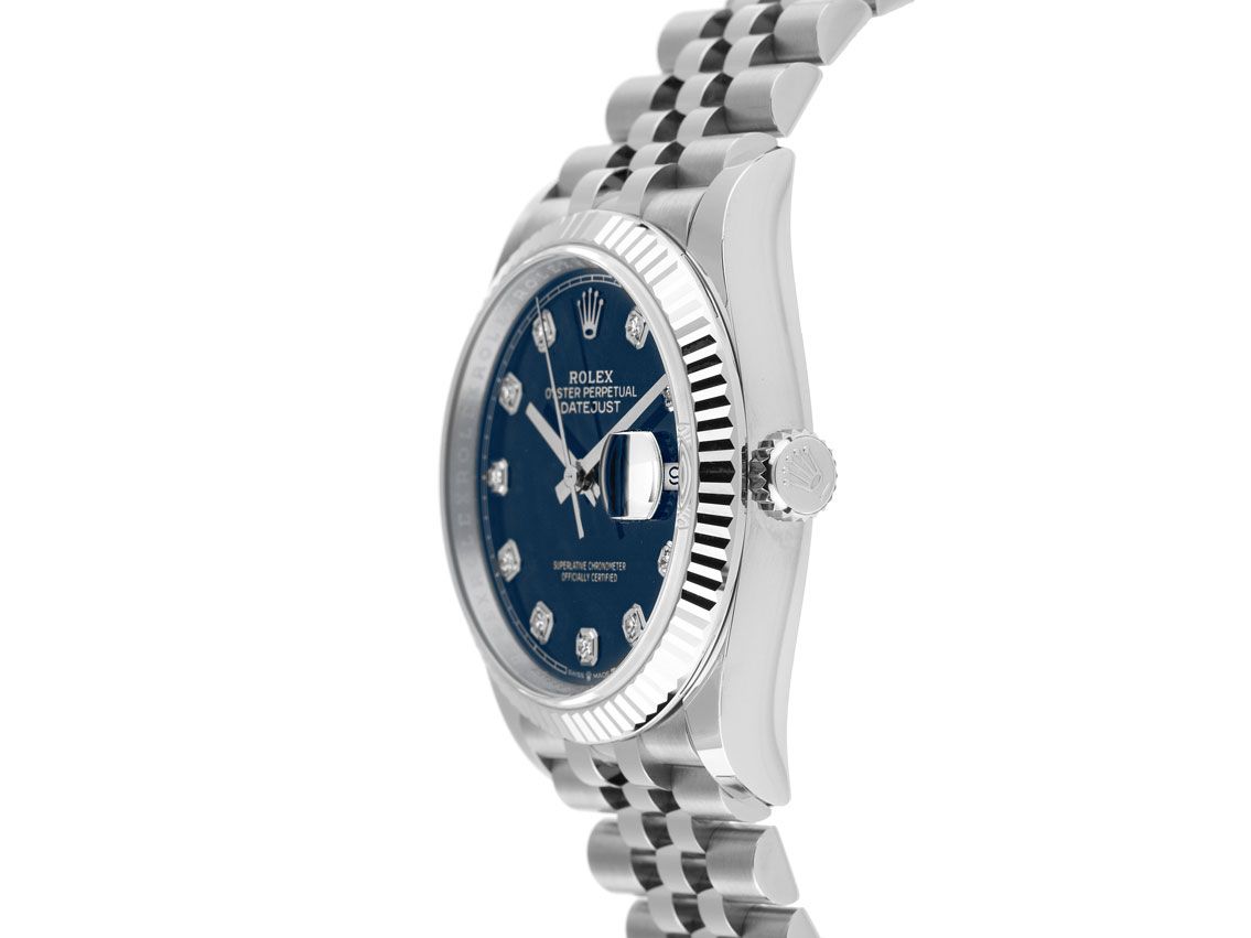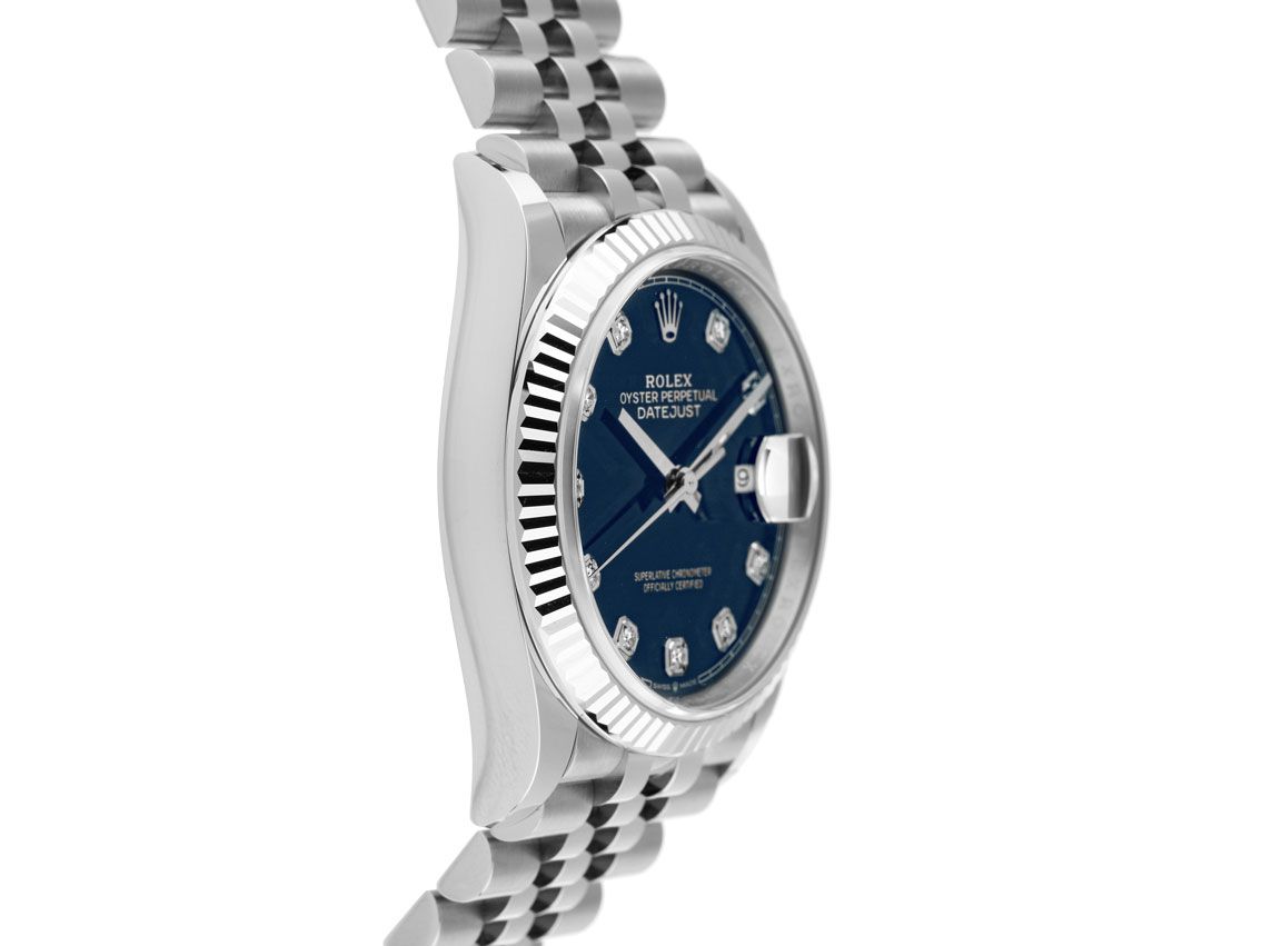 Gehuis van gepolijst en gesatineerd staal, behuizingsdiameter zonder kroon 36mm, behuizingshoogte 11,6mm. Lunette van 18kt witgoud, geribbeld en gepolijst. Jubileearmband van gepolijst en gesatineerd staal, vouwsluiting van staal met fabrikantlogo. Wijzerplaat blauw met 10 opgezette diamantindexen en witgouden wijzers. Uurwerk automatisch, chronometer met certificaat, Rolex manufactuurkaliber 3235 met 31 edelstenen, gangreserve van ongeveer 70 uur. Weergave van uur, minuut en seconde via centrale wijzers met seconde-stop voor nauwkeurige tijdinstelling, datumaanduiding met snelle instelling onder vergrootglas op 3 uur. Saffierglas krasbestendig. Kroon schroefbaar met fabrikantlogo. Achterkant van staal, geschroefd. Gewicht van het horloge inclusief armband 118g, lengte van de armband inclusief behuizing 170mm. Waterdicht tot 10 ATM. Referentienummer: 126234, behuizingsnummer: J3Y79XXX, ID: KJ1783240000126H-15800, artikelnummer: 10000084562. Met gangcontrole en volledige uiterlijke opfrissing van januari 2026. Originele Rolex doos met omdoos en garantiepapieren van juni 2021, nieuwe Rolex garantiekaart zonder landcode, evenals beschrijving, lederen etui, Rolex chronometerzegel en uittreksel van het horloge-register van januari 2026, The Watch Register certificaat / zonder vermelding (Internationale database voor verloren of gestolen horloges), Full Set. Als nieuw. Leveringstijd direct.