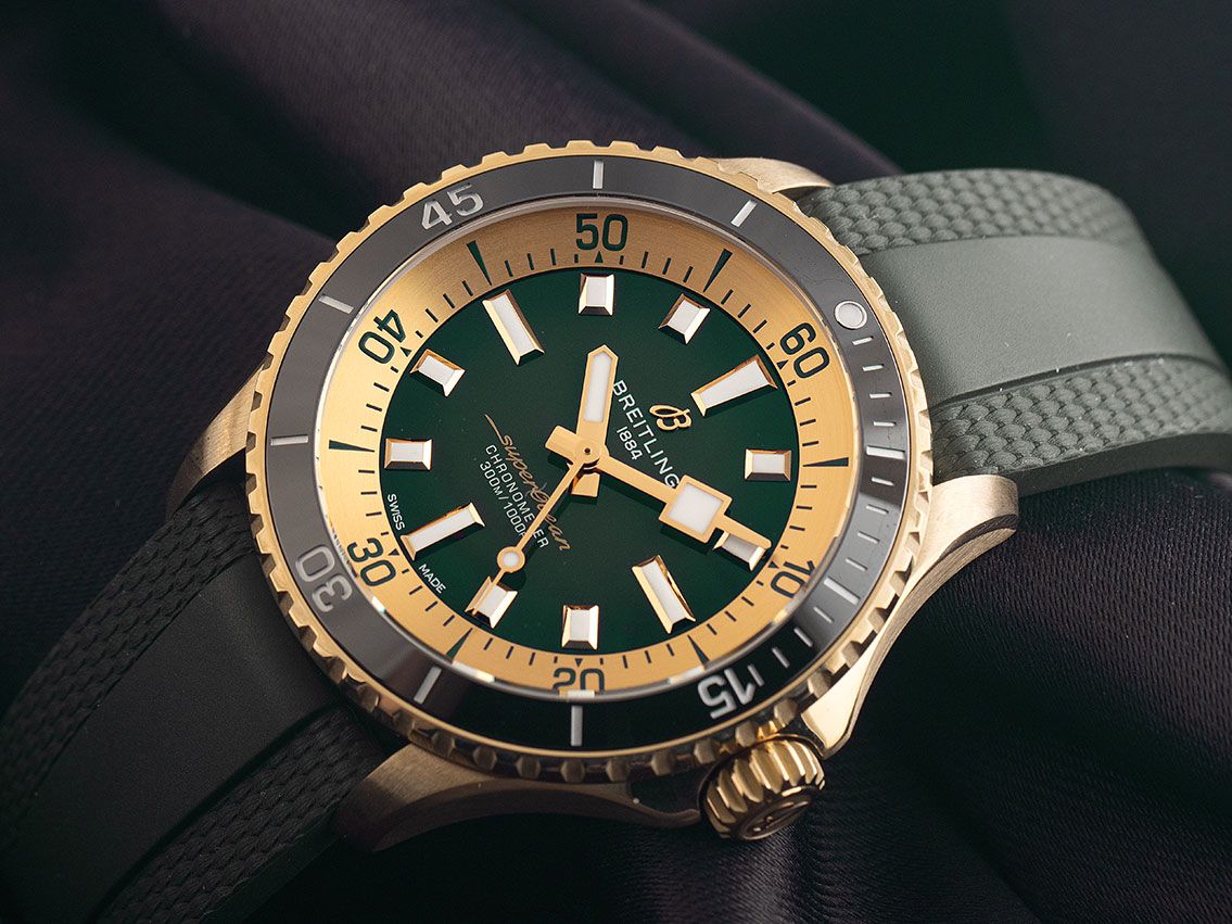 Gehäuse van gepolijst en gesatineerd brons, Gehäusedurchmesser zonder kroon 42mm, Gehäusehöhe 12,5mm. Lünette van geribbeld brons met zwarte inlay en 60-minuten schaal, eenzijdig draaibaar. Armband van groen rubber, Anstoßbreite 22mm, veiligheidsvouwsluiting van brons met fabrikantlogo. Zifferblatt in een groene verloopkleur met geelgouden luminescerende indexen en geelgouden luminescerende wijzers. Uhrwerk Automatik, Chronometer met certificaat, Kaliber Breitling 17 met 26 edelstenen, gangreserve van ongeveer 38 uur. Weergave van uur, minuut en seconde via centrale wijzers met seconde-stop voor nauwkeurige tijdinstelling. Saffierglas, krasbestendig, dubbelzijdig anti-reflecterend en gebombardeerd. Kroon met schroefdraad en flankbescherming, inclusief fabrikantlogo. Achterkant van brons, geschroefd en gegraveerd. Gewicht van het horloge inclusief armband 125g. Waterdicht tot 30 ATM. Referentienummer: N17375201L1S1, Gehäusenummer: 6708XXX, ID: P241430000126H-6300, Artikelnummer: 10000084565. Originele Breitling doos en garantiepapieren van juni 2023, evenals beschrijving en Watchregister uittreksel van januari 2026, The Watch Register certificaat / zonder vermelding (Internationale database voor verloren of gestolen horloges), inclusief originele aankoopfactuur, Full Set. Als nieuw. Leveringstijd onmiddellijk.