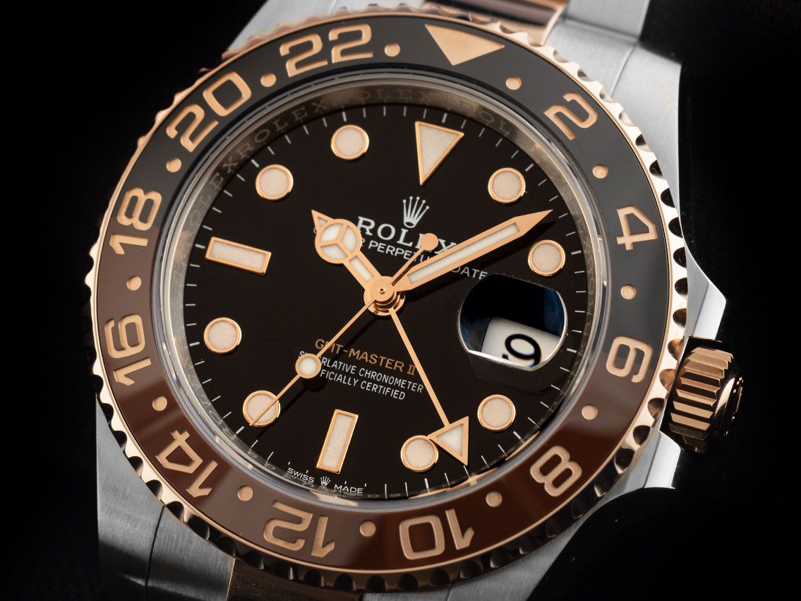 Rolex GMT Master II Rootbeer Stahl 18kt Roségold Everose Keramik Automatik Armband OysterGehäuse Edelstahl poliert und satiniert, Gehäusedurchmesser ohne Krone 40mm, Gehäusehöhe 11,9mm. Lünette 18kt Roségold Everose gerädelt mit braun / schwarzem Keramik Inlay, graviert mit roségoldener 24-Stunden Skala, beidseitig drehbar. Armband Oyster Edelstahl / 18kt Roségold Everose poliert und satiniert, Sicherheitsfaltschließe Edelstahl / 18kt Roségold Everose mit Hersteller-Logo. Zifferblatt schwarz mit aufgesetzten in Roségold gefassten Leuchtindexen und Leuchtpunkten sowie roségoldenen Leuchtzeigern. Uhrwerk Automatik, Chronometer mit Zeugnis, Rolex Manufakturkaliber 3285 mit 31 Edelsteinen, Gangreserve ca. 70 Stunden. Anzeige von Stunde, Minute und Sekunde über Zeiger aus der Mitte mit Sekundenstopp zur sekundengenauen Einstellung der Uhrzeit, Datumsanzeige mit Schnellverstellung unter Glaslupe bei 3 Uhr, zweite Zeitzone (GMT) ablesbar über Lünette, einstellbar über roségoldenen Zeiger mit Leuchtspitze aus der Mitte. Saphirglas kratzfest. Krone verschraubbar mit Flankenschutz und Hersteller-Logo. Boden Edelstahl verschraubt. Gewicht der Uhr inklusive Armband 162g, Länge des Armbandes inklusive Gehäuse 175mm. Wasserdicht bis 10 ATM. Referenznummer: 126711CHNR, ID: P2439335000226H-23800/18900, Artikelnummer: 10000084599. Original Rolex Box mit Umkarton und Garantie Papiere von August 2022, neue Rolex Garantie Karte ohne Ländercode sowie Beschreibung, Ledermäppchen, Rolex Chronometer-Siegel und Watchregister Auszug von Februar 2026, The Watch Register Zertifikat / ohne Eintrag (Internationale Datenbank für verlorene oder gestohlene Uhren), inkl. Erstkaufrechnung, Full Set. Superschnäppchen, Kapitalanlage mit Wertsteigerungspotential. Ungetragen. Lieferzeit sofort.