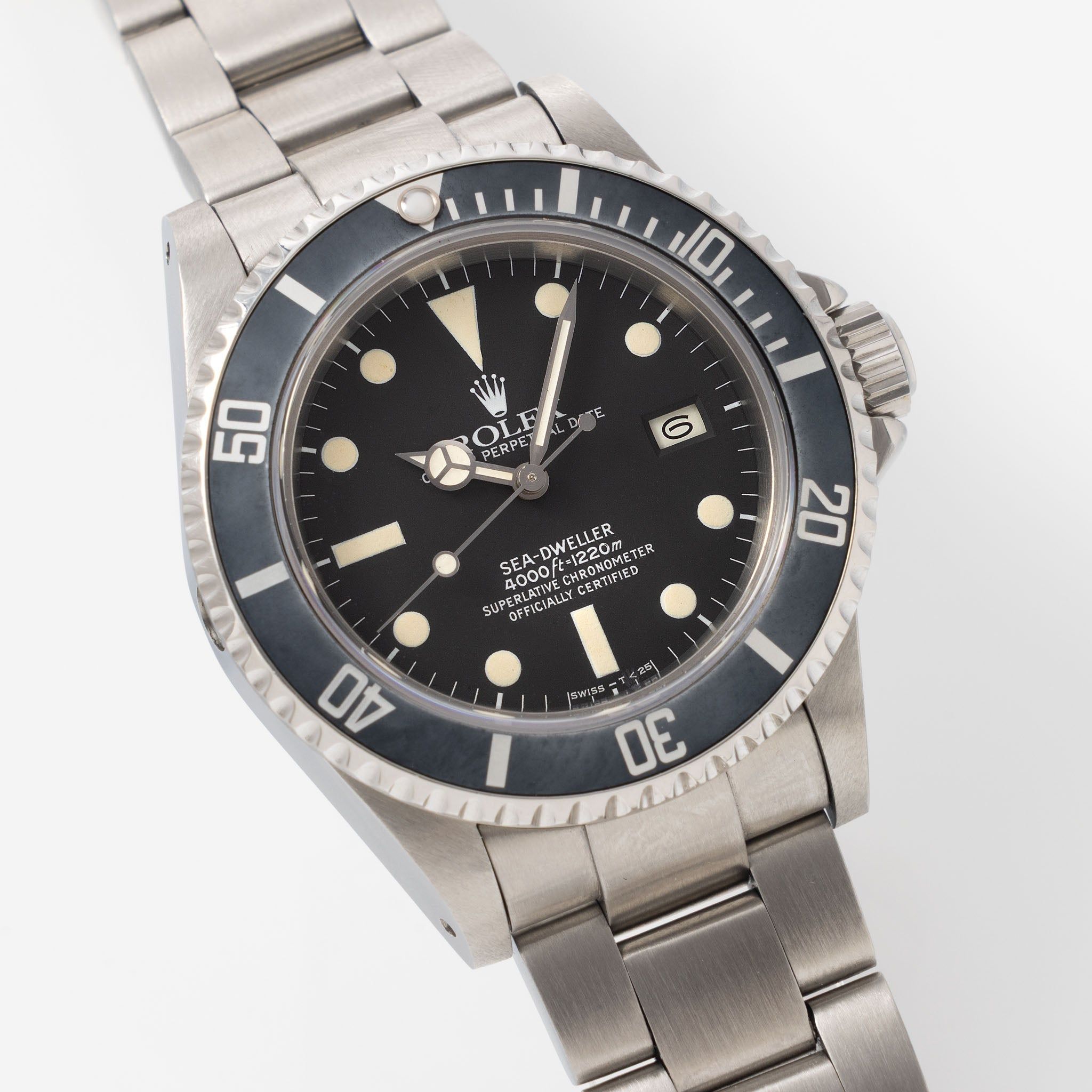 With this Sea-Dweller, also nicknamed the “Triple Six,” Rolex doubled the depth rating to 4,000 ft thanks to its larger helium escape valve and sapphire crystal, compared to its predecessor, reference 1665. Furthermore, Rolex introduced a unidirectional bezel for diver safety, making this Sea-Dweller a true transitional model. This example features a rare matte dial, used in the first production batch before Rolex later switched to glossy dials with white gold–surrounded indexes. The dial has developed a lovely vanilla-toned patina on the hour plots and hands. The watch retains a thick case and stands out with a beautifully faded grey bezel insert fitted with a luminova pearl. Attached to the watch head is an Oyster bracelet, reference 93160, with solid end links stamped 592 and a clasp stamped “G”. We love these Sea-Dwellers for their no-nonsense, straightforward, purpose-built tool-watch vibe, and they are easily suited for everyday wear. This watch has been fully checked and regulated by our watchmaker. If you’re looking to add a proper tool-watch icon to your collection, this Sea-Dweller is well worth a closer look.Get in touch with us for further details ,or to arrange a viewing—either in our lounge or via video call. Specifications: Rolex Reference 16660 Sea-dweller 40mm steel case with helium escape valve Rare matte dial with vanilla colour patina on plots and hands 40mm steel case with helium escape valve Serial 747xxxx dating to 1983 Solid link Rolex Oyster bracelet ref. 93160 with Solid End links Fully checked and regulated by our watchmaker 1 year mechanical warranty Free worldwide Fedex Priority shipping