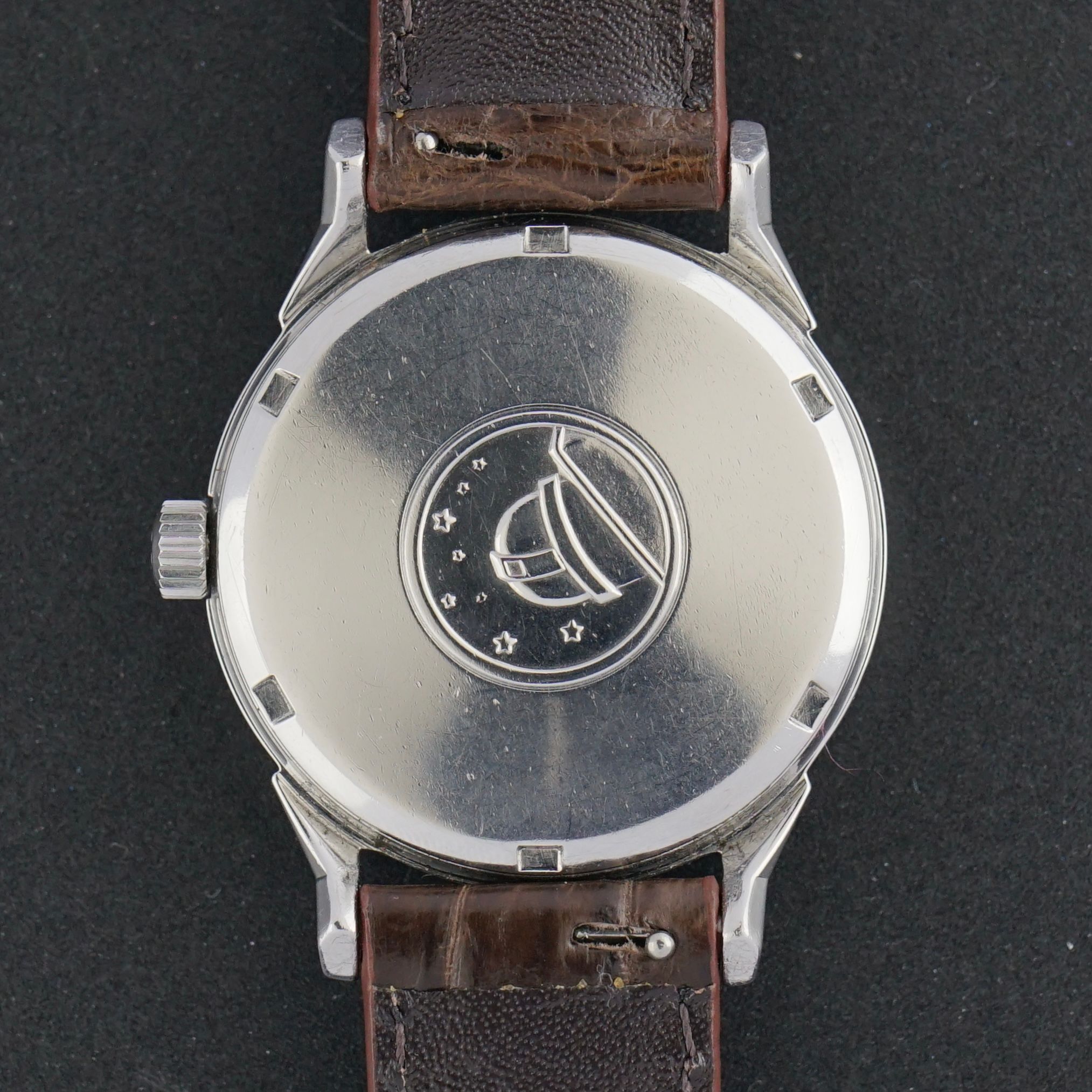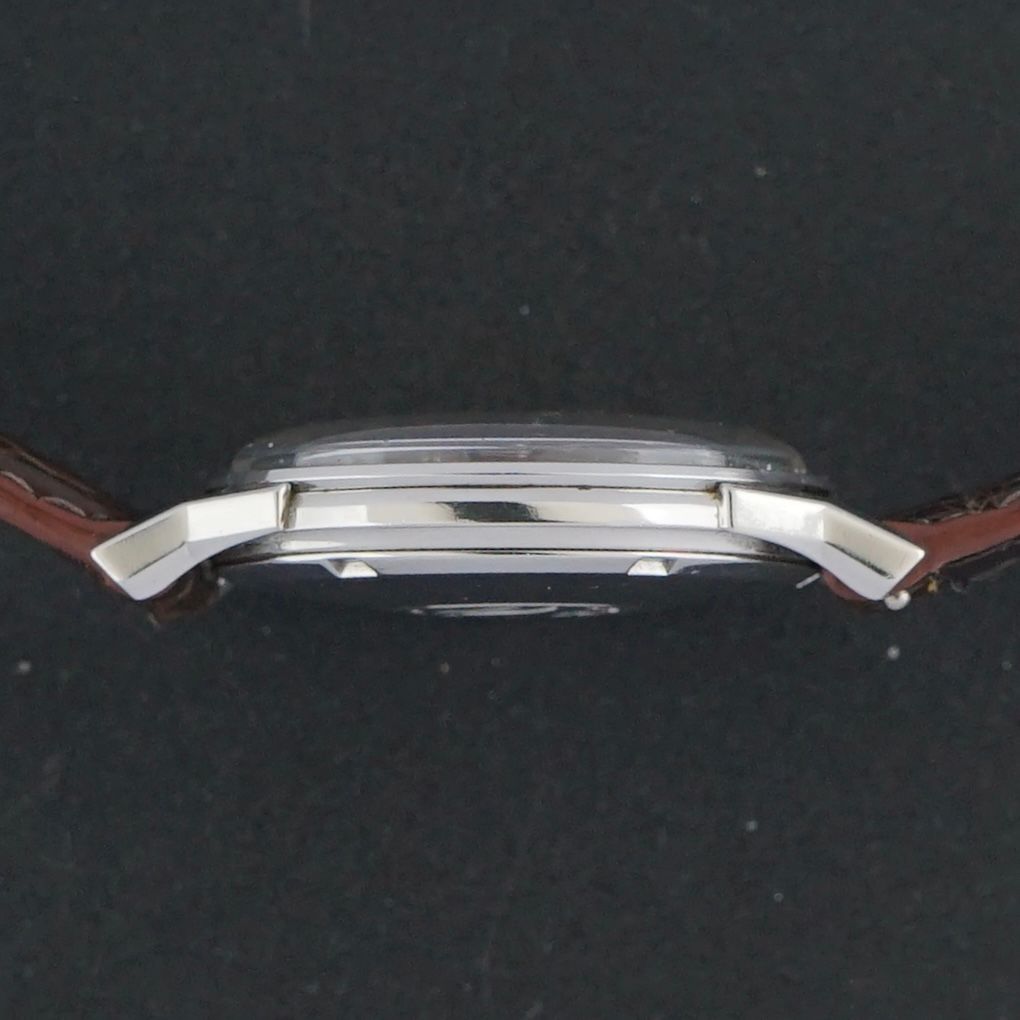Deze vintage Omega Constellation pie pan met dog leg lugs werd geproduceerd in 1966. Hij heeft een oorspronkelijk witte wijzerplaat die een gelijkmatige en aantrekkelijke patina heeft ontwikkeld over de hele wijzerplaat. De kast meet 34 millimeter in breedte, exclusief de kroon, maar dankzij de stevige dog leg lugs met een lengte van 43 millimeter van boven naar beneden, voelt hij aanzienlijk groter aan om de pols dan een typische 34 millimeter horloge. Binnenin bevindt zich het kaliber 561 automatische uurwerk, dat in februari 2026 is onderhouden en momenteel geweldig loopt en functioneert. Het horloge is voorzien van een bruine top grain leren band met een krokodillenmotief. De originele decagonale kroon is vervangen door een andere originele Omega kroon, omdat deze vaak extreem moeilijk te draaien zijn, wat resulteert in een volledig functioneel en prachtig vintage Omega horloge.