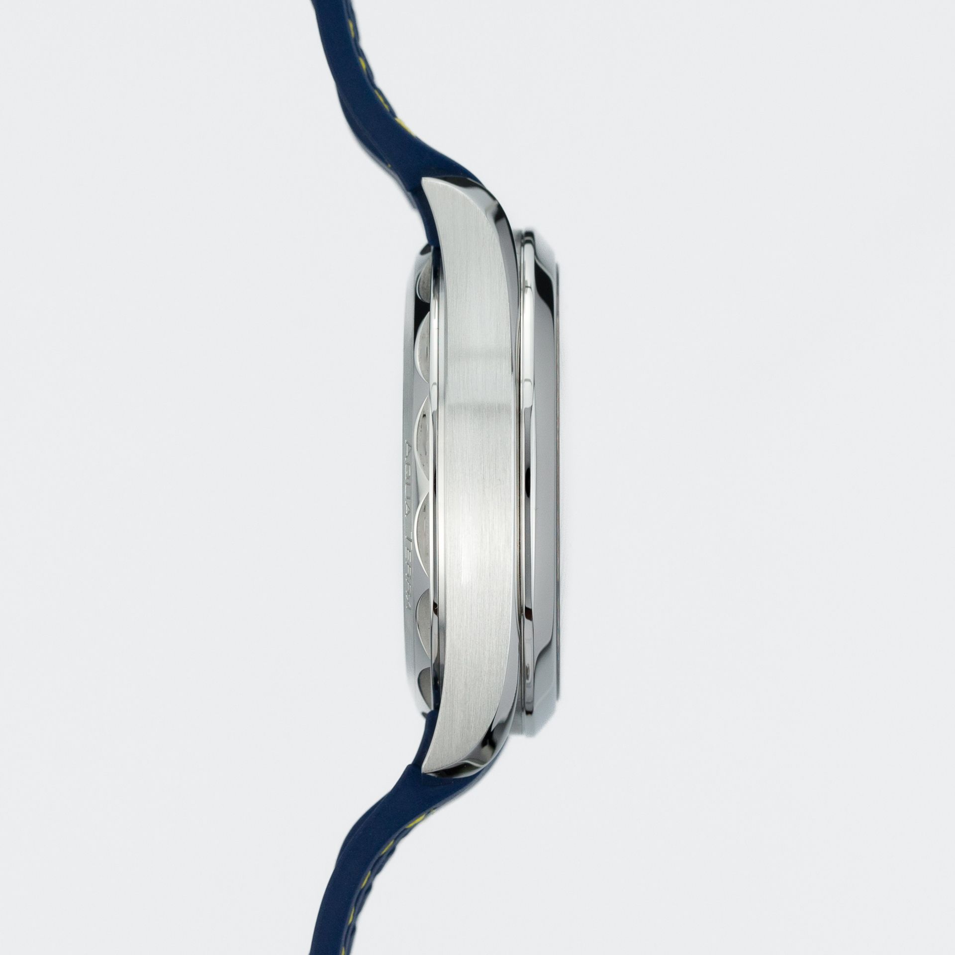 The deep blue dial with a teak deck-like texture offers excellent contrast thanks to the applied hour markers and the intriguingly shaped hands. The seconds hand is in a signal yellow color and this contrasts very well with the main base of the dial – the same color is used for several other accents. The date window is positioned at the new location for the series at "6 o'clock", the hands are faceted, and the stunning effect is finalized with the contrasting accents. One of the things that is almost impossible to show in its full beauty in photos (at least not within my power and skills) are the different dimensions of the dial. All this splendor is observed exceptionally well thanks to the slightly domed sapphire crystal with double anti-reflective coating – in certain positions, the crystal seems to be missing and you could touch the hands without anything stopping you. The bezel is smooth, fixed, and seems to lend security and protection to the entire magnificence of the watch, and together with the ribbed crown, they solidify its overall presentation.