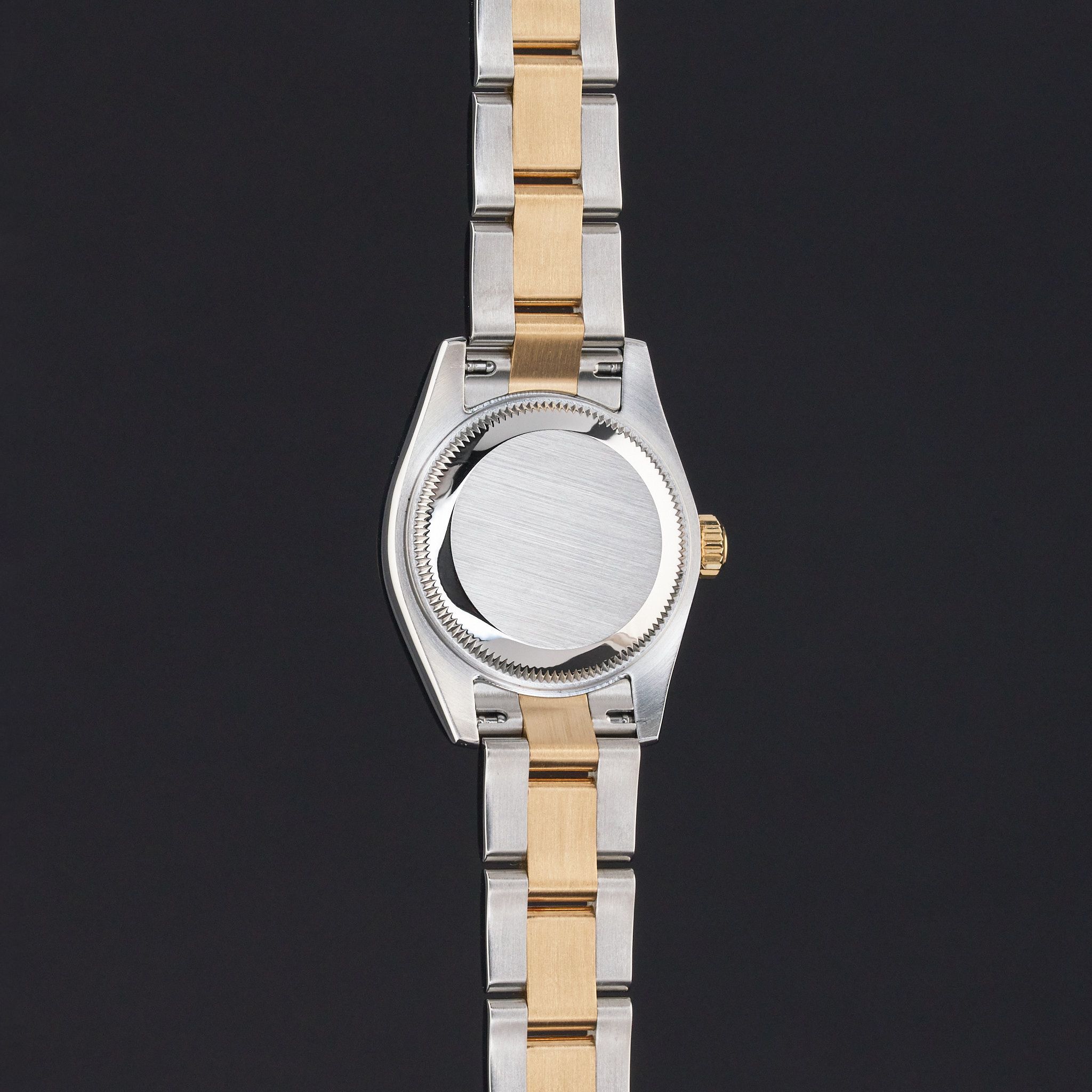 - Lichte gebruikssporen zoals haarlijntjes of kleine oppervlakkige krasjes. Kast, bezel en band behouden hun scherpe randen en oorspronkelijke vorm. Mogelijk professioneel gepolijst zonder de originele contouren aan te tasten. Mechanisch volledig functioneel.