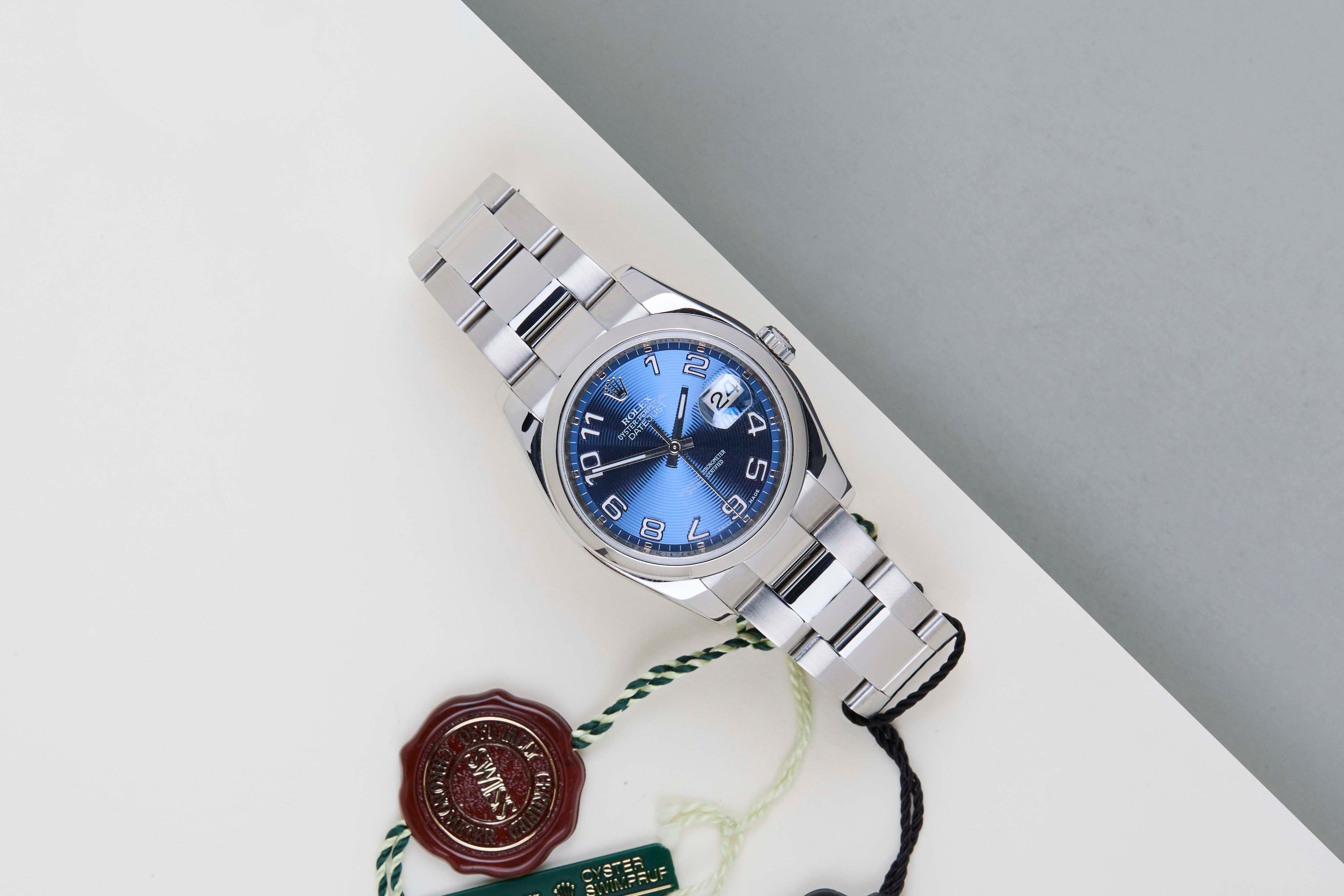 Full Set | Roulette Date | Including Rolex Green TagRolex introduced the original Datejust in 1945 to celebrate the company's 40th anniversary. Due to the various case sizes and materials, the Datejust has been ingrained in Rolex's history and remains incredibly popular for 75 years.This Rolex Datejust 'Blue Concentric Dial - Oyster' was sold for the first time in February 2009.This Datejust is made of Rolex' 904L stainless steel and is fitted with an Oyster bracelet.This Rolex Datejust 36 is in Mint condition and comes with the original Rolex Warranty Card and box. Furthermore, the watch comes with One Year of Steiner Warranty.