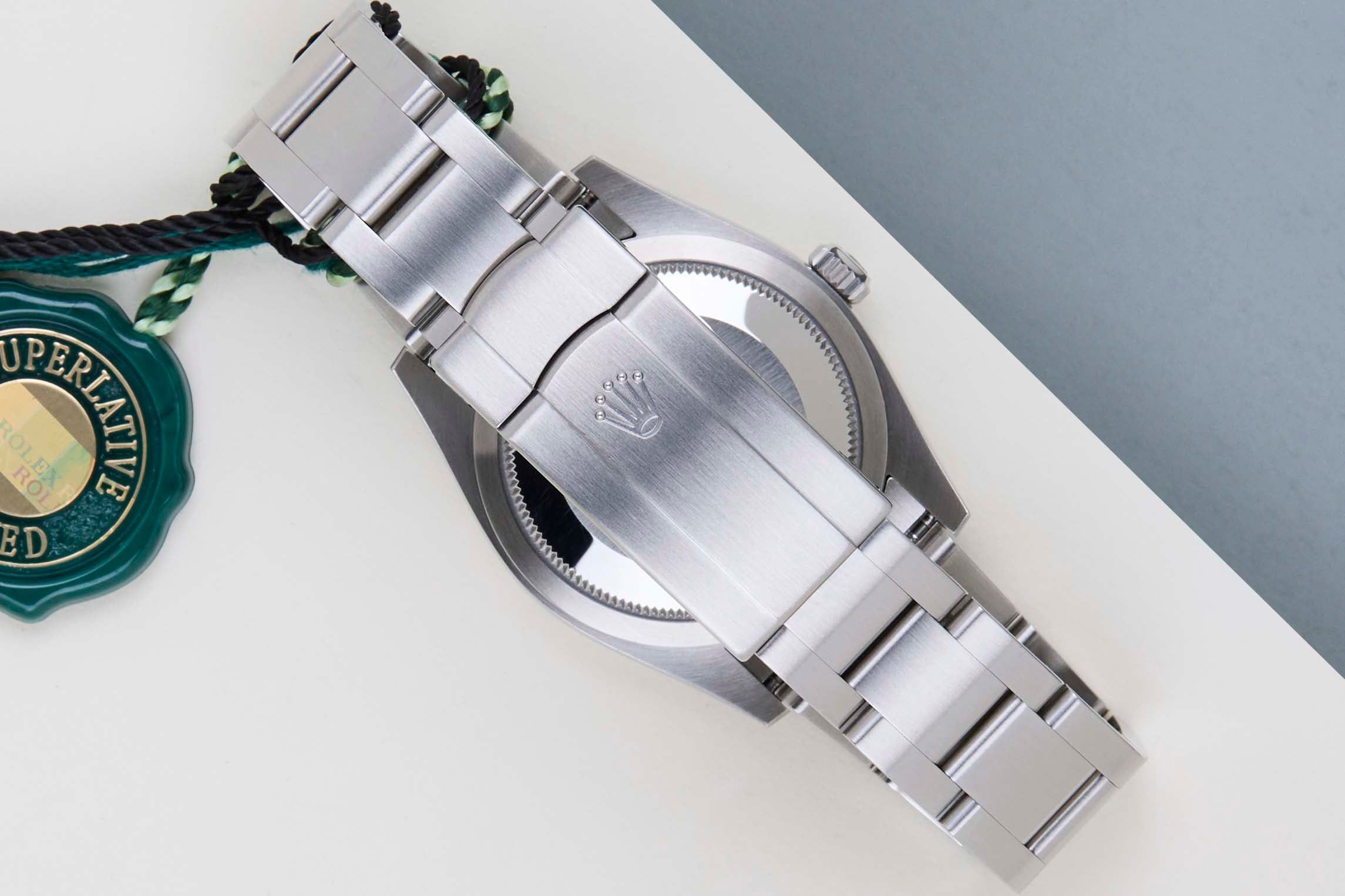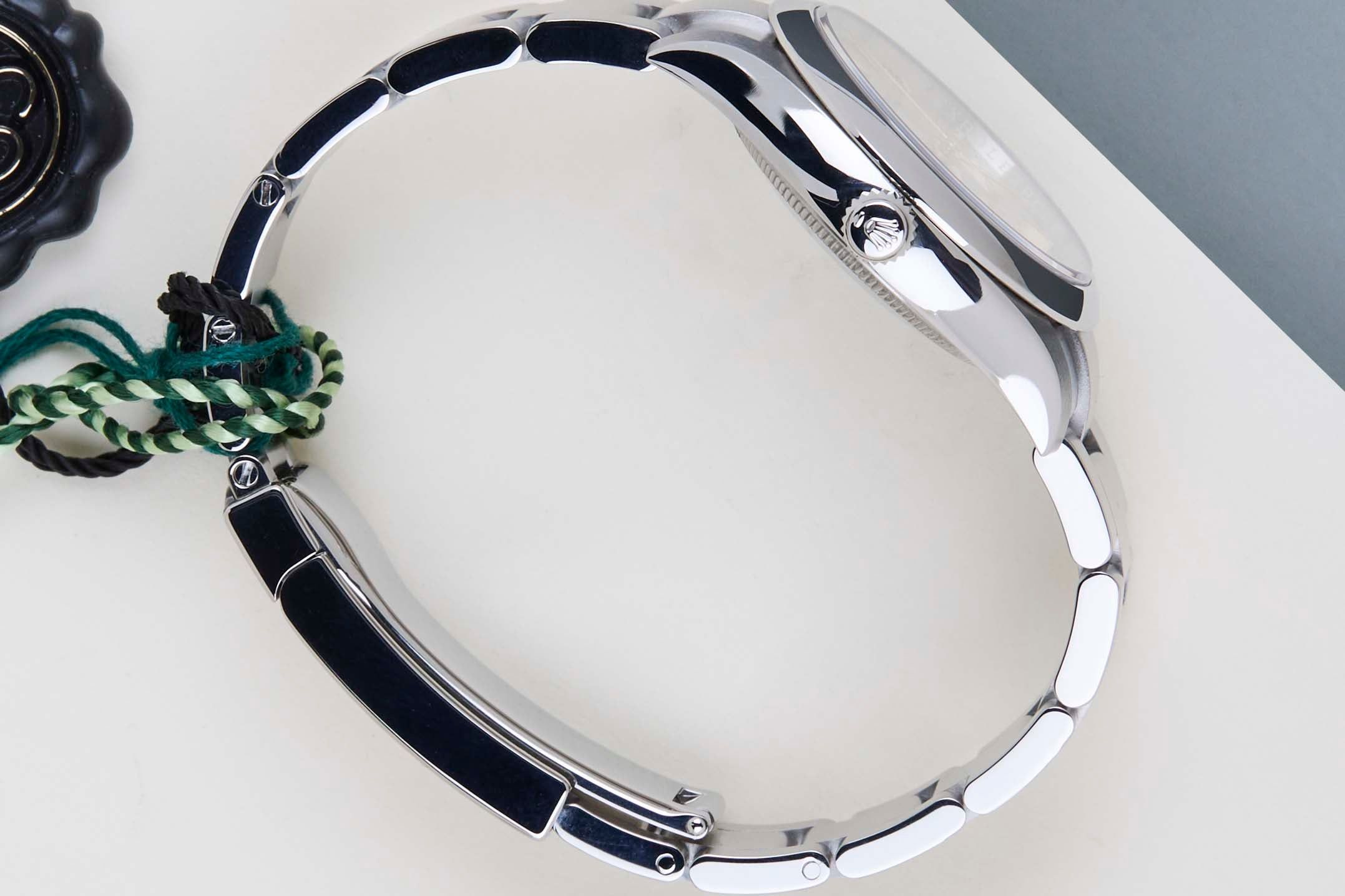 Deze Rolex Oyster Perpetual 34 is in Mint conditie en wordt geleverd met de originele Rolex Garantiekaart en doos. Bovendien heeft het horloge nog steeds Wereldwijde Rolex Garantie tot oktober 2026.