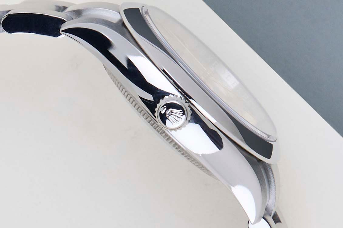 Het horloge is volledig gemaakt van roestvrij staal. Rolex gebruikt 904L in zijn stalen horloges, wat een extreem resistente en hoogglanzend superlegering is.