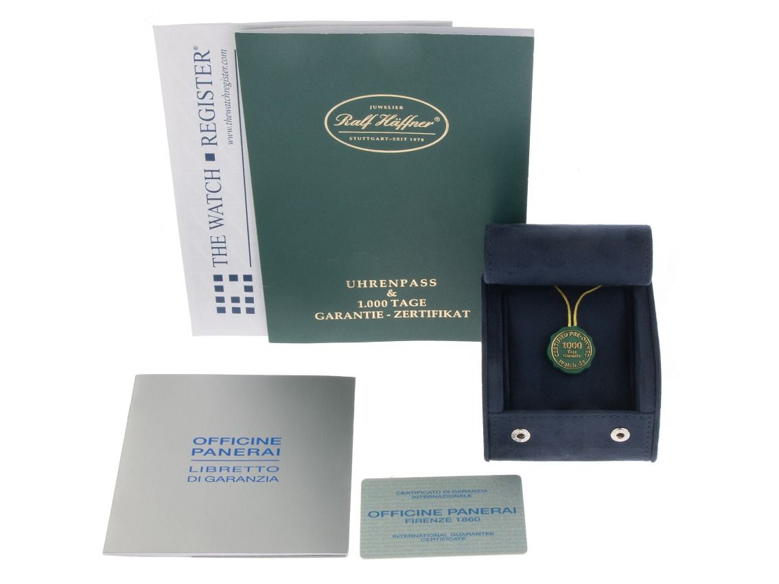 Gehäuse van satijn titanium, Gehäusediameter zonder kroon 42mm, Gehäusehoogte 15,8mm. Lünette van glad en satijn titanium. Armband van zwart leer met siernaad, Anstoßbreite 24mm, Doppelsicherheitsfaltschließe van titanium met fabrikantlogo. Wijzerplaat in geborsteld blauw met Arabische cijfers en indexen, evenals stalen wijzers. Uurwerk Automatisch, Panerai Manufakturkaliber 7750-P3 met 21 edelstenen. Weergave van uur en minuut via centrale wijzers, kleine seconde met seconde-stop voor nauwkeurige tijdinstelling om 9 uur, datumweergave met snelle aanpassing onder vergrootglas om 3 uur, gangreserve-indicator om 5 uur. Saffierglas krasbestendig en gebombardeerd. Kroon met gepatenteerde Panerai sluiting en beschermbeugel. Achterkant van staal, geschroefd en gegraveerd. Gewicht van het horloge inclusief armband 123g. Referentienummer: PAM00093, Gehäusenummer: OP6557BB1040XXX, ID: P233075300126H-7800, Artikelnummer: 10000084360. Met gangcontrole en volledige uiterlijke opfrissing van februari 2026. Originele Panerai doos en garantiepapieren van januari 2002, evenals uittreksel van het horlogeregister van januari 2026, The Watch Register certificaat / zonder vermelding (Internationale database voor verloren of gestolen horloges), Full Set. Superscherpe aanbieding, investering met waardevermeerderingspotentieel, zeer zeldzaam verzamelobject. Zeer goede staat. Leveringstijd onmiddellijk.