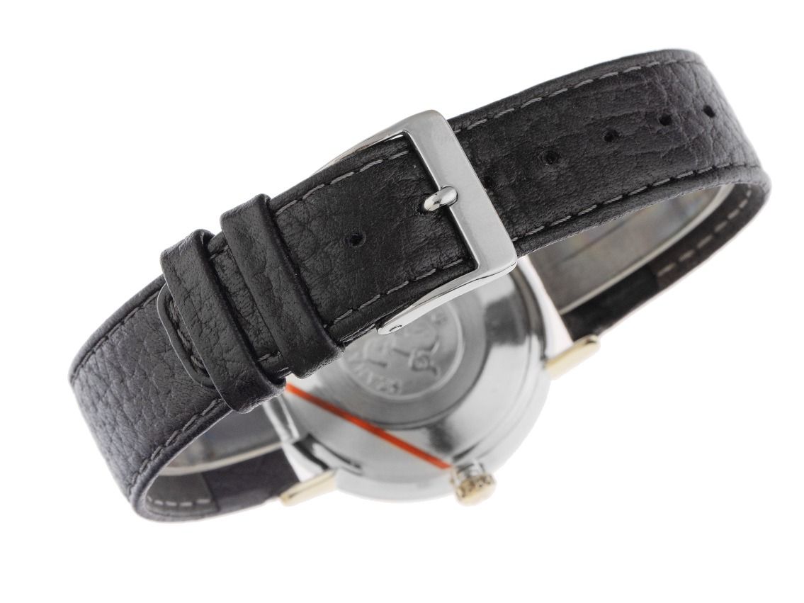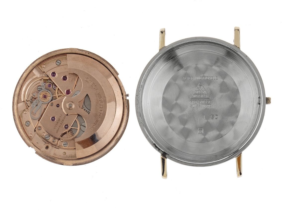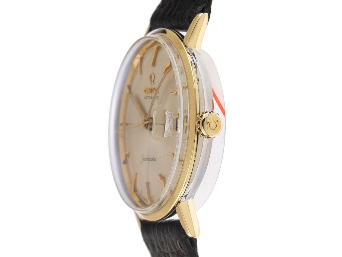 Behuizing van gepolijst roestvrij staal / verguld geelgoud, behuizingsdiameter zonder kroon 34mm, behuizingshoogte 11,0mm. Leren armband zwart met siernaad, aanzetbreedte 18mm, pin-buckle van roestvrij staal. Wijzerplaat zilverkleurig gepatineerd met opgezette geelgouden indexen en geelgouden wijzers. Uurwerk automatisch, Omega manufactuurkaliber 562 met 24 edelstenen. Weergave van uur, minuut en seconde via centrale wijzers, datumweergave onder vergrootglas bij 3 uur. Plexiglas. Kroon met fabrikantlogo. Achterkant van roestvrij staal gegraveerd. Gewicht van het horloge inclusief armband 36g. Referentienummer: 1473 0 1 SC (SC = second central / Centrale seconde), behuizingsnummer: 17448XXX, bouwjaar: 1959, ID: P233510220126H-2800, artikelnummer: 10000084369. Met nieuwe uurwerk revisie en volledige uiterlijke opfrissing van februari 2026. Originele Omega doos en Watchregister uittreksel van januari 2026, The Watch Register certificaat / zonder vermelding (Internationale database voor verloren of gestolen horloges). Superscherpe aanbieding, kapitaalinvestering met waardevermeerderingspotentieel, zeer zeldzaam verzamelobject. Zeer goede staat. Leveringstijd direct.