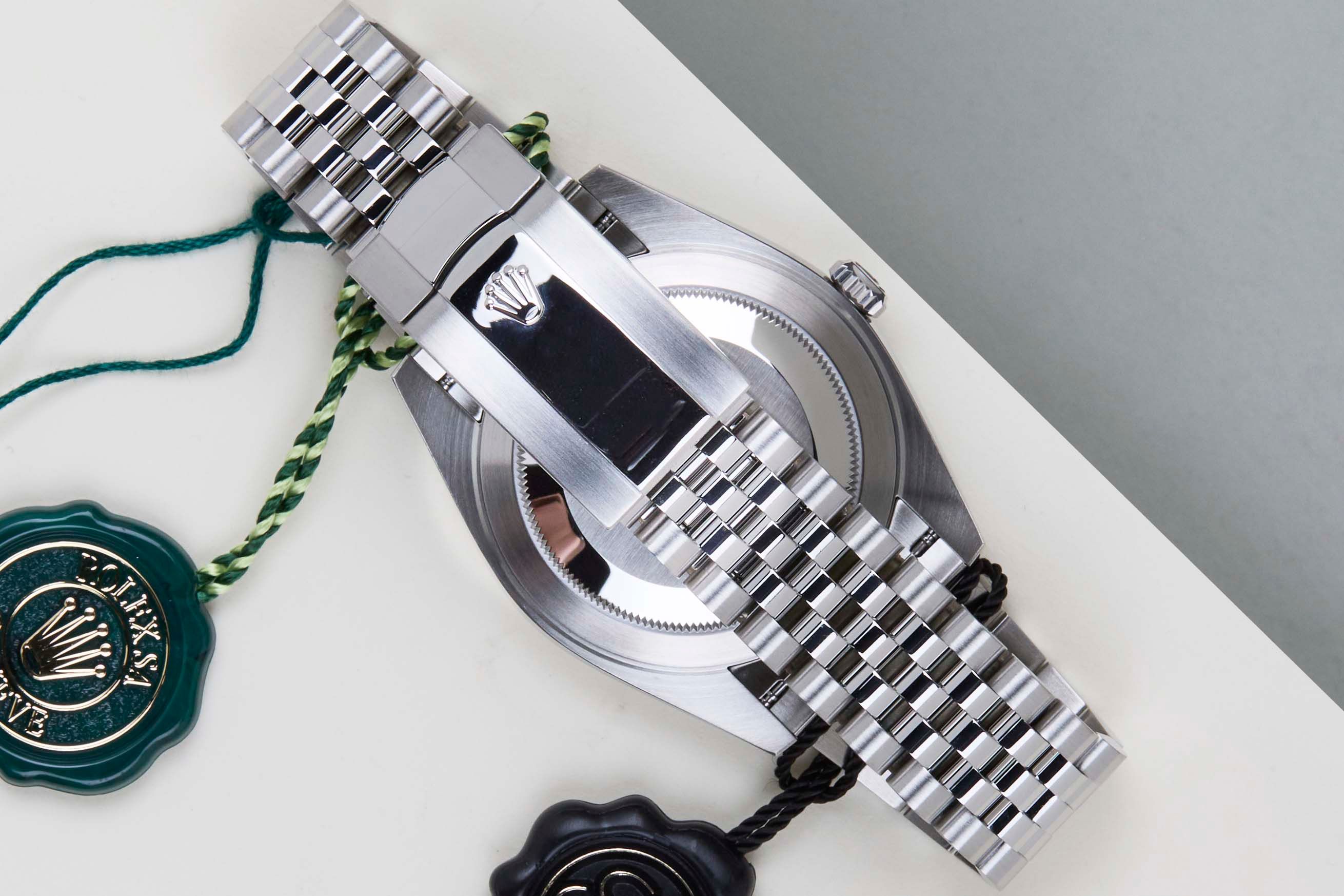 Deze Rolex Datejust 41 'Slate Dial - Jubilee' werd voor het eerst verkocht in juni 2023. Deze Datejust is gemaakt van roestvrij staal en is uitgerust met een Jubilee-armband, die voorzien is van de Easylink. Deze verlenging stelt de drager in staat om de armband met 5 millimeter te verlengen of te verkorten, wat het draagcomfort en de bruikbaarheid van het horloge verbetert.