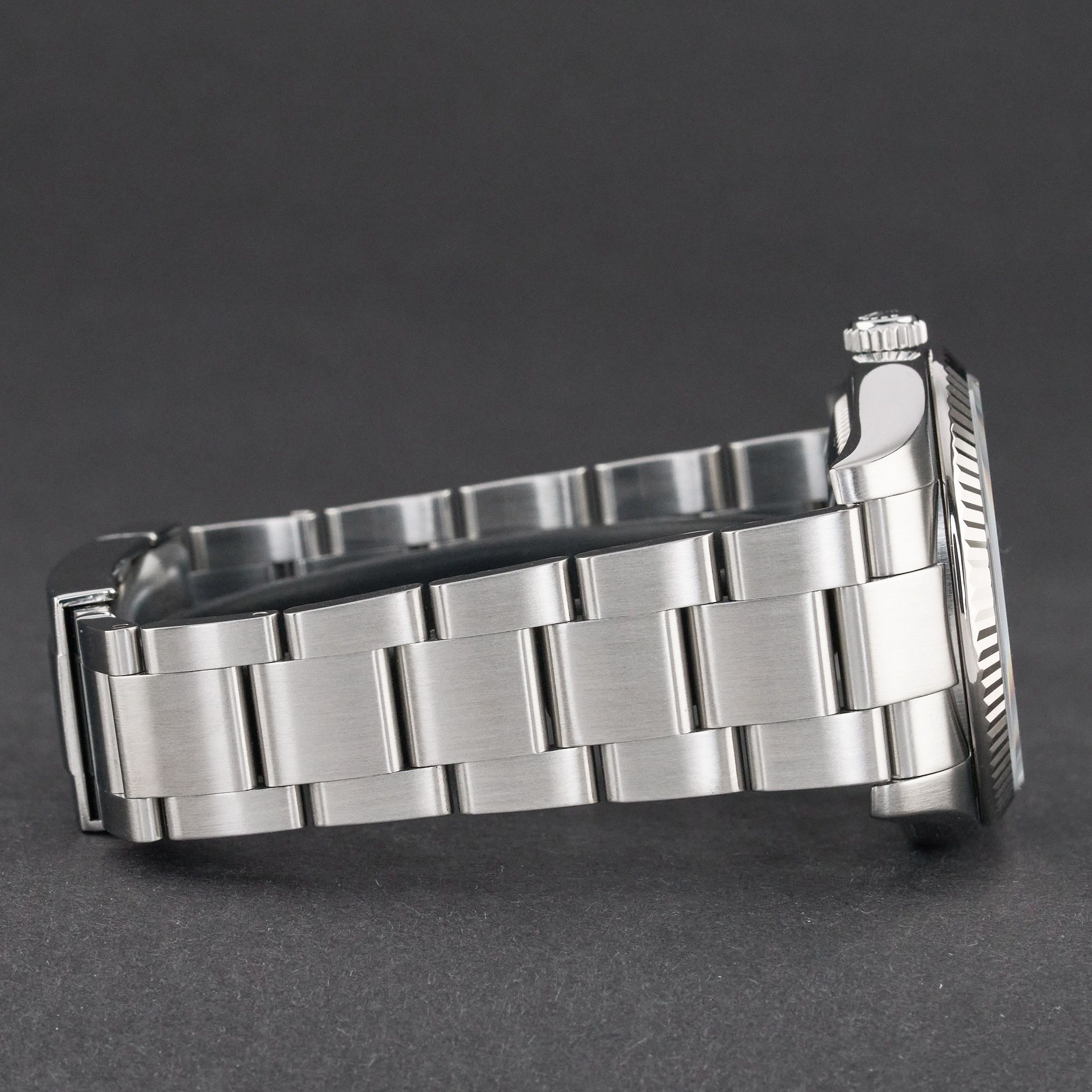 - Lichte gebruikssporen zoals haarlijntjes of kleine oppervlakkige krasjes. Kast, bezel en band behouden hun scherpe randen en oorspronkelijke vorm. Mogelijk professioneel gepolijst zonder de originele contouren aan te tasten. Mechanisch volledig functioneel.
