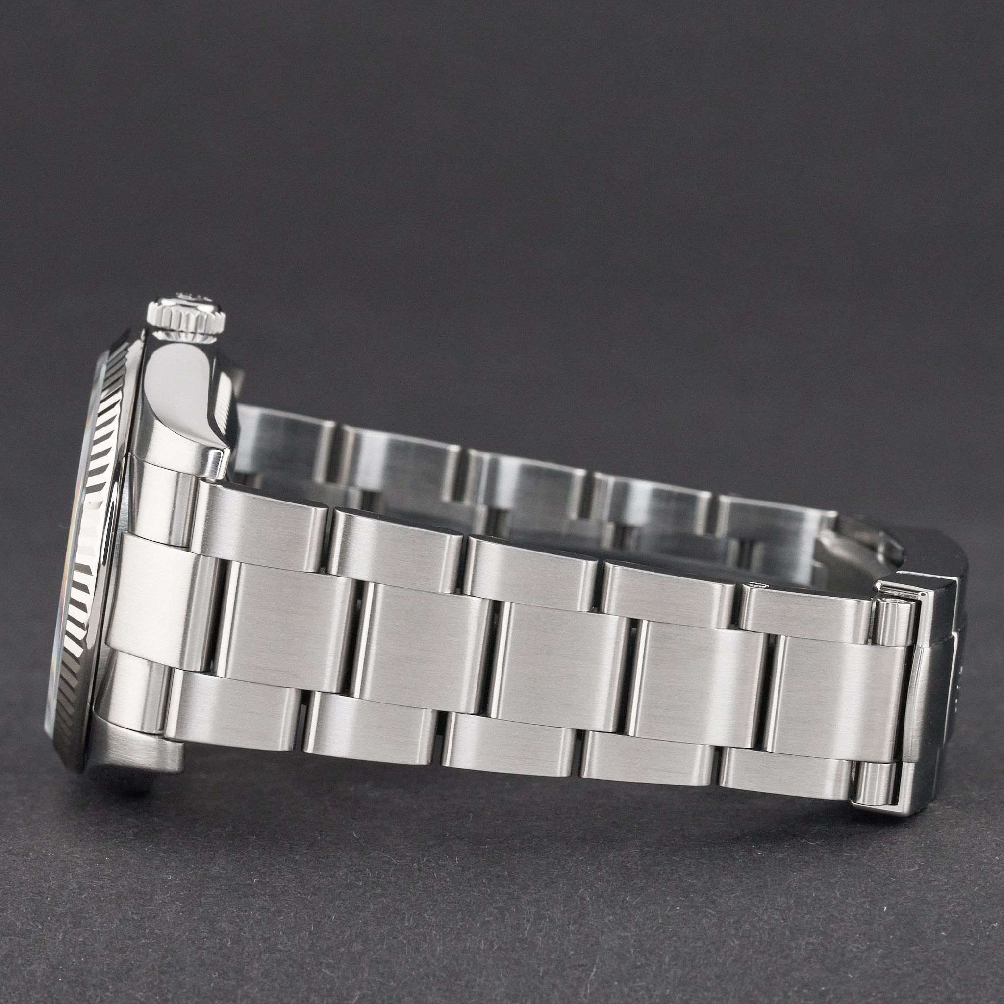 Deze Rolex Oyster Perpetual 116034 heeft een zwarte Arabische "Harley Davidson" wijzerplaat en is gemaakt van roestvrij staal, met een productiejaar van 2009.