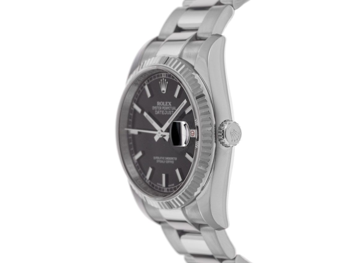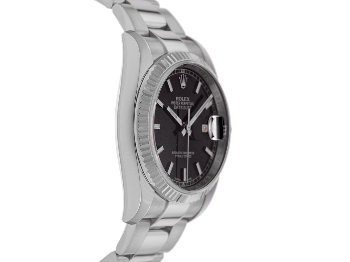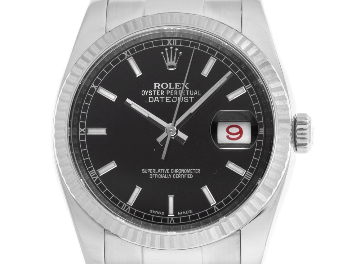 Gehuis van gepolijst en gesatineerd roestvrij staal, behuizingsdiameter zonder kroon 36mm, behuizingshoogte 11,6mm. Lunette van 18kt witgoud, geribbeld en gepolijst. Oyster armband van gepolijst en gesatineerd roestvrij staal, Rolex vouwsluiting van roestvrij staal met fabrikantlogo. Wijzerplaat zwart met opgezette witgouden indexen en witgouden wijzers. Automatisch uurwerk, chronometer met certificaat, Rolex manufakturkaliber 3135 met 31 edelstenen. Weergave van uur, minuut en seconde via centrale wijzers met seconde-stop voor nauwkeurige tijdinstelling, datumaanduiding in rood/zwart afwisselend met snelle instelling onder vergrootglas bij 3 uur. Saffierglas krasbestendig. Schroefkroon met fabrikantlogo. Achterkant van roestvrij staal, geschroefd. Gewicht van de horloge inclusief armband 120g, lengte van de armband inclusief behuizing 170mm. Referentienummer: 116234, behuizingsnummer: 330M8XXX, ID: P2495150000226H-11800, artikelnummer: 10000084755. Met gangcontrole en volledige uiterlijke opfrissing van februari 2026. Originele Rolex doos met omdoos en garantiepapieren van november 2017, LC 100 Duitsland EU evenals beschrijving, leren etui, Rolex chronometerzegel, dag- en horregister uittreksel van februari 2026, The Watch Register certificaat / zonder vermelding (Internationale database voor verloren of gestolen horloges), Full Set. Superscherpe aanbieding, investering met waardevermeerderingspotentieel. Als nieuw. Leveringstijd direct.
