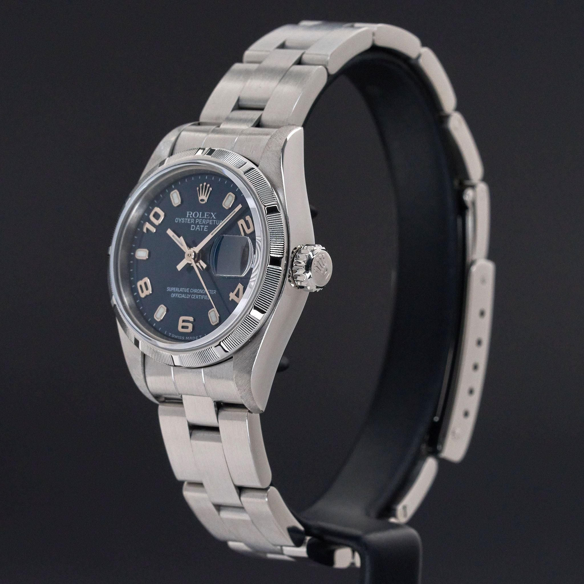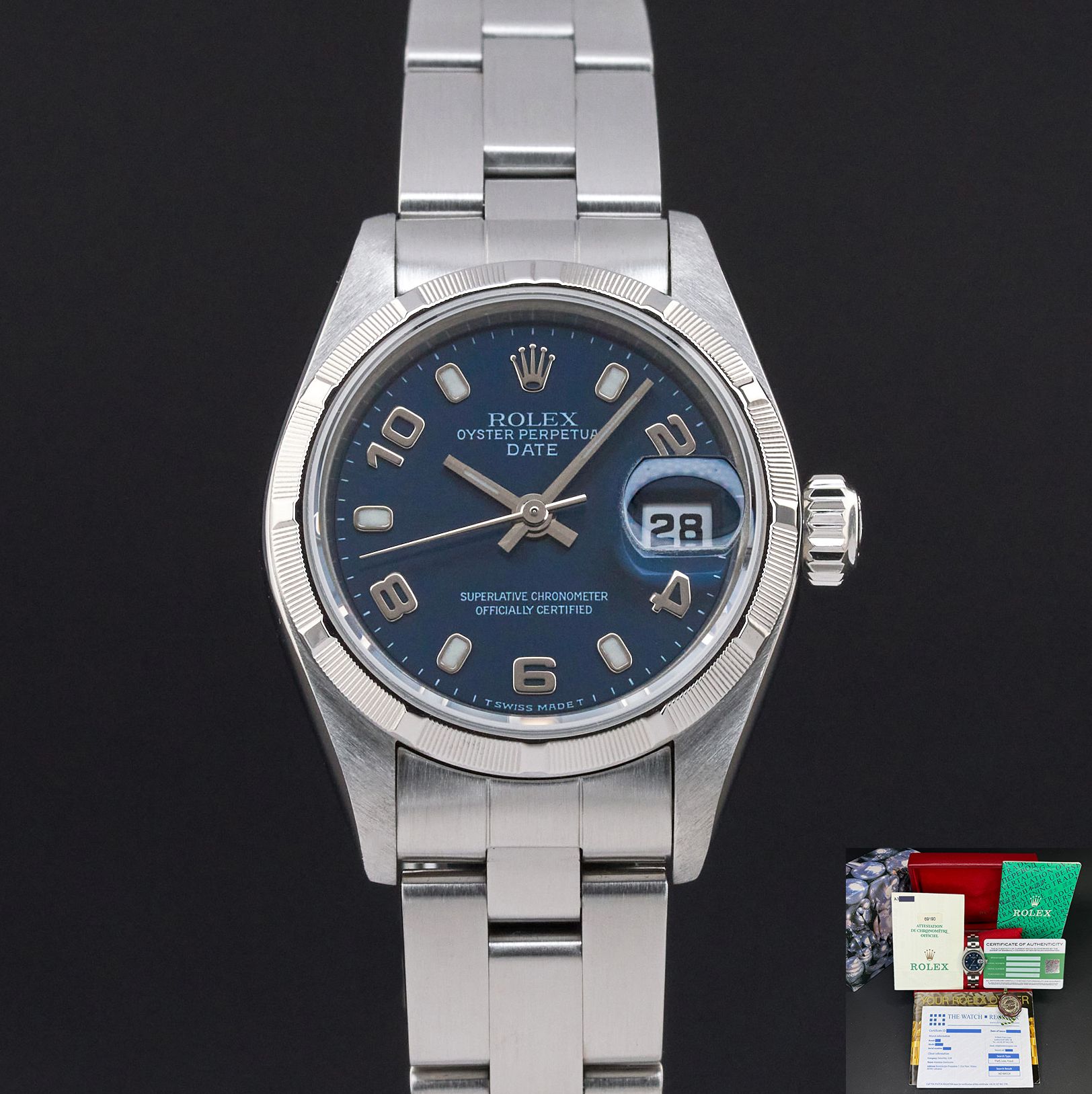This Rolex Oyster Perpetual Lady Date 69190 features a Blue Arabic dial and is crafted from stainless steel, with a production year of 1999.Case No: A38XXXX