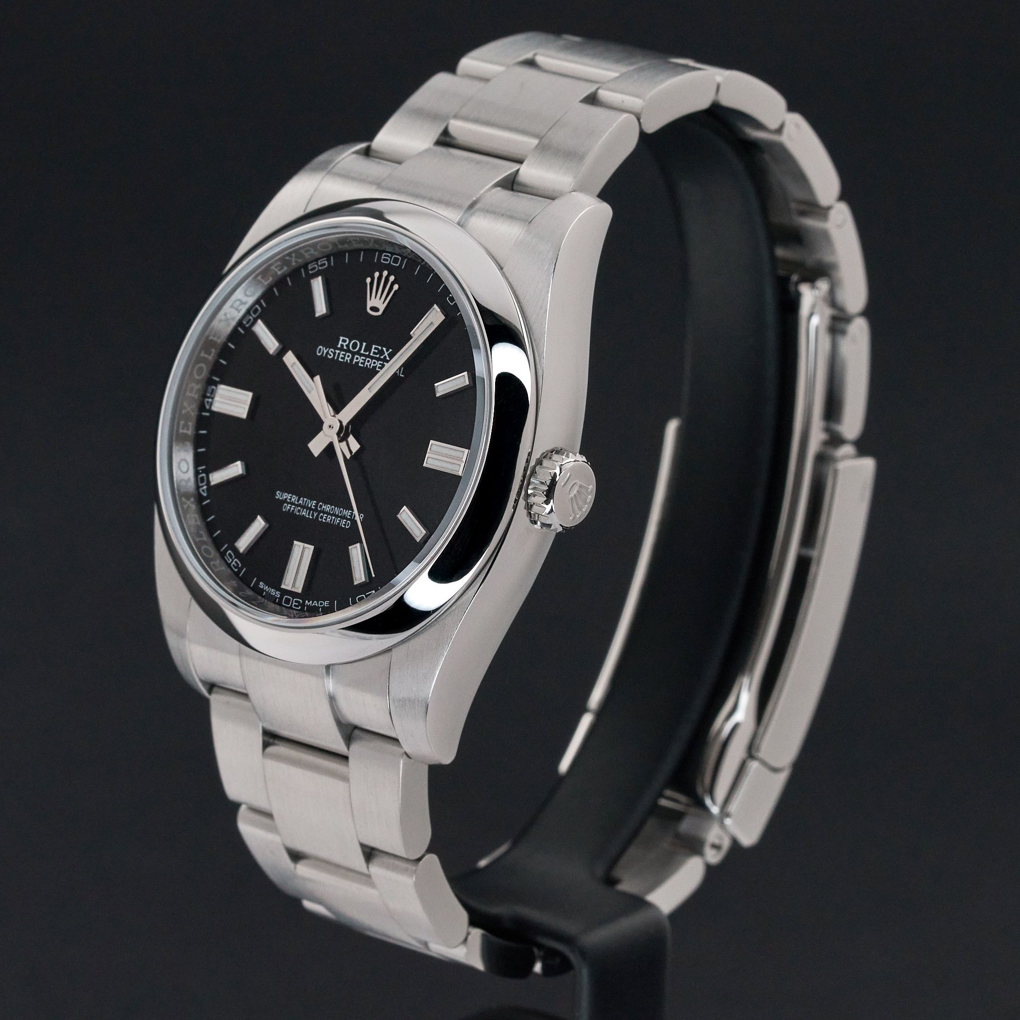 Deze Rolex Oyster Perpetual 116000 heeft een zwarte wijzerplaat en is gemaakt van roestvrij staal, met een productiejaar van 2018.