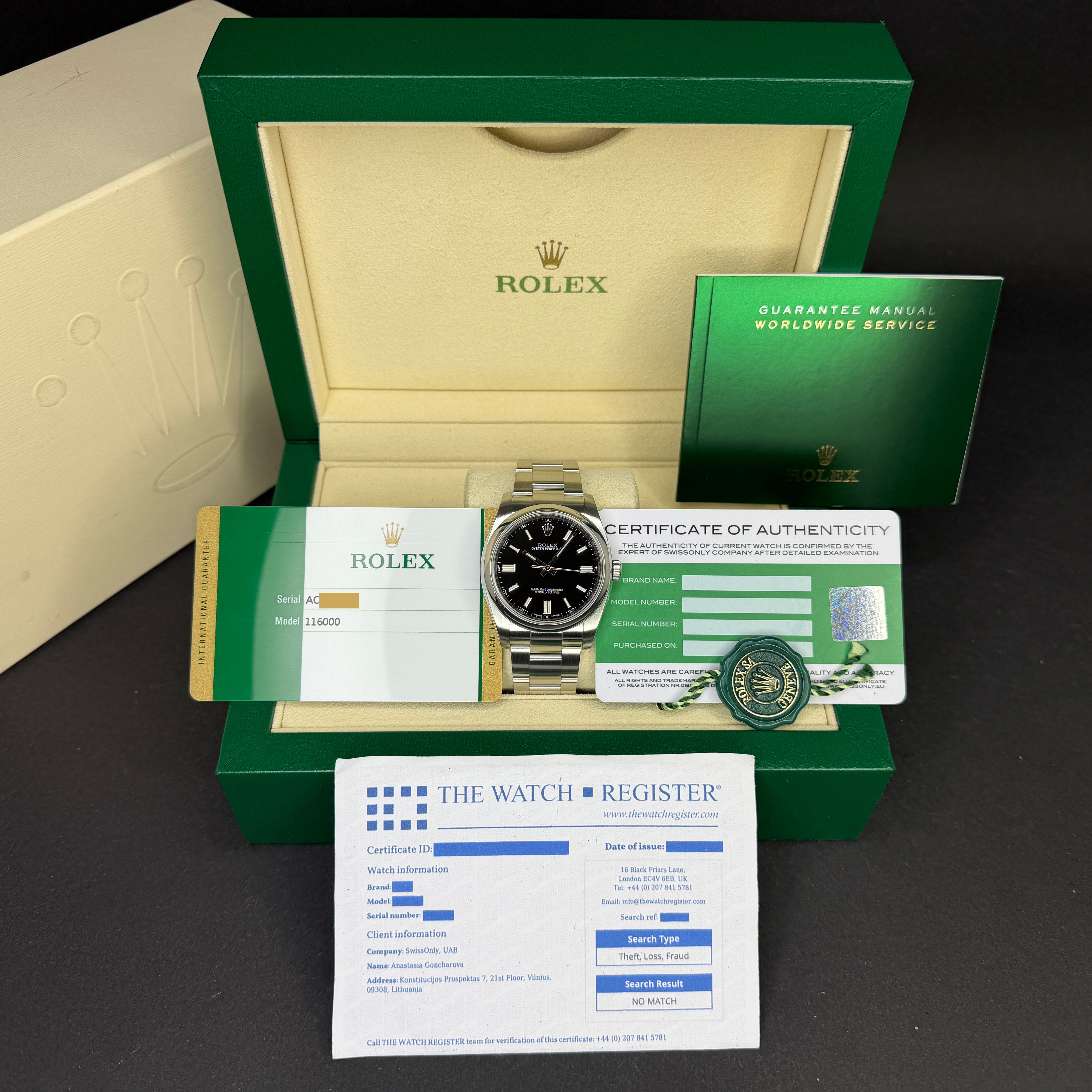 This Rolex Oyster Perpetual 116000 features a Black dial and is crafted from stainless steel, with a production year of 2018.Case No: AC05XXXXX