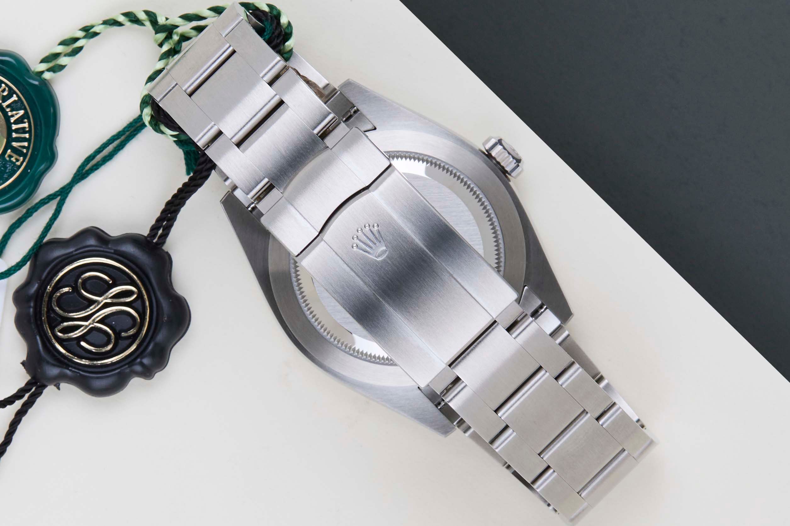 Het horloge is volledig gemaakt van roestvrij staal. Rolex gebruikt 904L in zijn stalen horloges, wat een extreem resistente en hoogglanzende superlegering is.