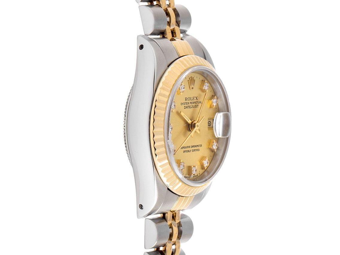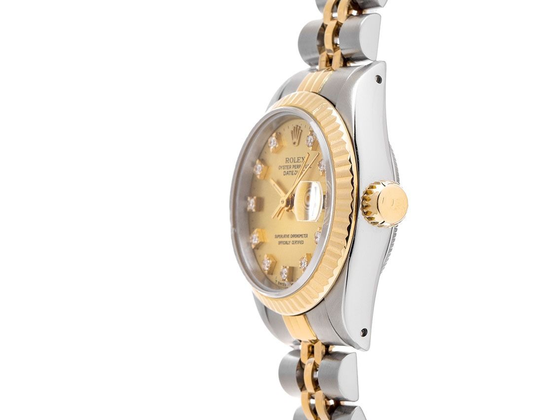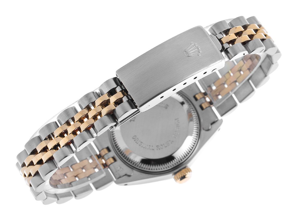 Kast van gepolijst en satijn afgewerkt staal, kastdiameter zonder kroon 26mm, kasthoogte 10,4mm. Lünette van 18kt geelgoud, geribbeld en gepolijst. Jubileearmband van gepolijst en satijn afgewerkt staal / 18kt geelgoud, vouwsluiting van staal met fabrikantlogo. Wijzerplaat in champagnekleur met opgezette diamantindexen en geelgouden wijzers. Automatisch uurwerk, chronometer, Rolex Manufakturkaliber 2135 met 29 edelstenen. Weergave van uur, minuut en seconde via centrale wijzers met seconde-stop voor nauwkeurige tijdinstelling, datumaanduiding met snelle instelling onder vergrootglas bij 3 uur. Krasbestendig saffierglas. Schroefkroon met fabrikantlogo. Achterkant van staal, geschroefd en gegraveerd. Gewicht van de klok inclusief armband 54g, lengte van de armband inclusief kast 170mm. Referentienummer: 69173, kastnummer: L519XXX, bouwjaar: 1988, ID: P250986000226H-8900, artikelnummer: 10000084786. Met gangcontrole en volledige uiterlijke opfrissing van februari 2026. Originele Rolex doos met omdoos en garantiepapieren van maart 1990, evenals beschrijving, leren etui, vertaalboekje, Rolex chronometerzegel, dag, factuur van revisie uit 2019, Rolex servicekaart van december 2019 en Watchregister uittreksel van februari 2026, The Watch Register certificaat / zonder vermelding (Internationale database voor verloren of gestolen horloges), Full Set. Superscherpe aanbieding, investering met waardevermeerderingspotentieel, zeer zeldzaam verzamelobject. Zeer goede staat. Leveringstijd direct.