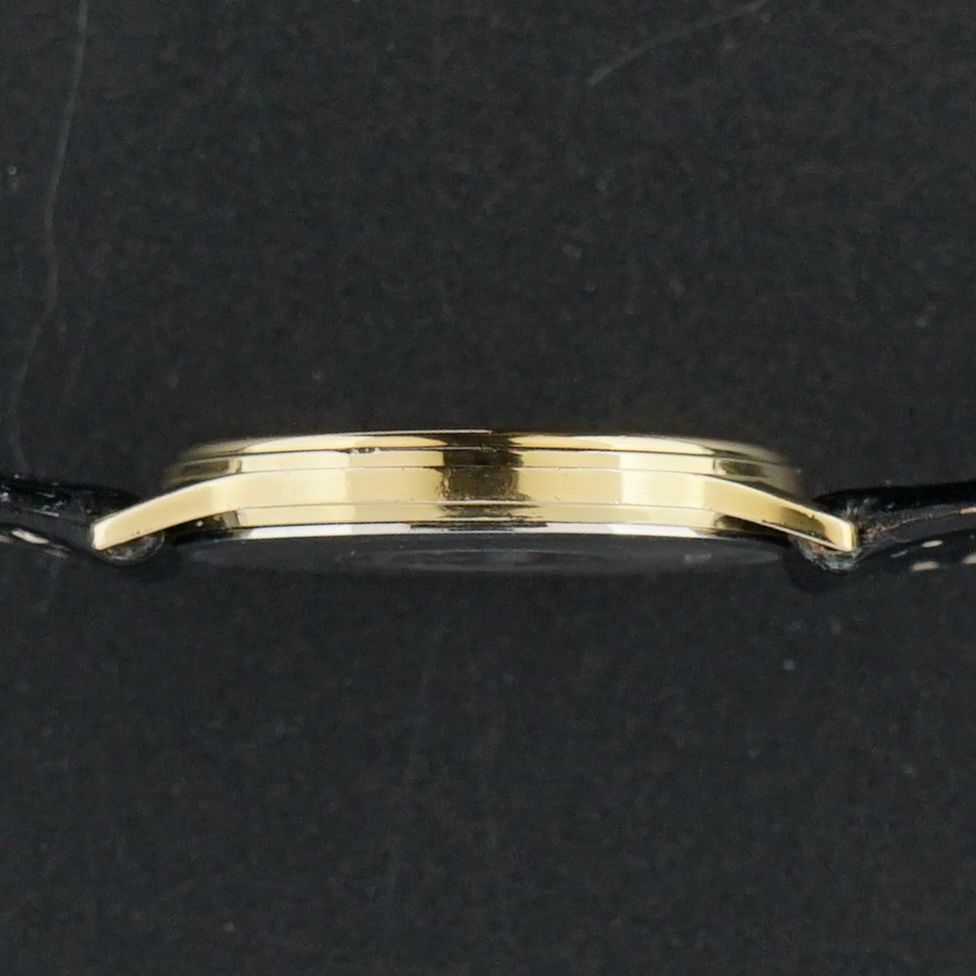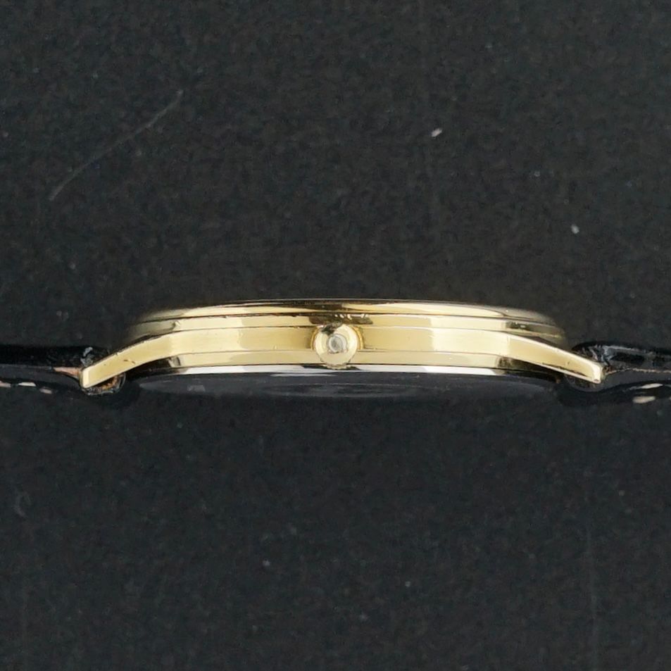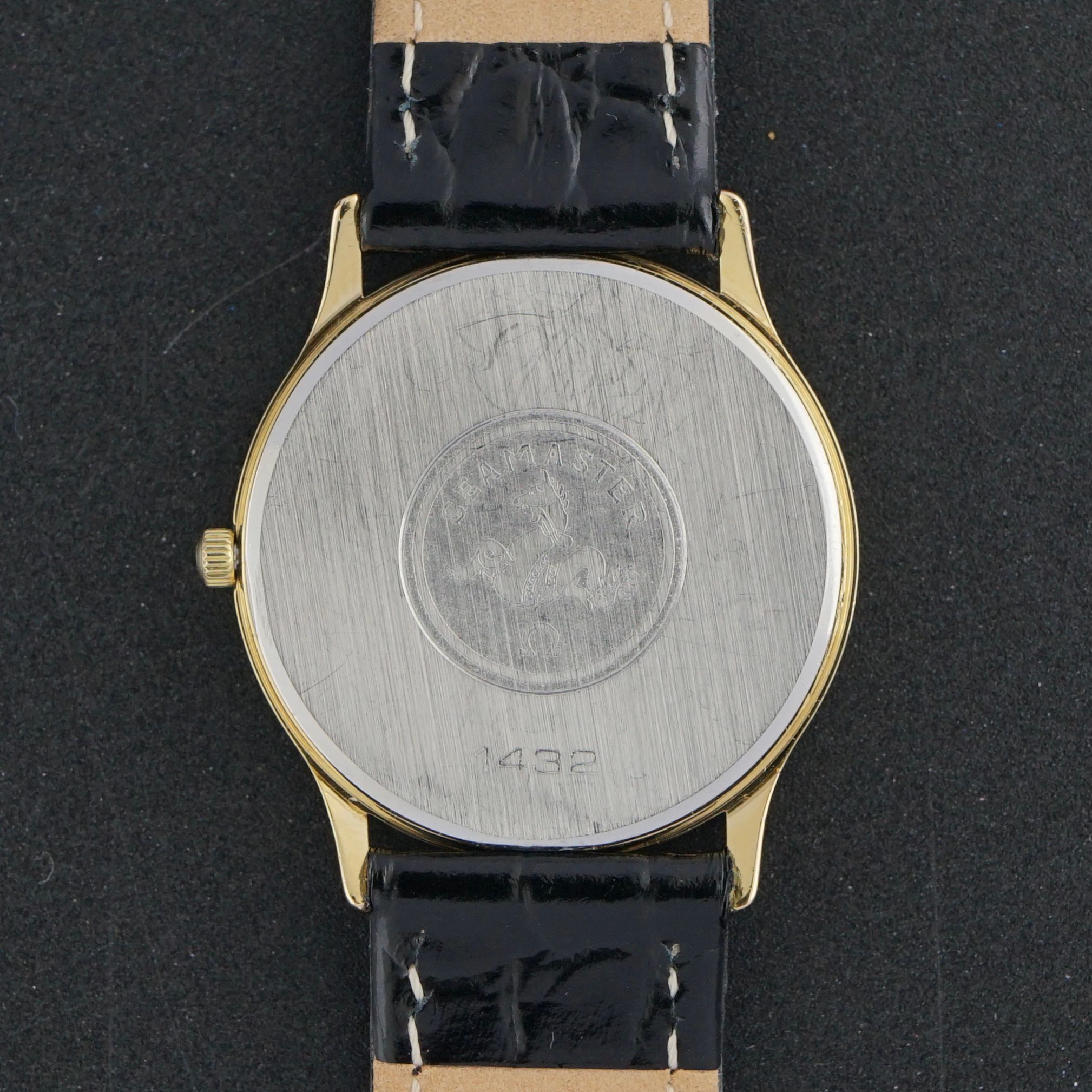 Vintage Omega Seamaster Quartz produced in 1982. This piece features a beautiful white dial with Roman numerals at 12, 6 and 9 o’clock, and a date window at 3 o’clock. The crisp white dial contrasts elegantly with the golden accents and the gold plated case, giving the watch a subtle and refined vintage dress watch appearance.The case measures 32mm in width and is only 5.4mm thin, making it exceptionally sleek and comfortable on the wrist. We have fitted the watch with a black leather strap with crocodile motif, complementing its classic character perfectly.